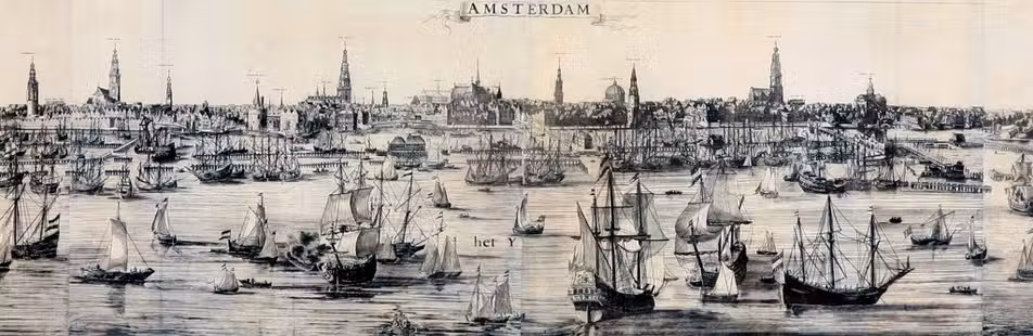 Large view of ships and boats in the IJ inlet, with Amsterdam in the background, with Tsar Peter the Great of Russia viewing the ship he helped build