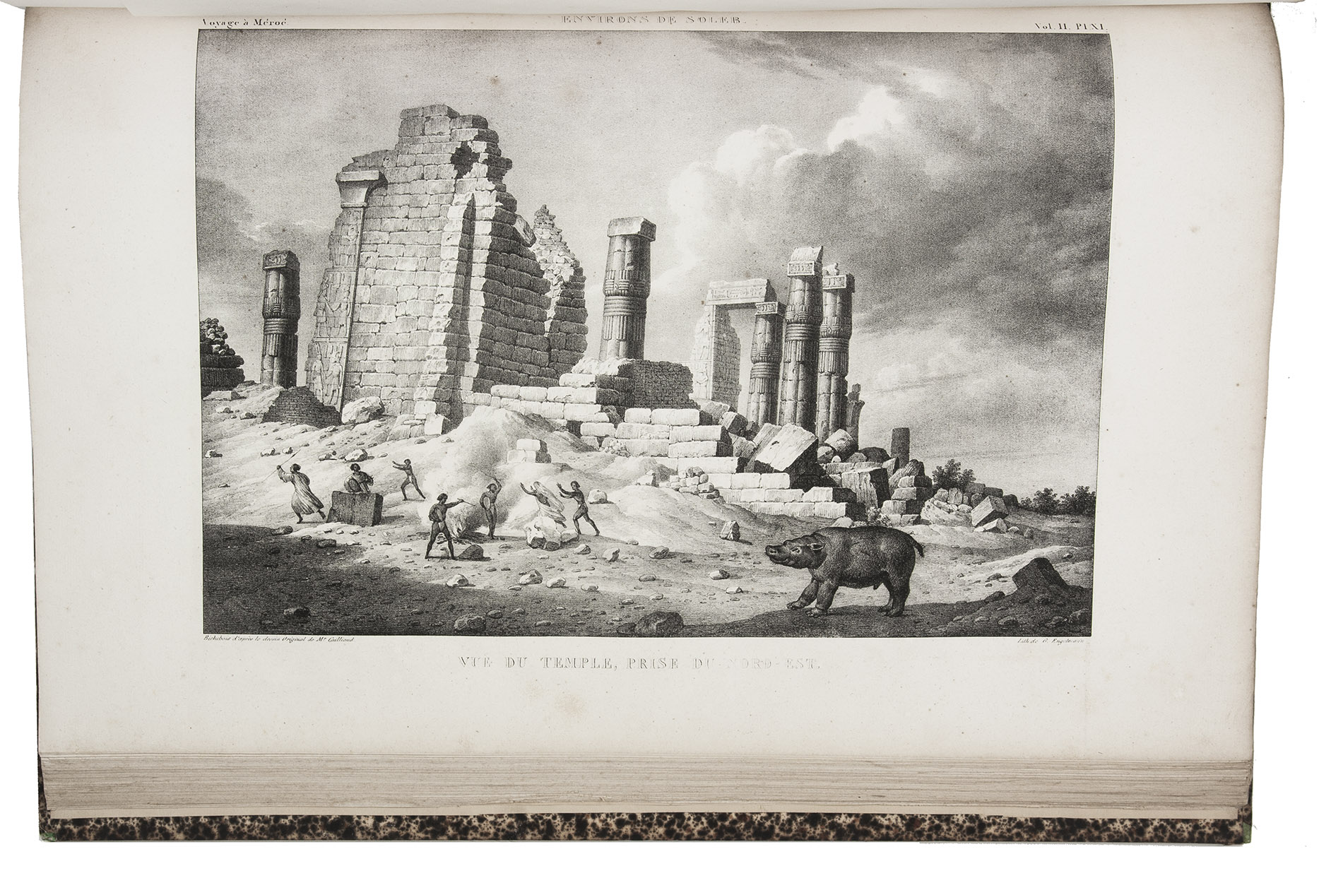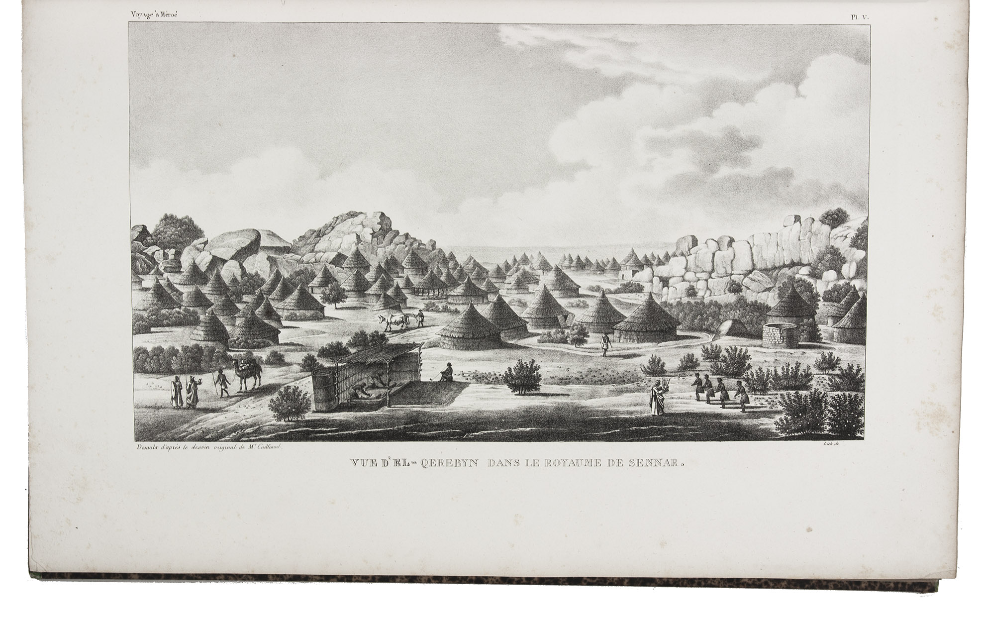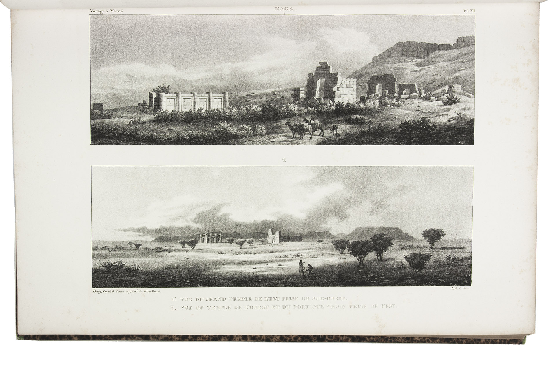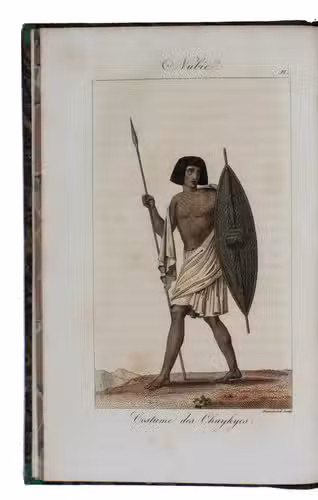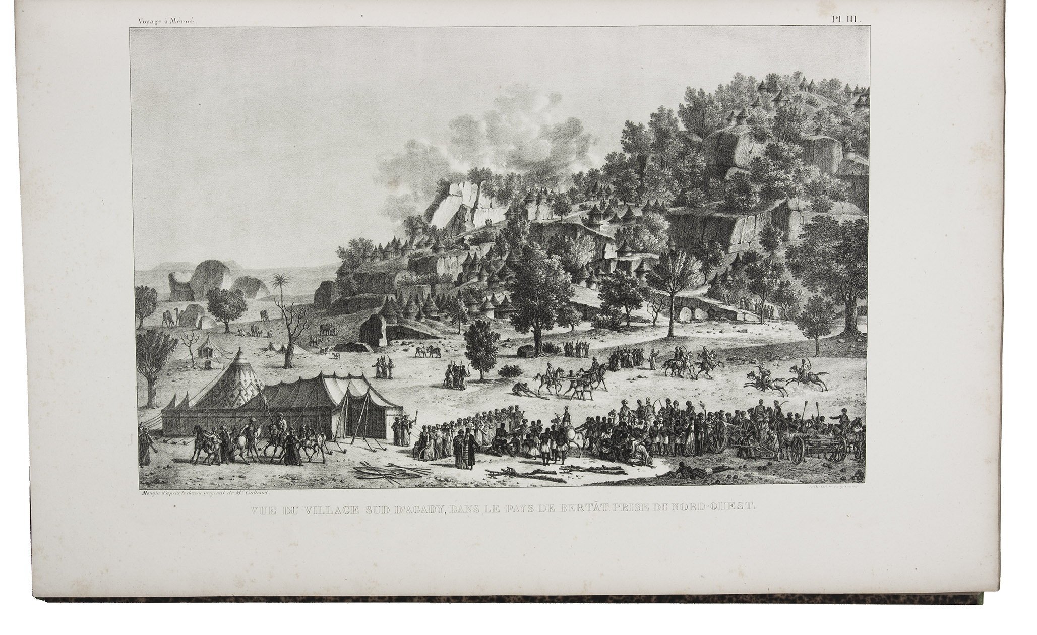 First edition of Cailliaud's narrative of his second journey through Egypt, Ethiopia and Nubia (Sudan), "still today an inestimable source of documentation. Caill[i]aud discovered the pyramids of Bergrawiya (Meroe) in 1821 and published the first detailed map of Nubia" (Bardeschi). He first travelled to the oasis of Siwa, where he got word that in Cairo Ismail Pasha was preparing a punitive expedition to Nubia. Cailliaud promptly proceeded to Cairo, where he joined Ismail's party. In Nubia he explored the famous ruins of the ancient city of Meroë and then travelled by boat to Sennar. Proceeding further south along the Blue Nile, the expedition reached Fazogl, near the Ethiopian border, where Cailliaud searched for gold mines. The party returned to Sennar, where Ismail received a message from his father demanding his return to Egypt.