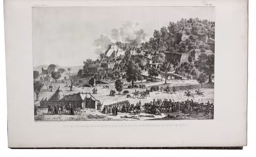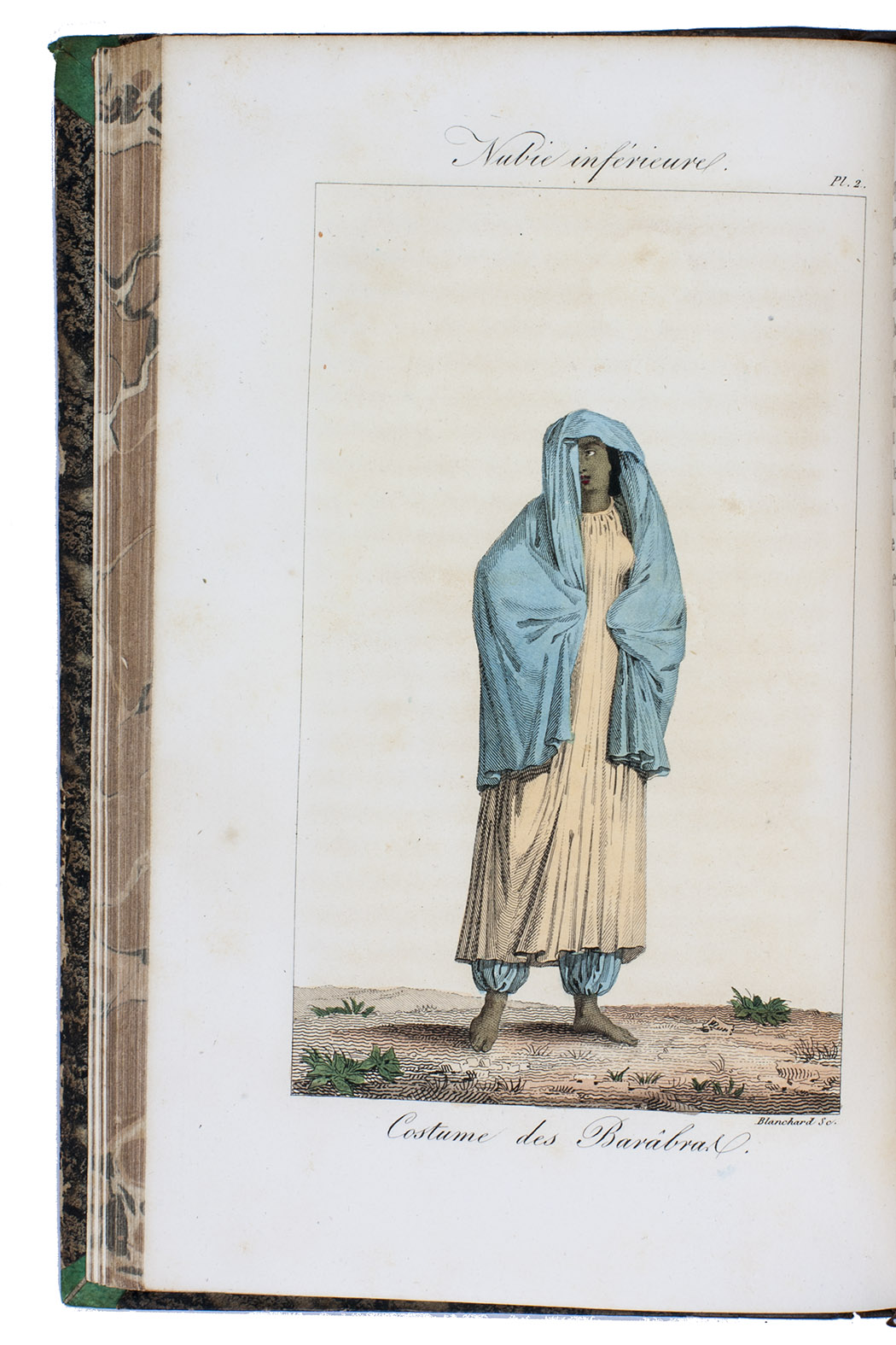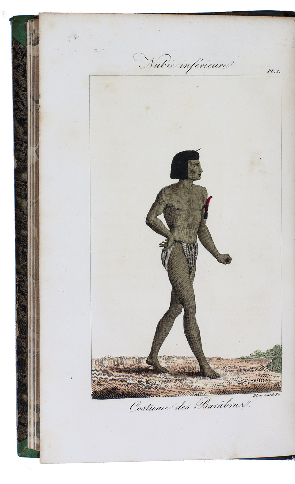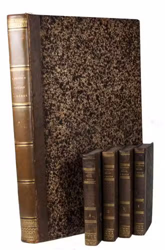 Paris, Debure, Tillard and Treuttel & Wurtz, 1826-1827. 4 text volumes (8vo) and 1 atlas volume in 2 parts (folio). With a woodcut vignette on the title pages, 12 full-page hand-coloured costume plates, and 150 full-page lithographs in the atlas volume. Contemporary half calf, gold- and blind-tooled spine, marbled edges. [4], XV, [1], 429 pp; [4], 442 pp; [4], 431, [1] pp; [4], 416 pp; [32], [150], [20], [150] pp.