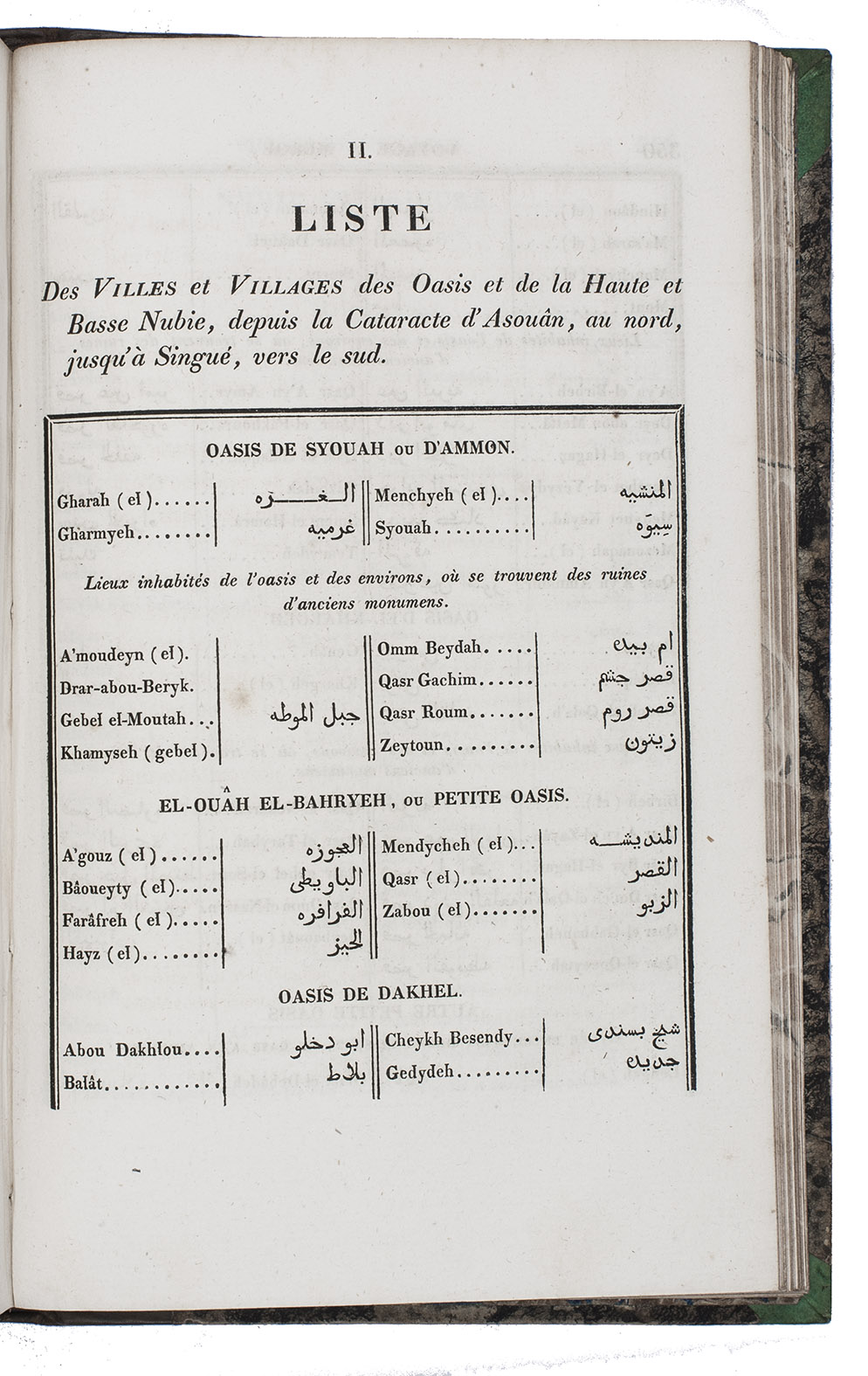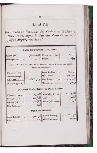 Cailliaud's narrative includes vocabularies of the languages spoken in Syouah, Qamâmyl and Dongolah, a list of towns in French and Arabic, a translation and explanation of Greek inscriptions, an extensive description of a mummy, descriptions of Egyptian painting, tables with meteorological observations and descriptions of objects of natural history.