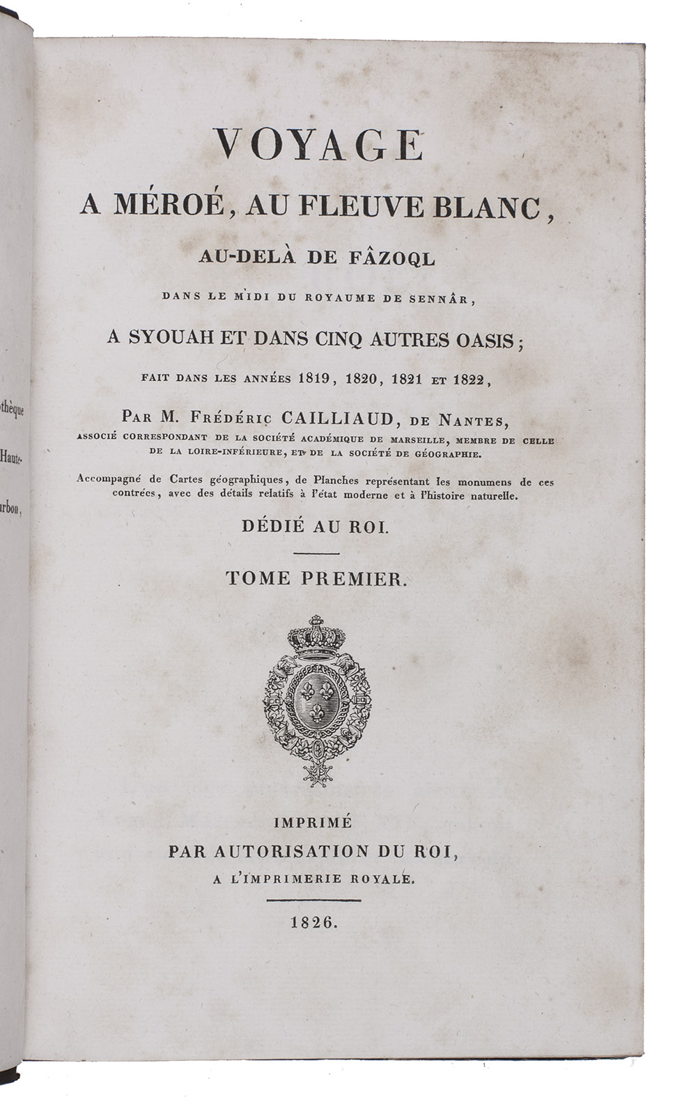 Voyage a Méroé, au fleuve blanc, au-delà de fâzoql dans le midi du royaume de Sennâr, a Syouah et dans cinq autres oasis; fait dans les années 1819, 1820, 1821 et 1822, ... Dédié au roi.