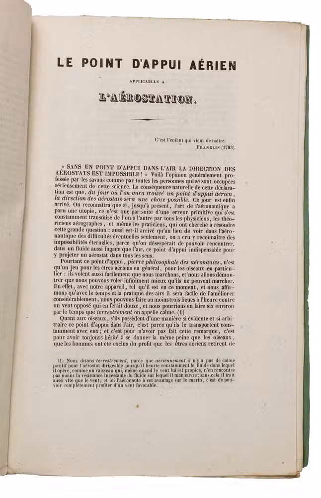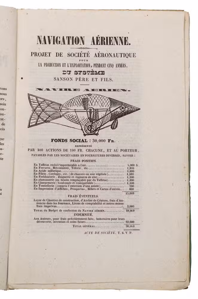 First edition of this very rare, early, and remarkable brochure on navigation in the air and the dirigible (manoeuvrable balloon). The brochure introduces a new project to build a dirigible in the shape of a fish. The cost was estimated at 30.000 francs and was to be financed by the issue of 300 shares of 100 francs. The work explains the expected profits, and the workings of the dirigible, in order to entice patrons. It is an early example of such a project, as the first powered and steerable airship that was able to take flight was invented in 1852, eleven years after the publication of the present work. This curious brochure therefore offers a fascinating insight into the history of aviation.