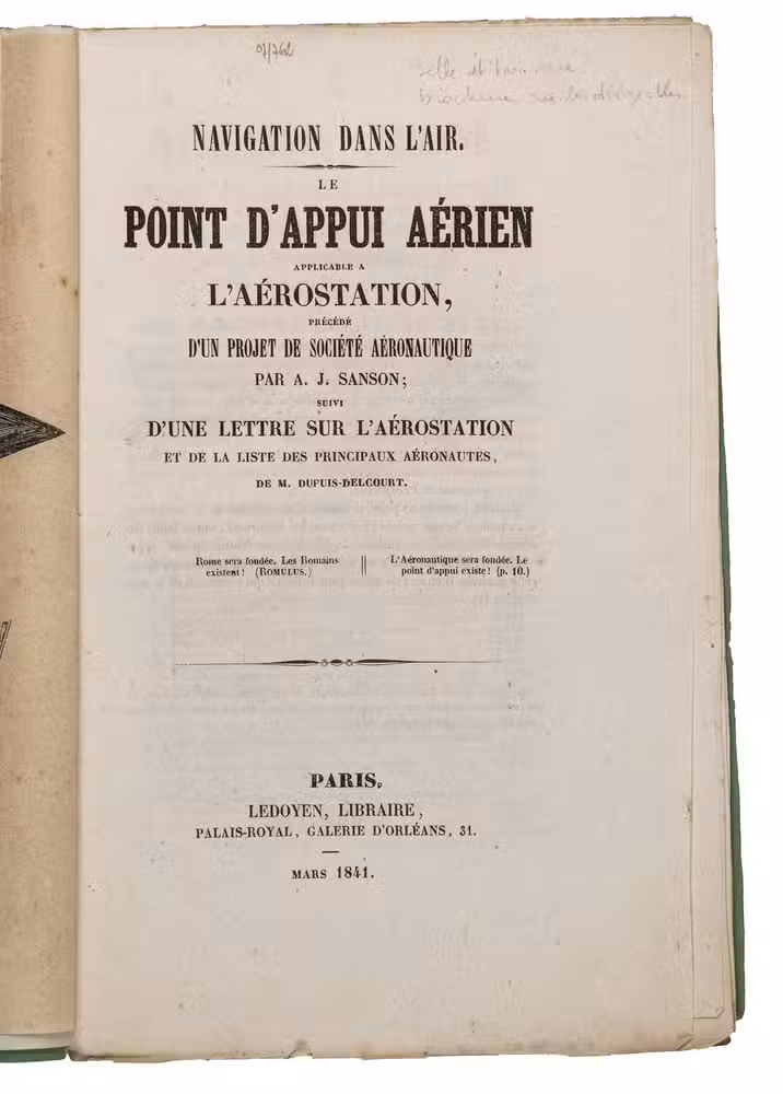 Navigation dans l'air. Le point d'appui aérien applicable a l'aérostation, précédé d'un projet de société aéronautique ... suivi d'une lettre sur l'aérostation et de la liste des principeaux aéronautes, de M. Dupuis-Delcourt.