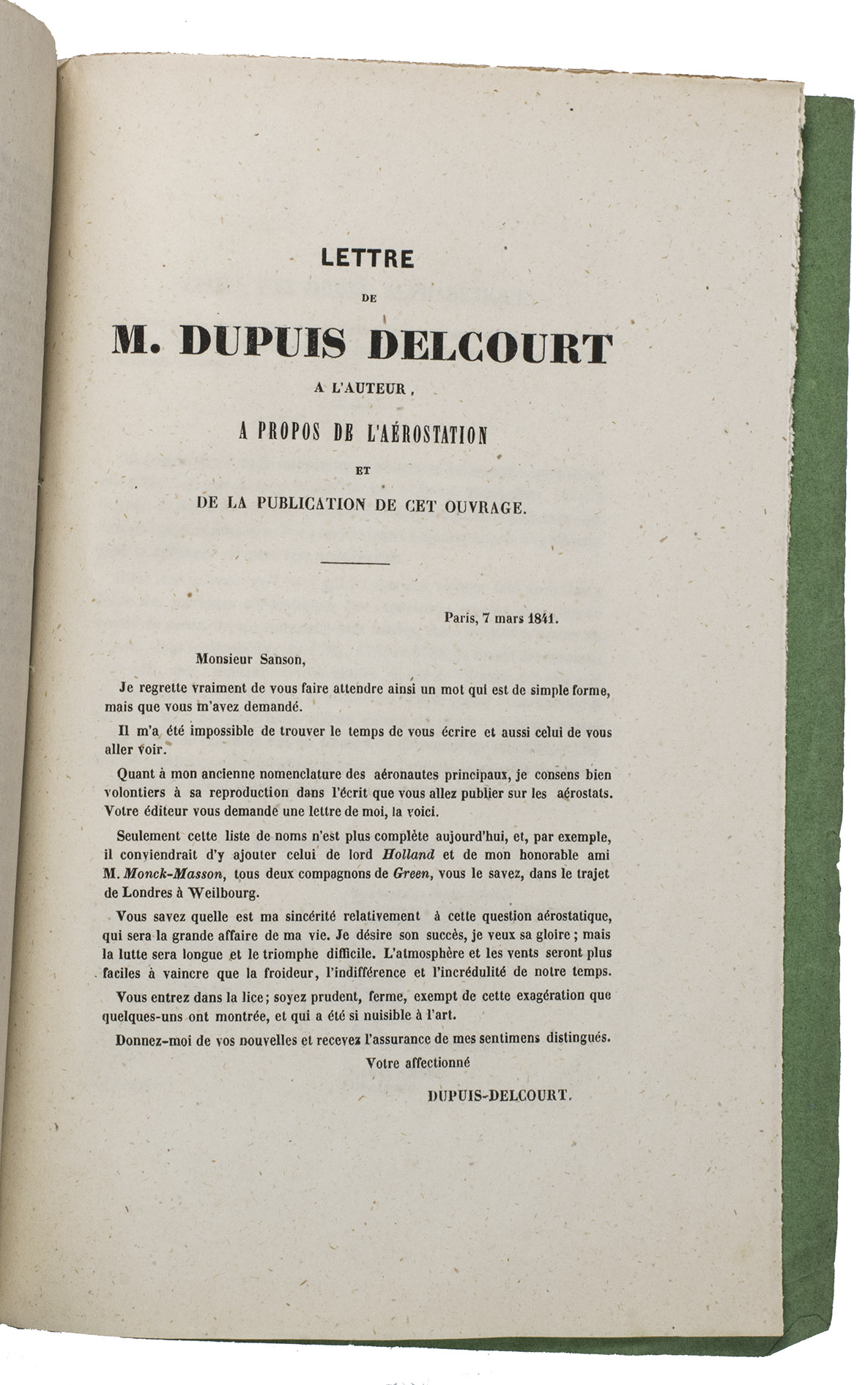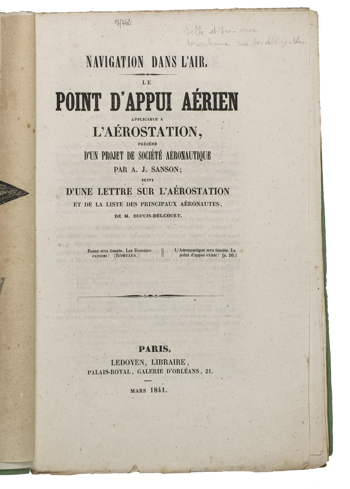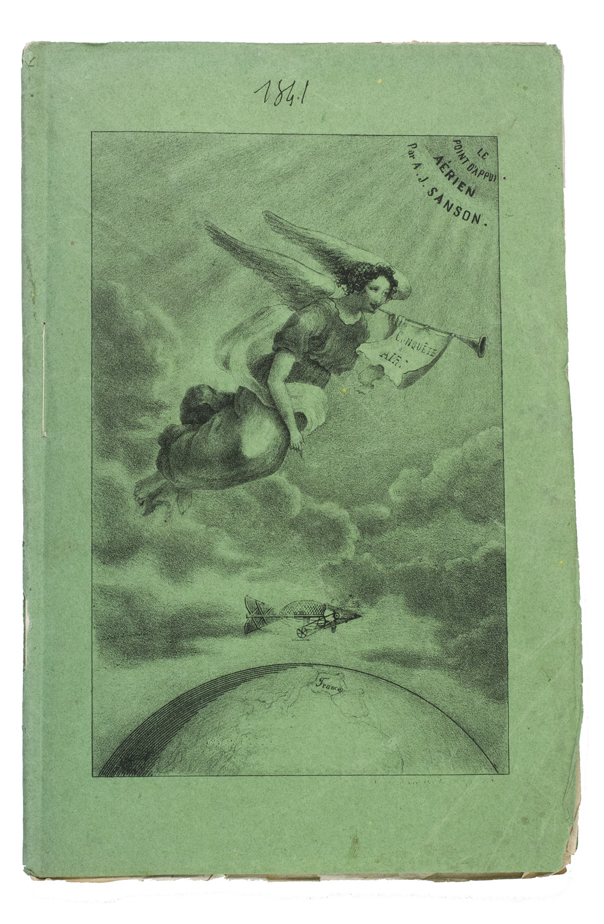 Paris, De Boulé et Comp., for Ledoyen March 1841. 8vo. With a large folding lithographed plate (40 x 23,5 cm) of the dirigible, and a smaller woodcut of the same dirigible on p. 5. Original green wrappers in a protective plastic wrapper, with a large lithographed plate on the front, showing a dirigible flying over the globe underneath a floating angel, who is blowing a trumpet with the motto "Conquête de l'aire". 31, [1 blank] pp.