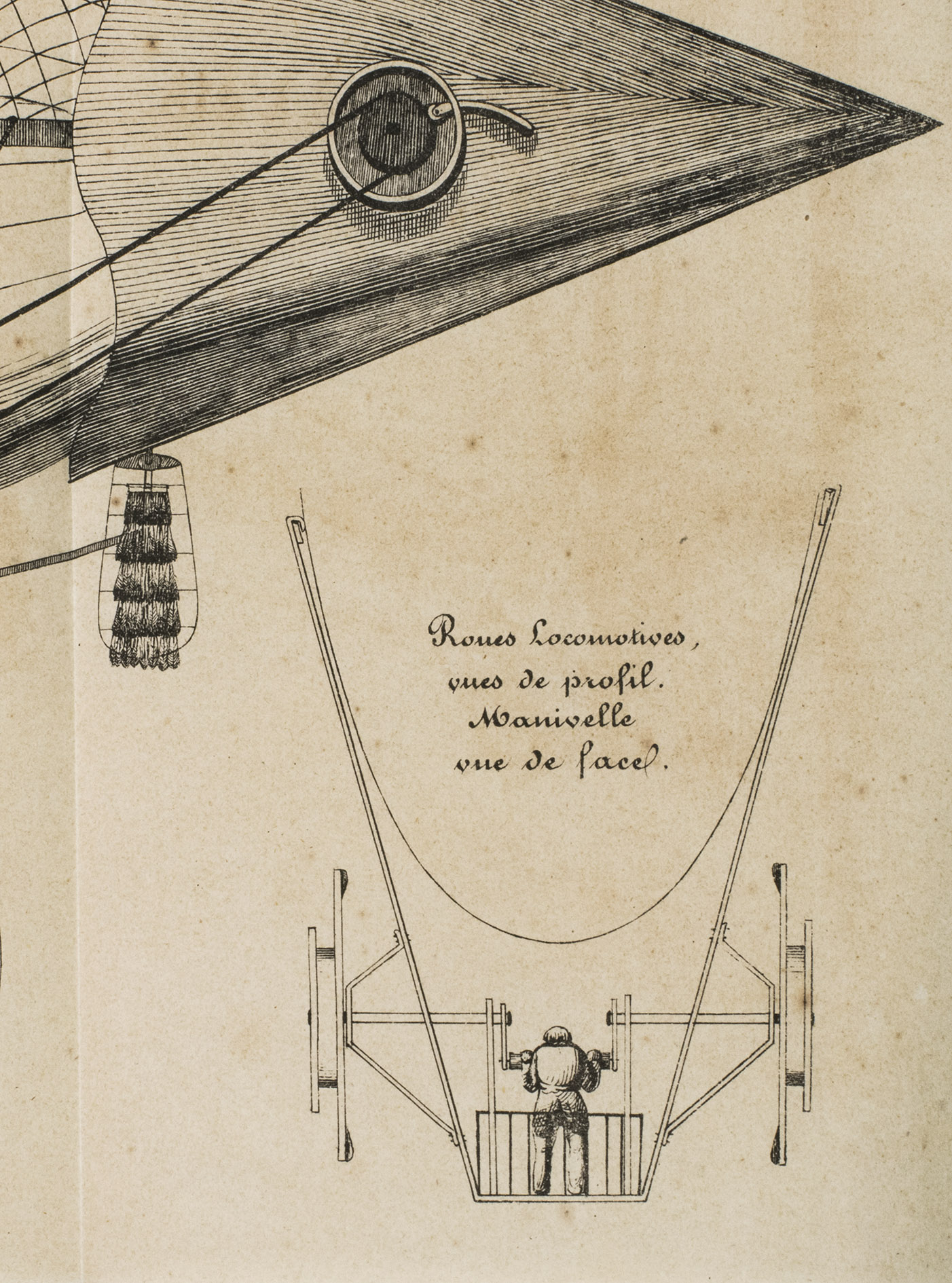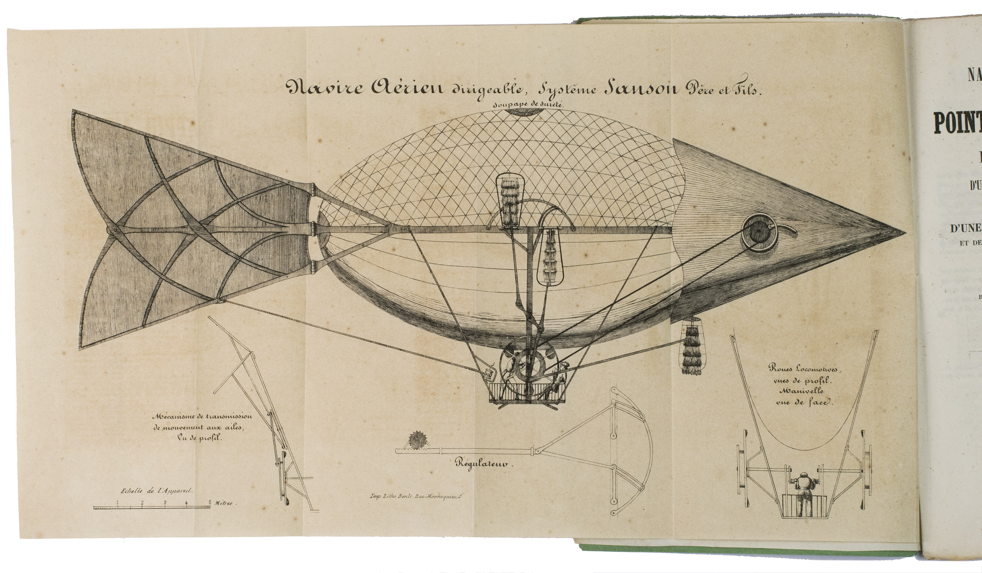 The fish dirigible is shown in detail on the large, folding plate. It was proposed to ascend (the balloon being in equilibrium) by means of wings, to obtain propulsion by four small paddle-wheels, and to steer by means of a large triangular rudder. It was approximately 25 meters long and 12 meters high, and operated from a basket hanging underneath, like in a hot air balloon. It was invented by bookseller and author Alexandre-Jacques Sanson (1789-1862) and his father. The dirigible was never built, but the Sansons nevertheless published a number of other works elaborating on the same subject in the following years: Navigation atmosphérique. Explications complémentaires sur le système (1845); Explication du système de navigation aérienne (1848), and Solution du problème de la navigation aérienne, principes, preuves et moyens (1850). The present work ends with a letter by the aeronaut Jules-François Dupuis-Delcourt (1802-1864), giving permission to use some of his data in the brochure, and offering his blessing to the project.