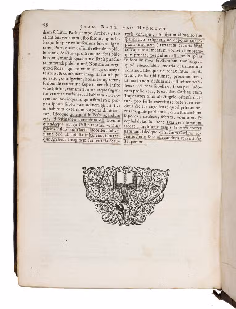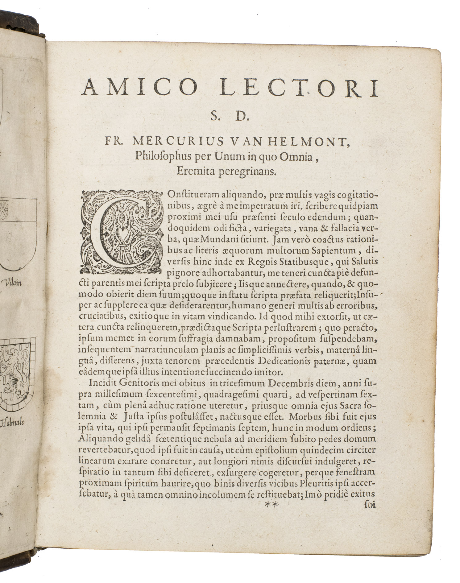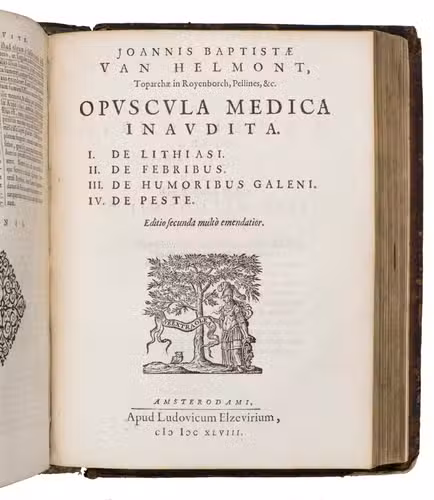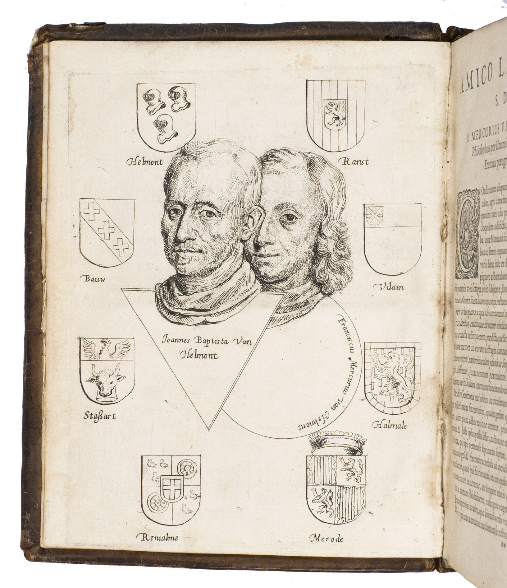 Amsterdam, Lowijs Elzevier, 1648. With engraved portrait of Helmont and his son Franciscus Mercurius, surrounded by eight coat of arms of related families.