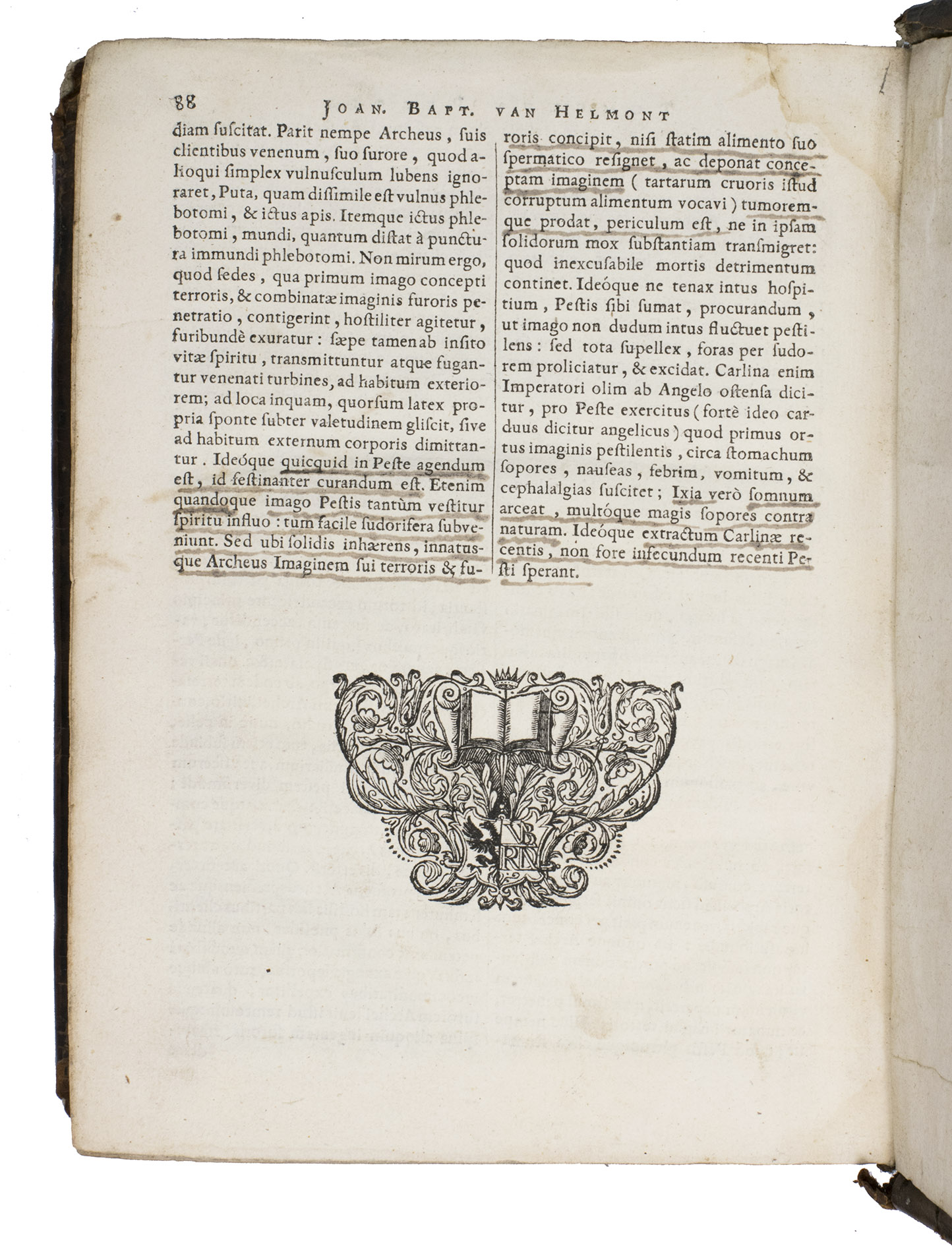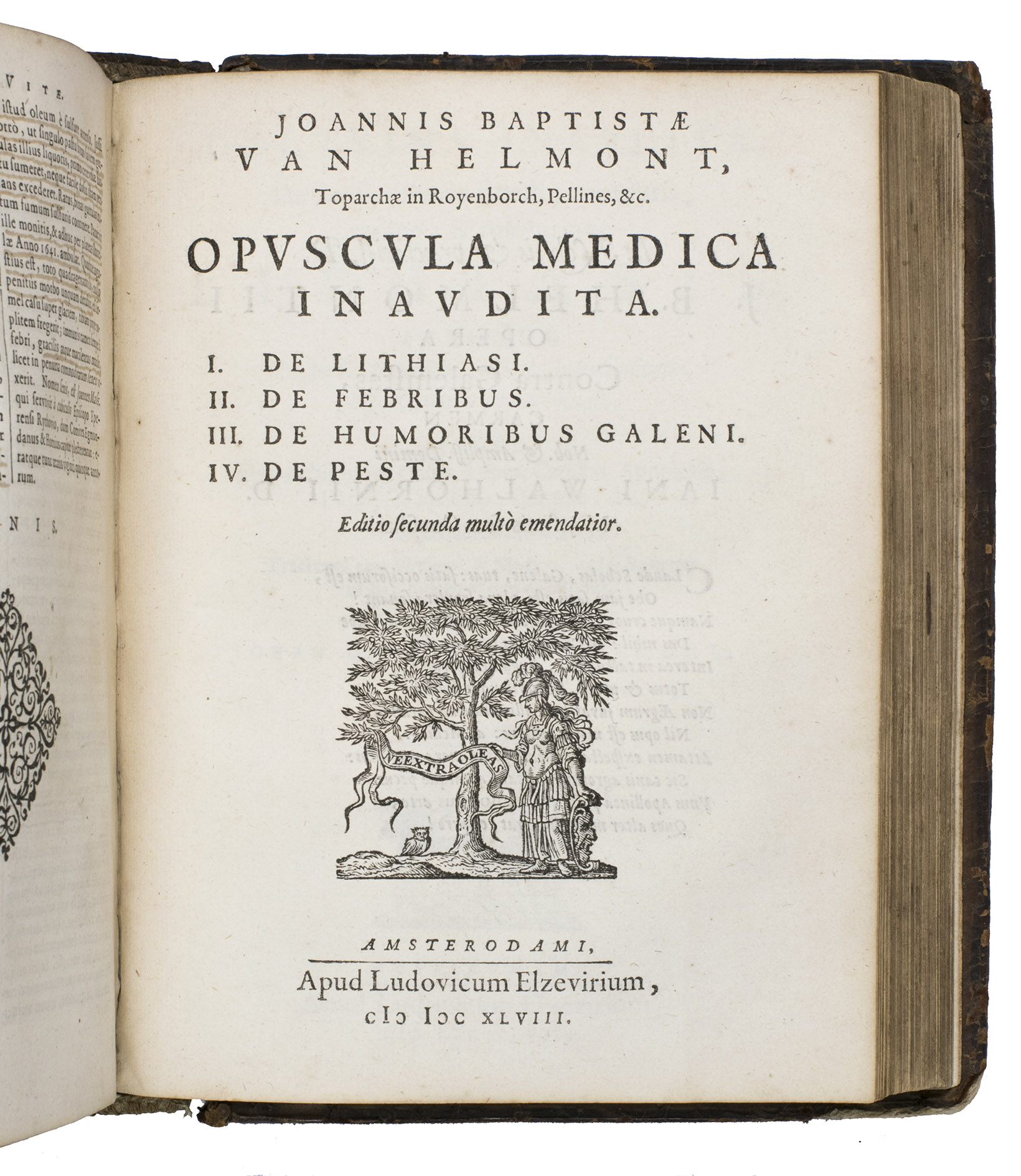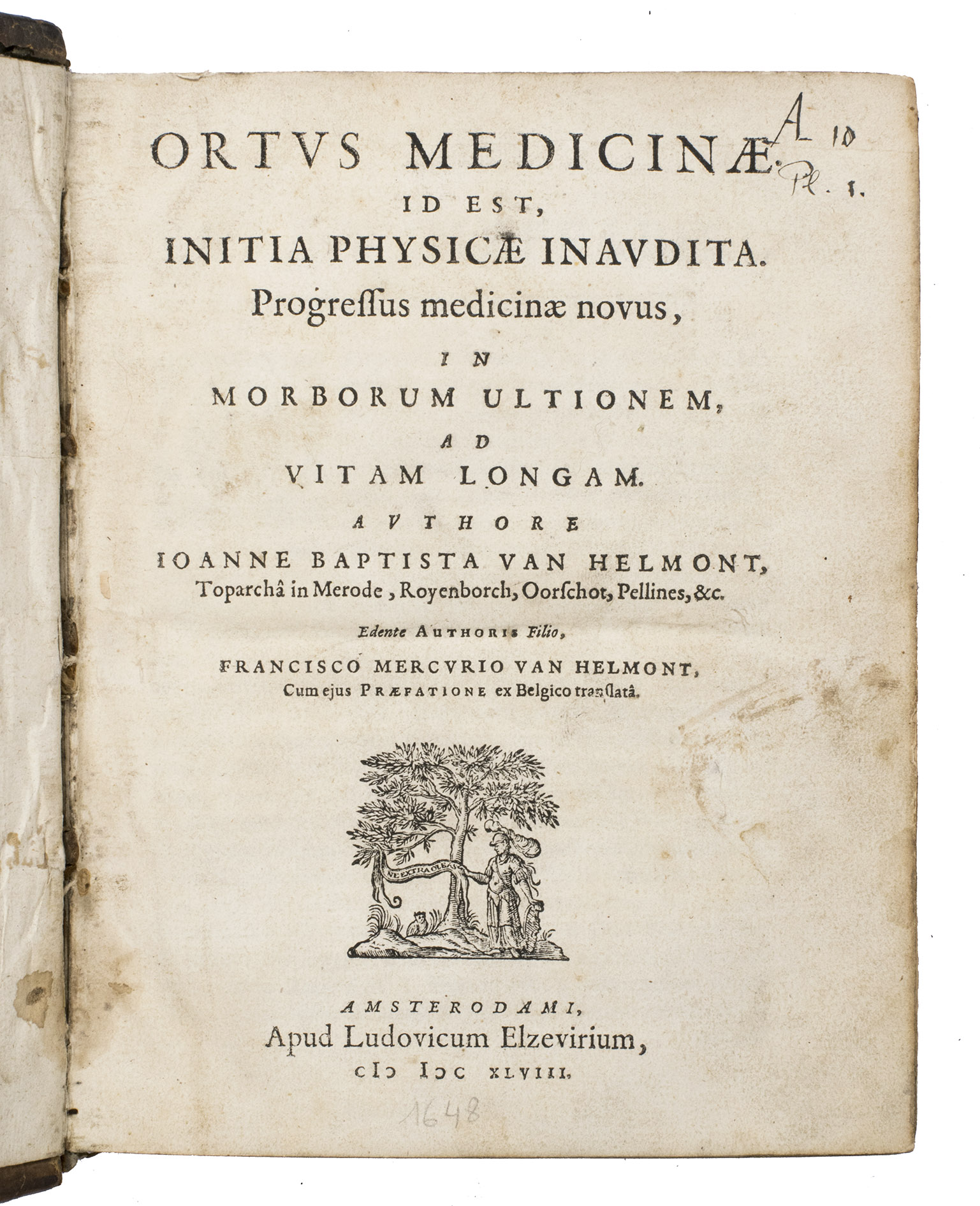 Amsterdam, Lowijs Elzevier, 1648. With engraved portrait of Helmont and his son Franciscus Mercurius, surrounded by eight coat of arms of related families.