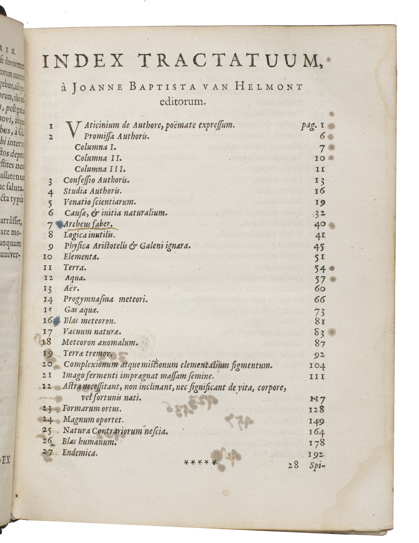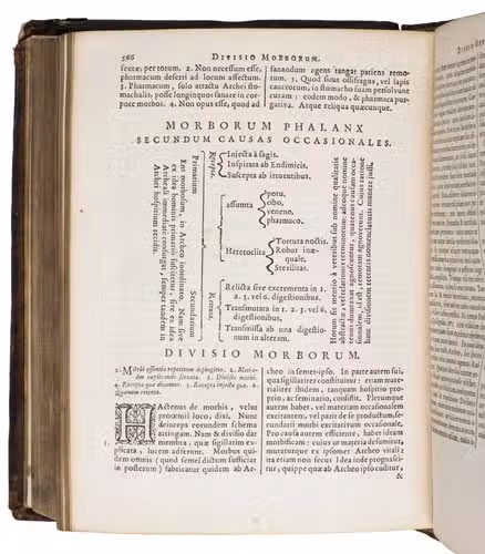 First edition of the Ortus medicinae by Jean Baptiste Helmont (1577-1644), a Belgian mystic and a chemist following in the tradition of Paracelsus (1493-1541), the Swiss German who, next to philosopher, physician, botanist, astrologer and occultist, was seen as the founder of toxicology. With this work, published four years after his death by his son, Helmont establishes his name as one of the founders of biochemistry, and as a significant figure in the history of medicine. Due to the mystical elements in the book it was going against Church dogma, and was therefore published in the Protestant Netherlands, instead of in Catholic Southern Netherlands. It became his most successful work, and was issued with the second enlarged edition of Opuscula medica inaudita (first published in 1644). Both works are dealing with the treatment of disorders like leprosy, epilepsy and paralysis, of fevers, including stonefever, and the different Galenic humors.
