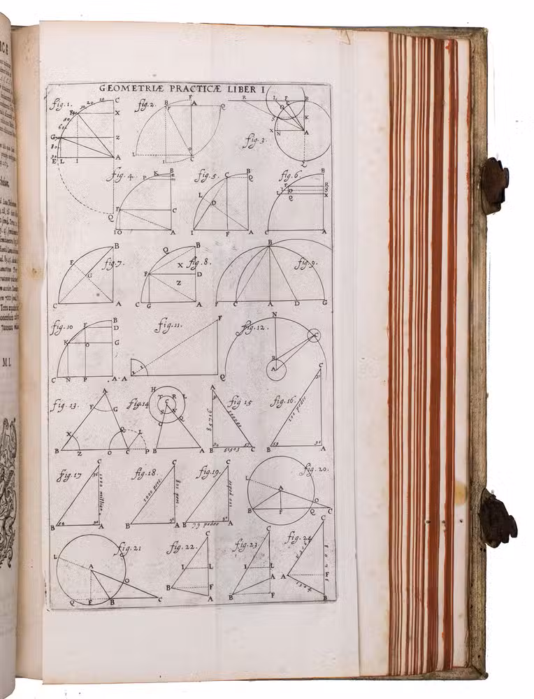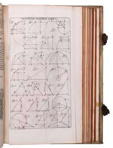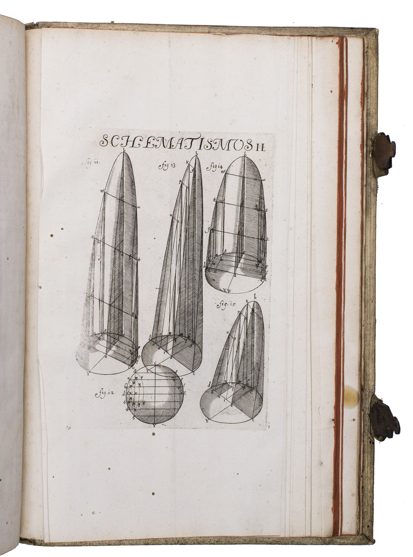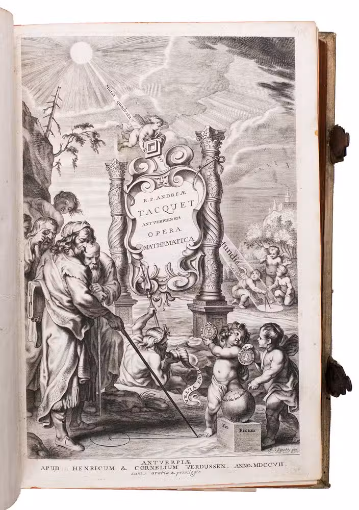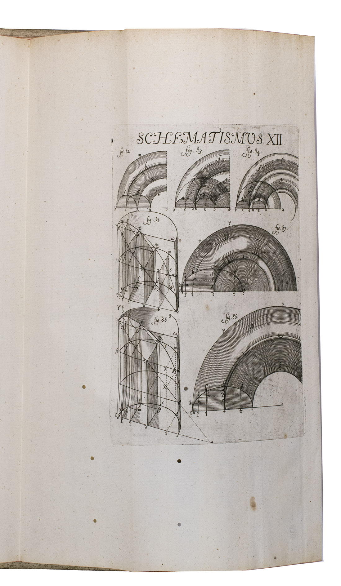 Antwerp, Henricus & Cornelius Verdussen, 1707. Folio. With a richly engraved allegorical frontispiece illustrating light refraction through lenses and the teaching of drawing with compasses, large engraved publisher's device on title-page, title in red and black, and numerous illustrations and figures on 87 folding engraved plates. Contemporary richly blind- and gold-tooled vellum over wooden boards, on the front board, the coat-of-arms of the Cartusiae Maurbacensis as centrepiece on the back board, red edges, two metal clasps. [32], 553, [1 blank] pp.