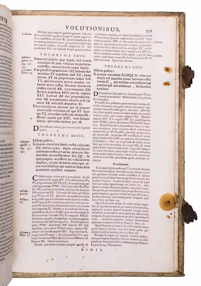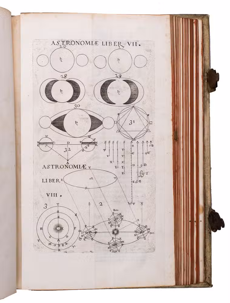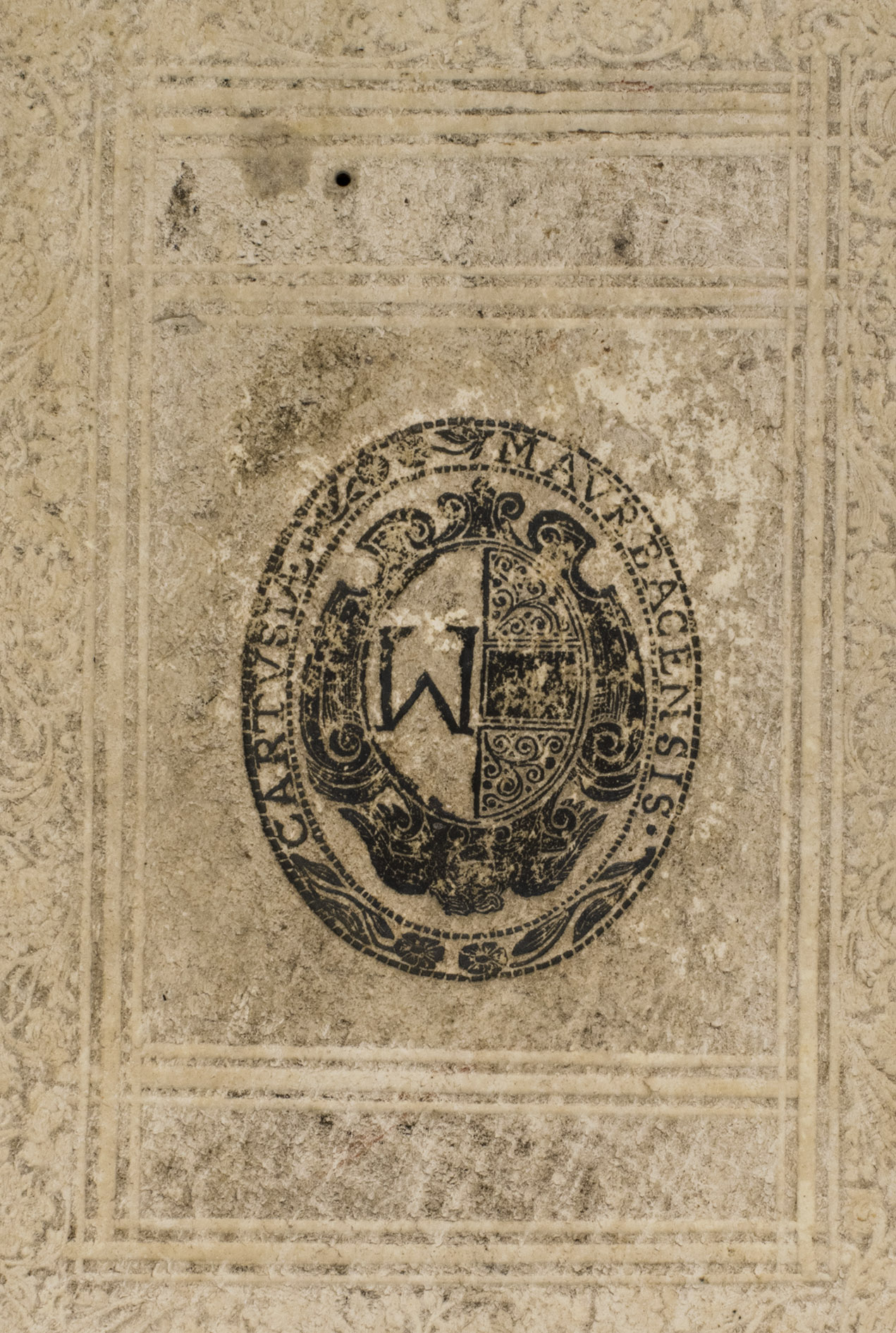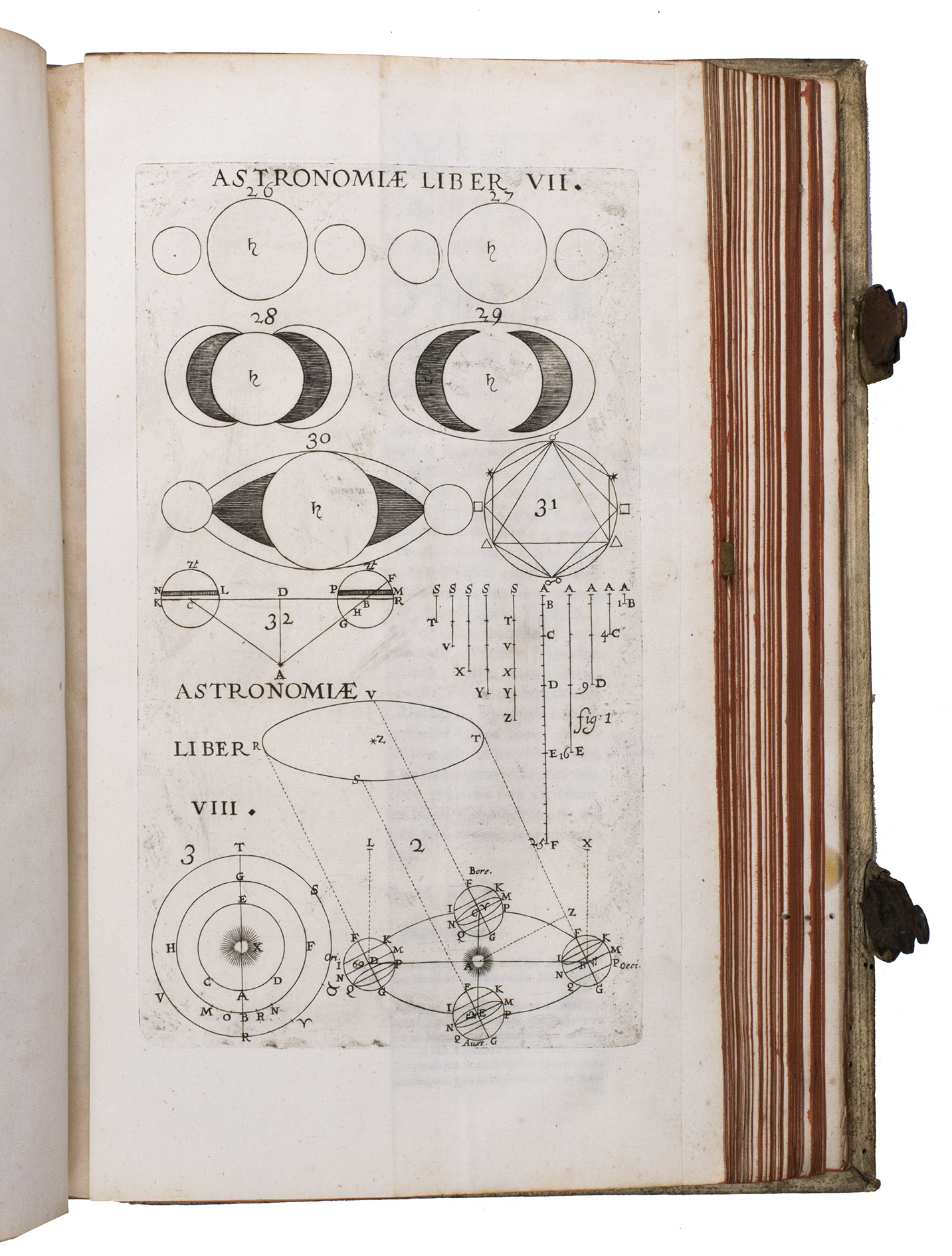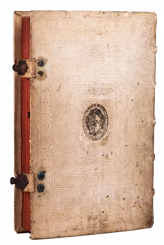 Antwerp, Henricus & Cornelius Verdussen, 1707. Folio. With a richly engraved allegorical frontispiece illustrating light refraction through lenses and the teaching of drawing with compasses, large engraved publisher's device on title-page, title in red and black, and numerous illustrations and figures on 87 folding engraved plates. Contemporary richly blind- and gold-tooled vellum over wooden boards, on the front board, the coat-of-arms of the Cartusiae Maurbacensis as centrepiece on the back board, red edges, two metal clasps. [32], 553, [1 blank] pp.