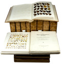 Leiden, Pieter van der Aa, [ca. 1720]. Oblong 4to (22.5 x 27 cm). With an engraved, illustrated title-page, letterpress dedication and note to the reader (the latter with a woodcut decorated initial) and 80 etched and engraved plates (9 folding).Contemporary half calf, paste-paper sides, gold-tooled spine. engr. title-page + [2] pp. plus 80 plates. Full description