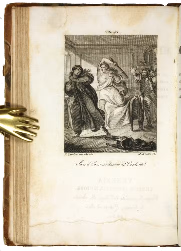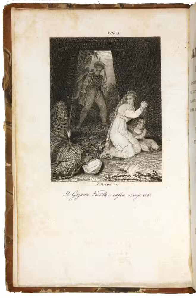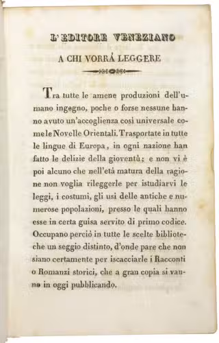 Rare first illustrated Italian edition of the Arabian Nights, the first new translation after Coletis. This is one of the finest Italian editions of the Nights, both for its impressive set of plates and for its translation. The editor and translator Antonio Francesco Falconetti had worked on a greatly expanded French corpus that is considered one of the most complete versions of the work: "The translation, entirely new, is based on the latest Paris edition, found, for the part already made public by Galland, on original texts, amended and enlarged with new stories by M. Destains, and then completed with the addition of a very large number of previously unpublished novellas discovered by M. Hammer, which form a good third of the entire series" (editors preface, vol. I, p. XI).