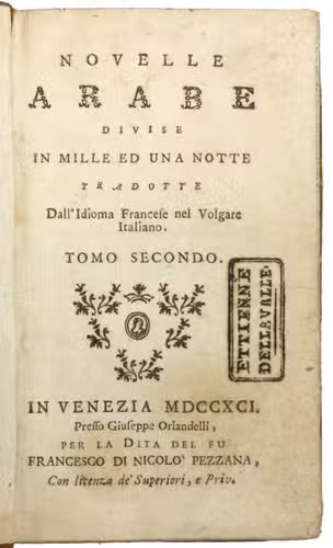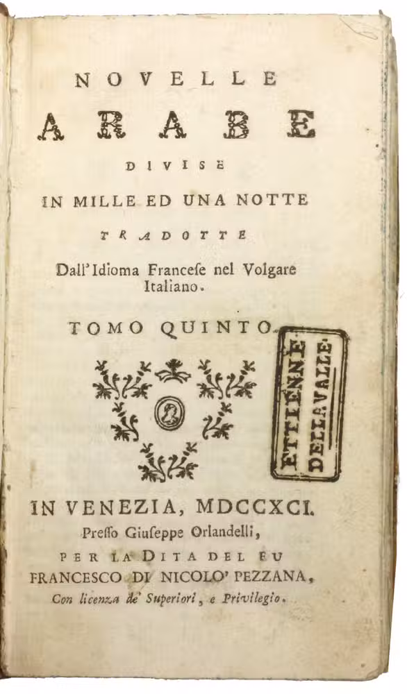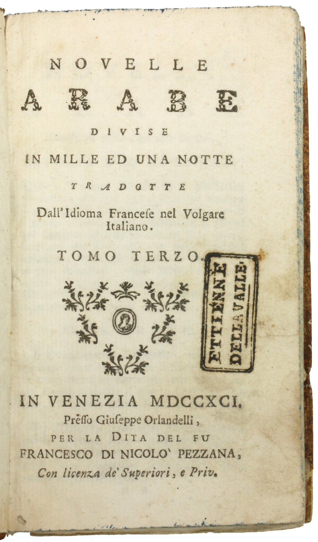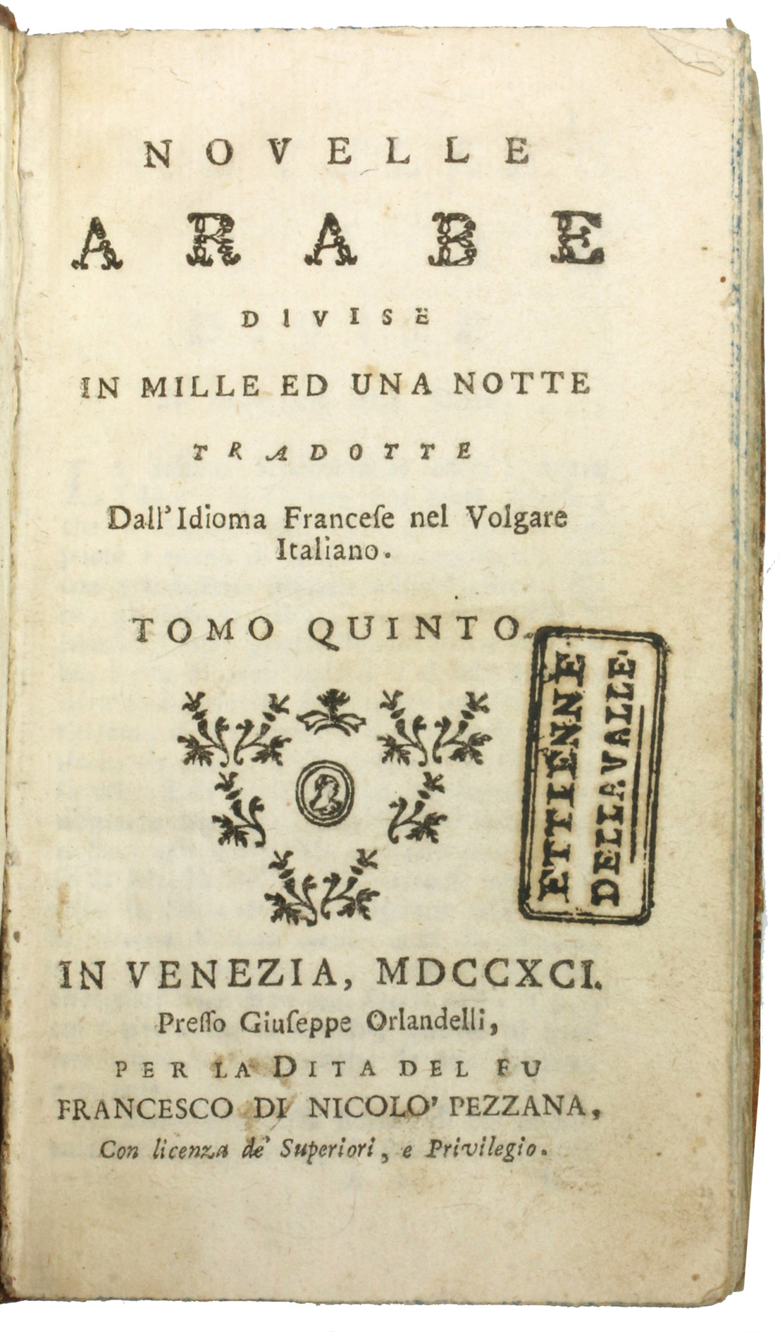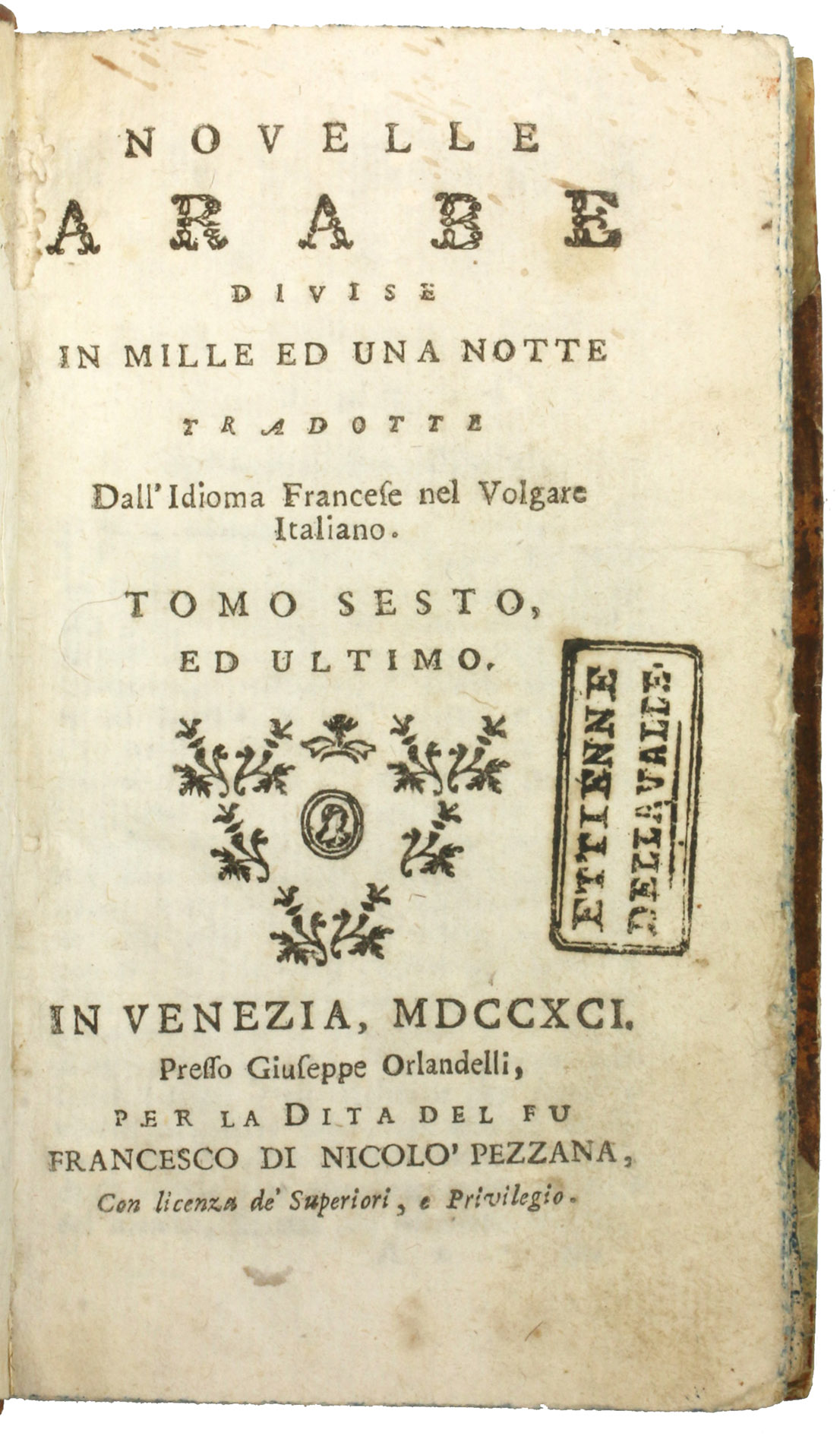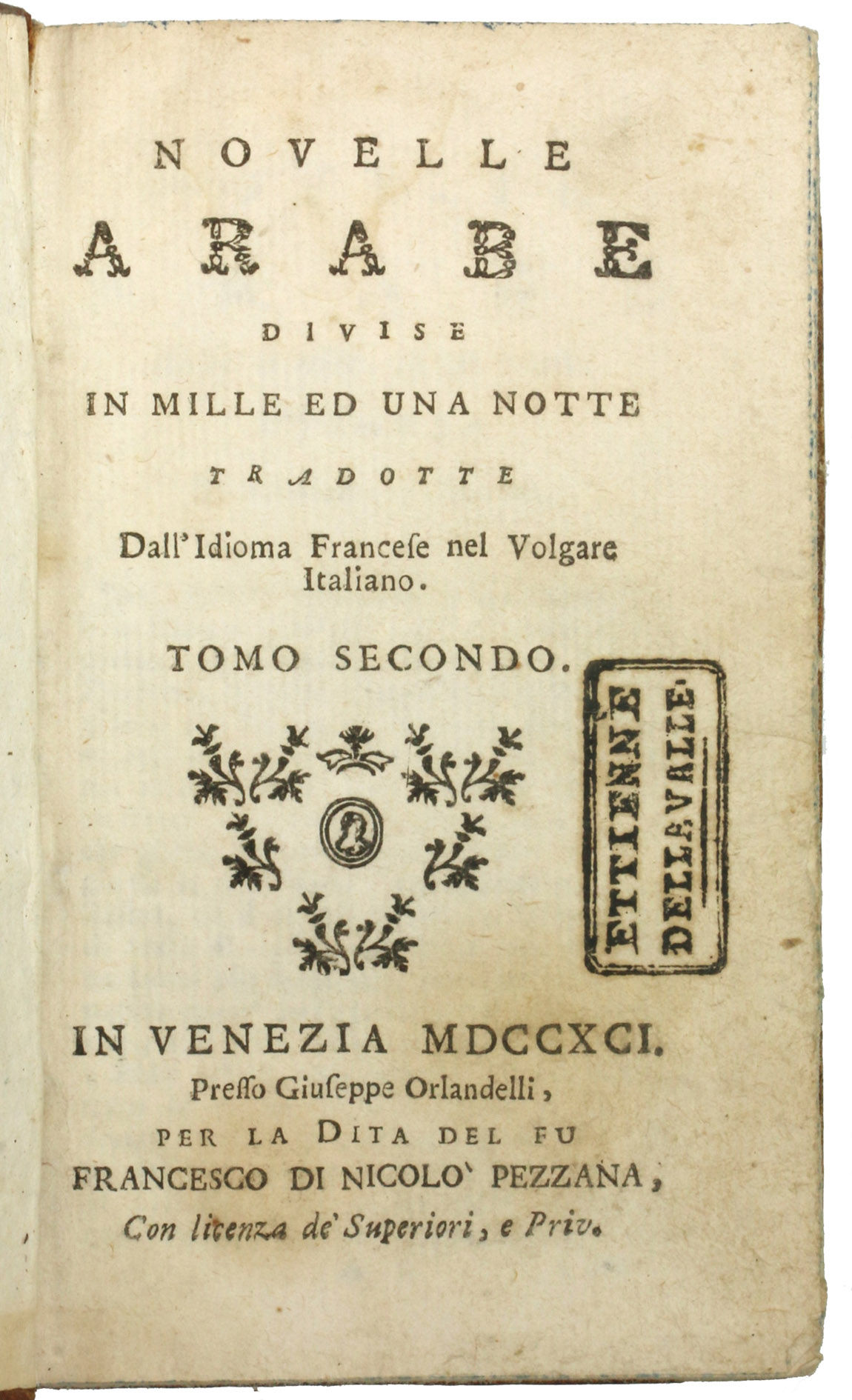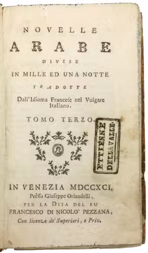 Second Pezzana edition, following that of 1784. That Niccolò Pezzanas company, which in the meantime had been succeeded by Giuseppe Orlandelli, returned to print the Arabian Nights testifies to the great favour the stories had found among readers in Venice. Also in 1791, the "Continuation of the Thousand and one nights" left its presses, in a major publishing project to rediscover oriental fables.