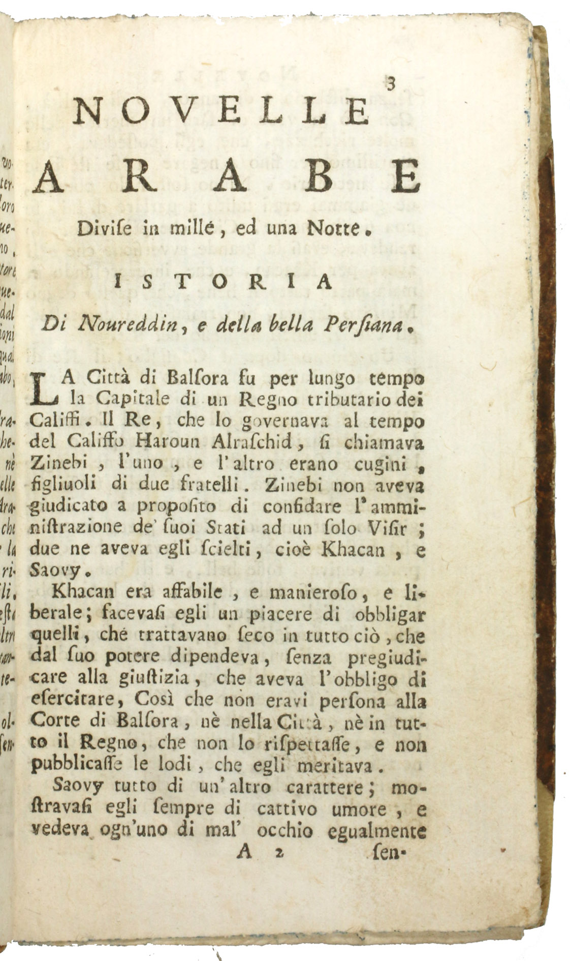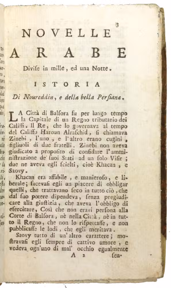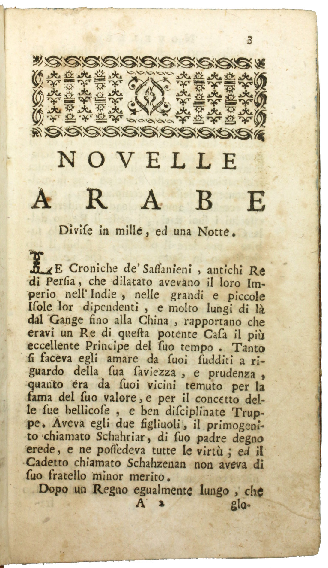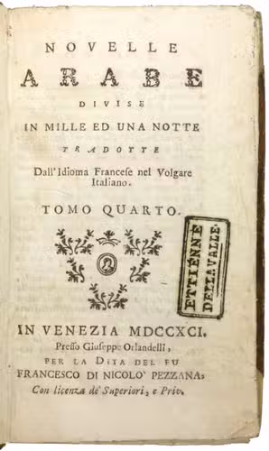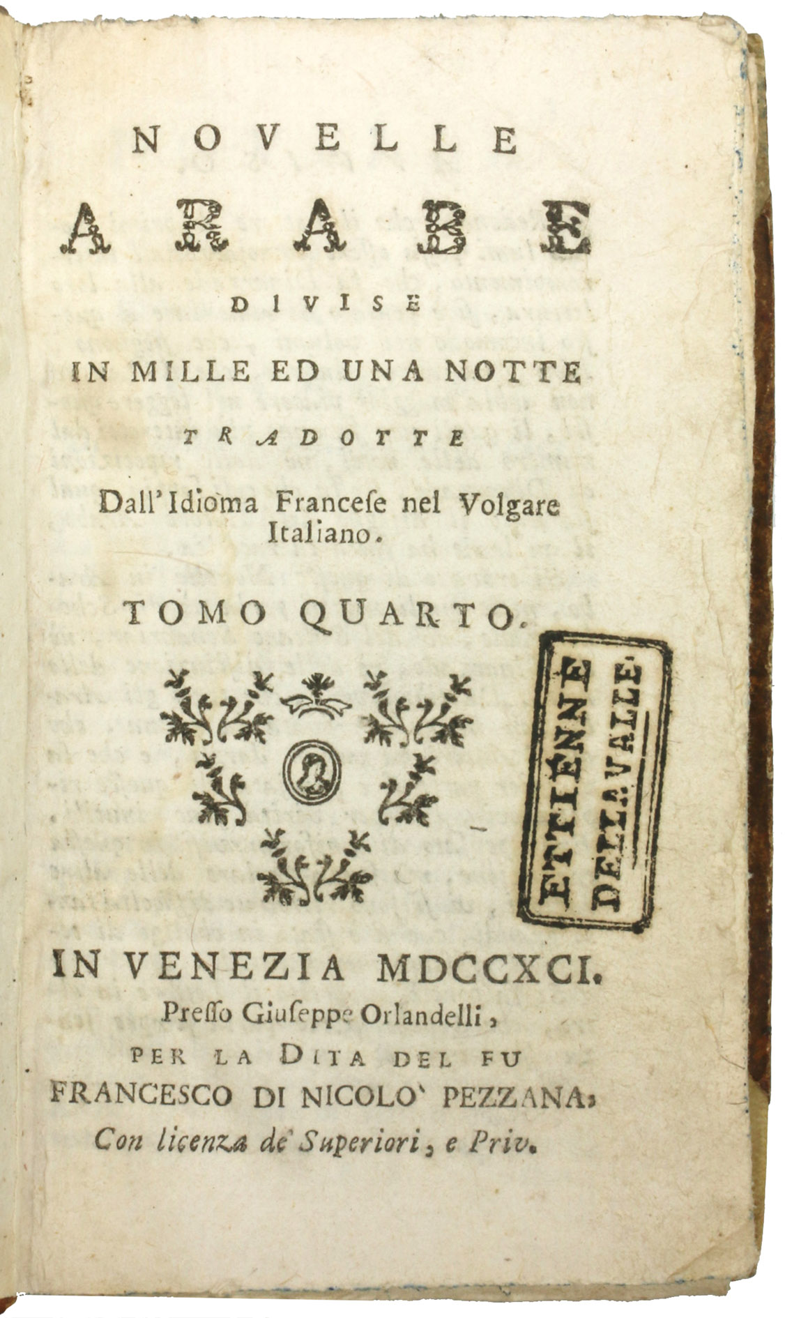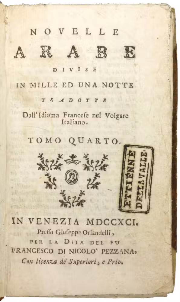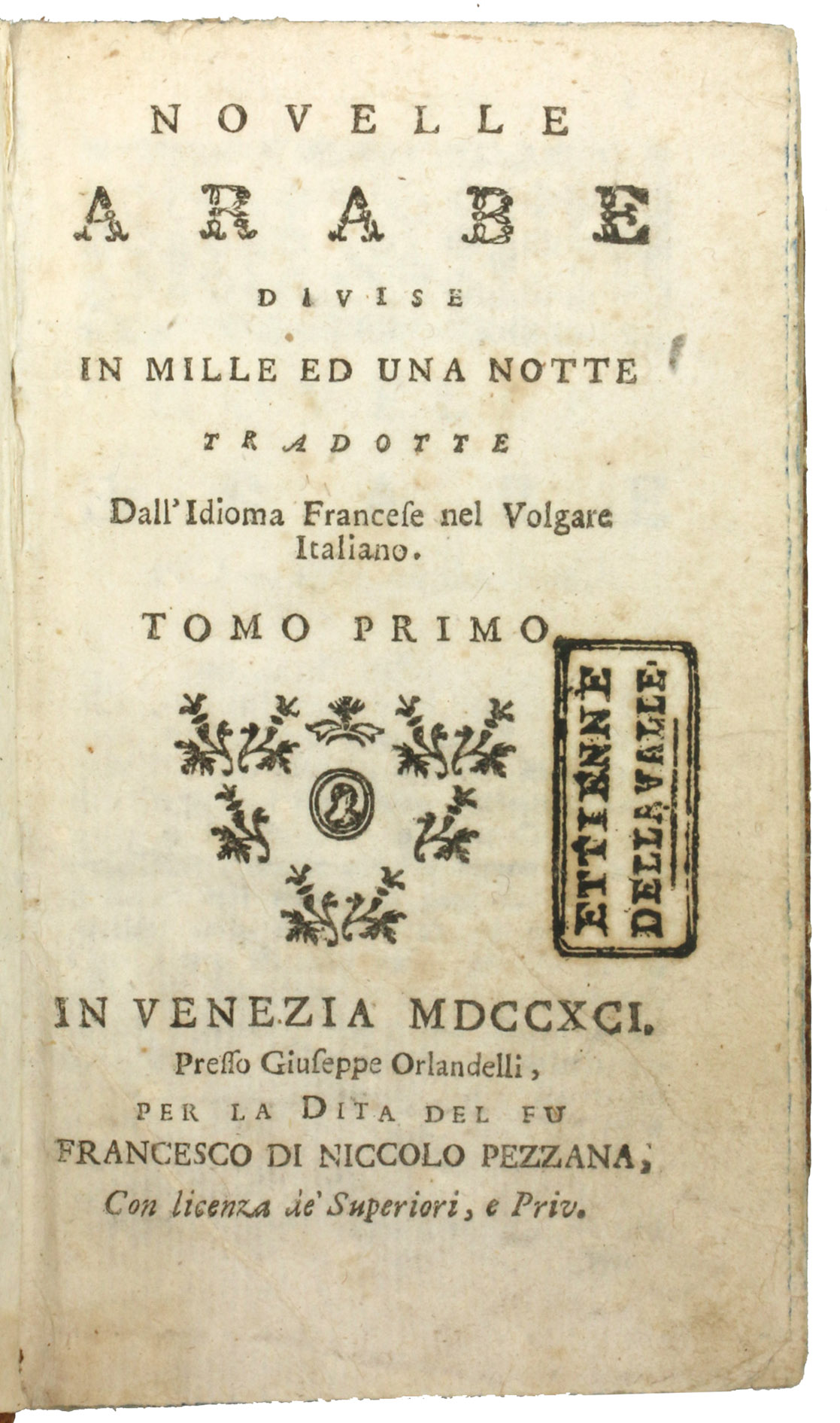 Second Pezzana edition, following that of 1784. That Niccolò Pezzanas company, which in the meantime had been succeeded by Giuseppe Orlandelli, returned to print the Arabian Nights testifies to the great favour the stories had found among readers in Venice. Also in 1791, the "Continuation of the Thousand and one nights" left its presses, in a major publishing project to rediscover oriental fables.