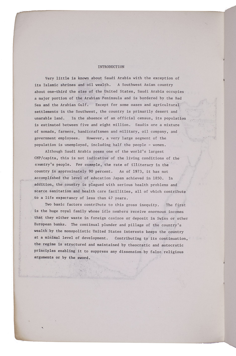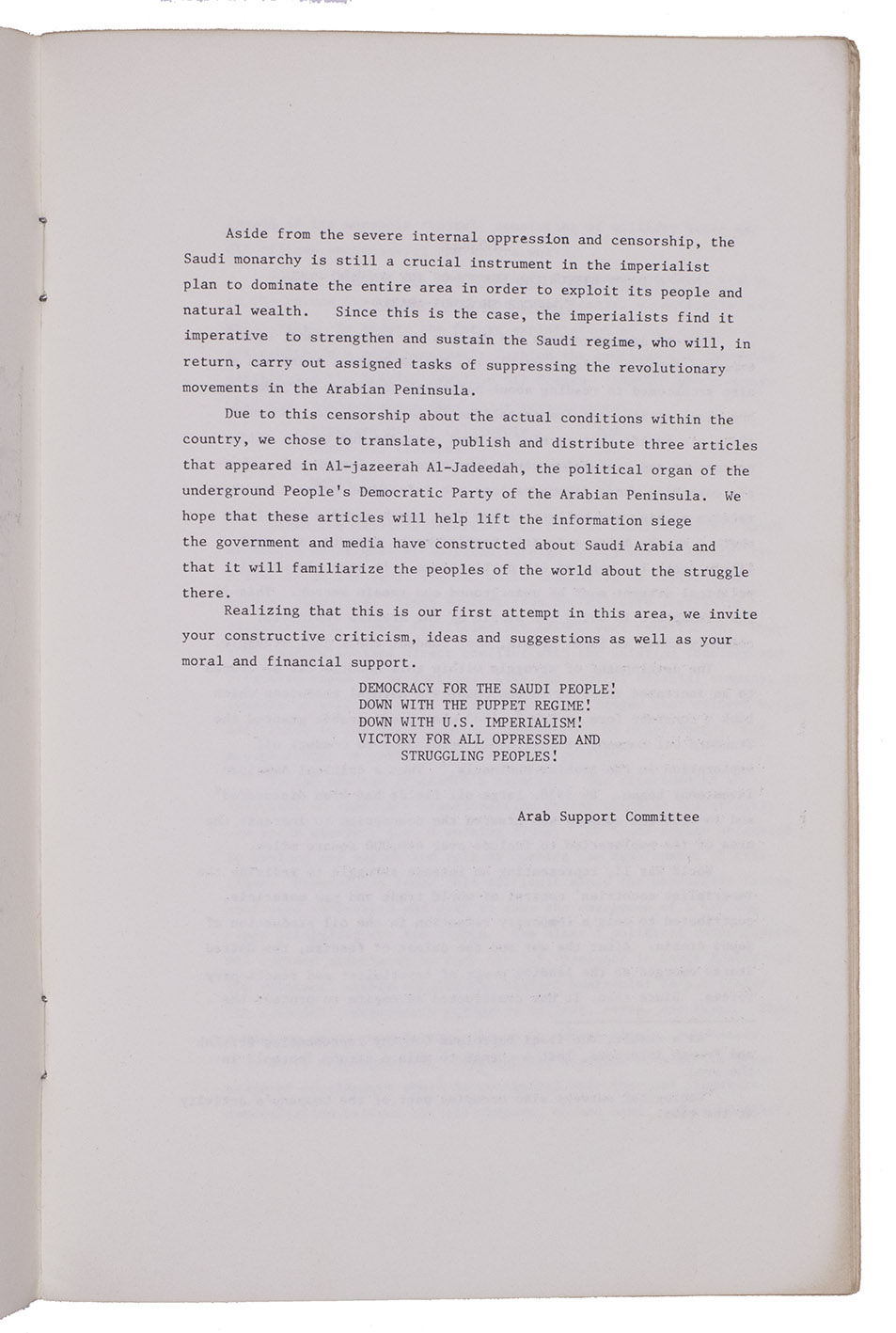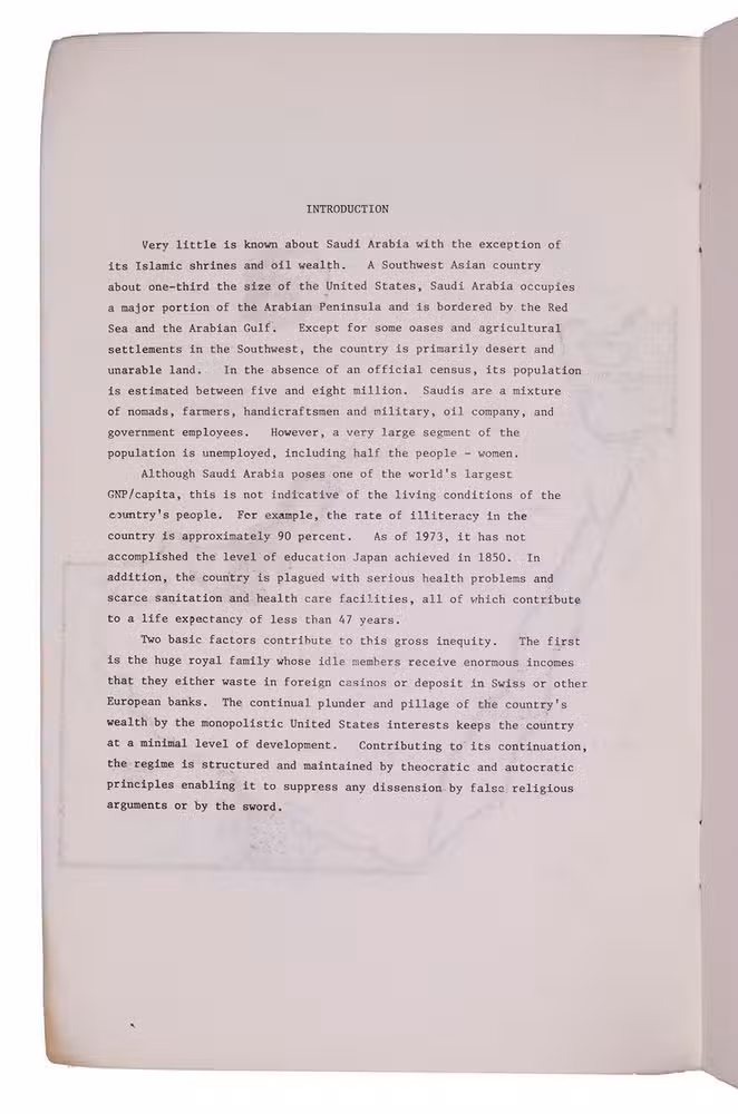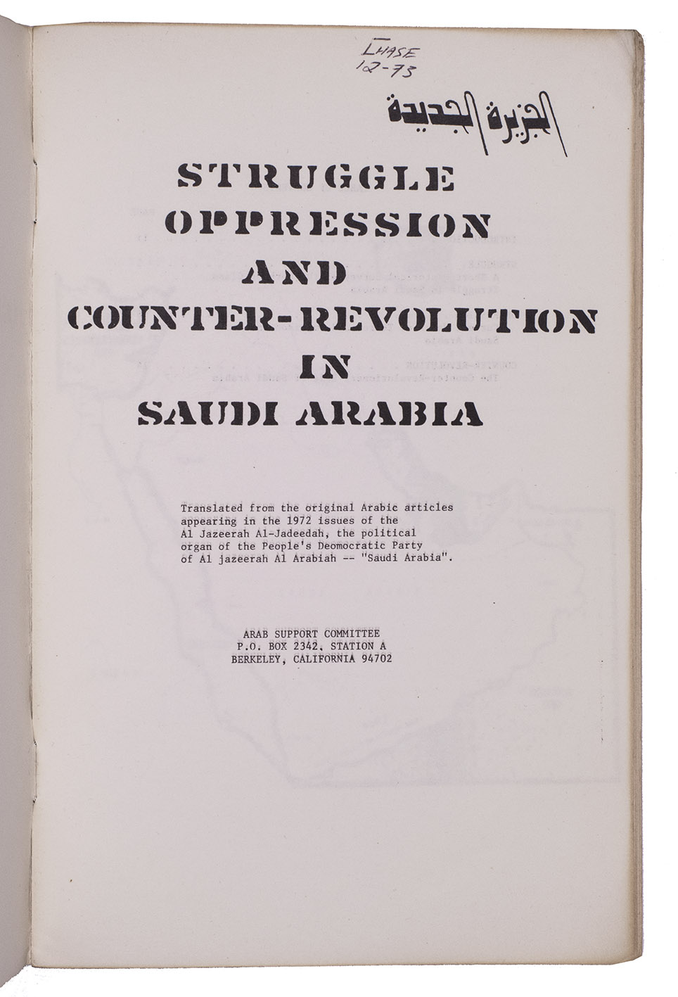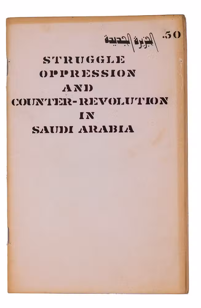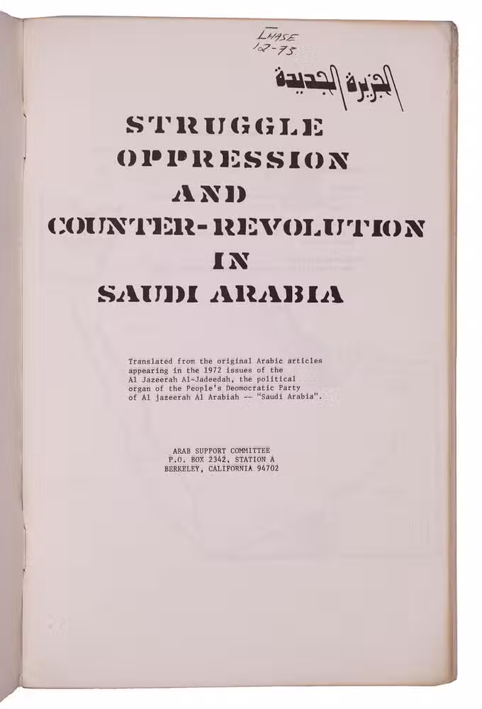 Revolutionary pamphlet published by the Arab Support Committee in Berkeley, containing translations of three articles originally published in 1972 in the journal of the People's Democratic Party of Saudi Arabia. The three articles concern statements regarding the economy and politics of Saudi Arabia, particularly in its relation to the state of South Yemen.