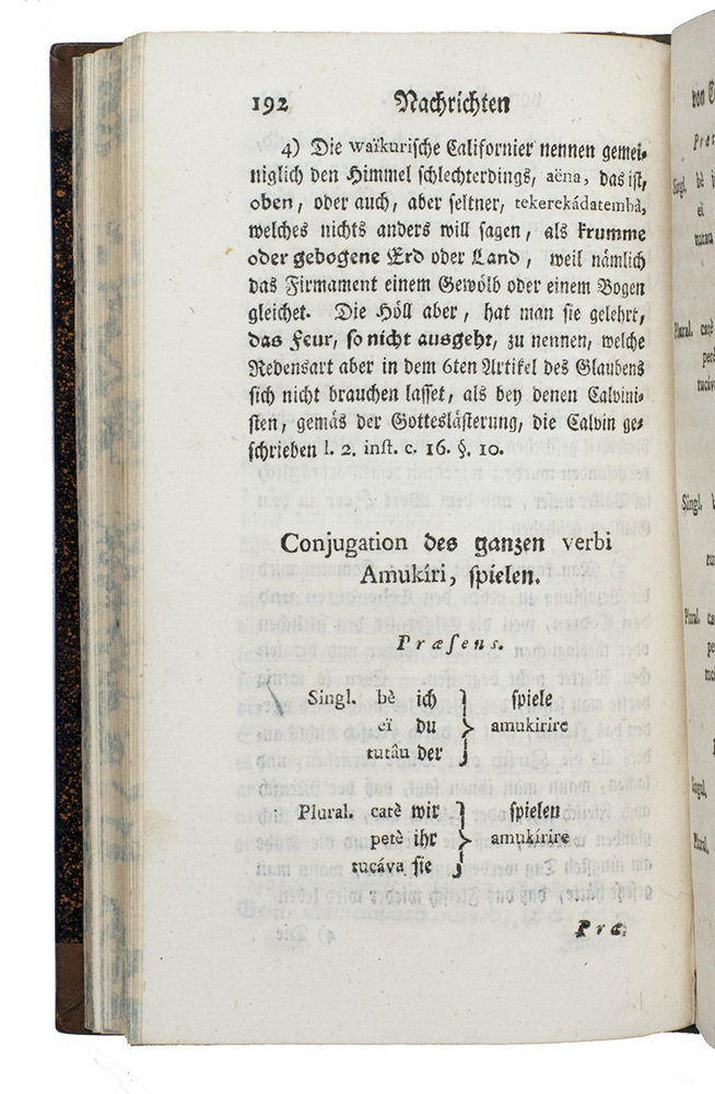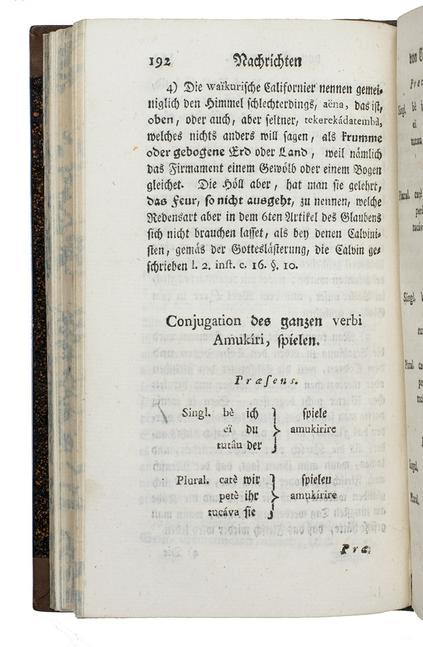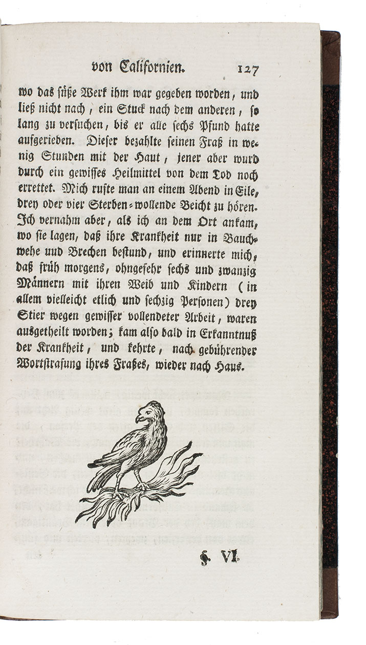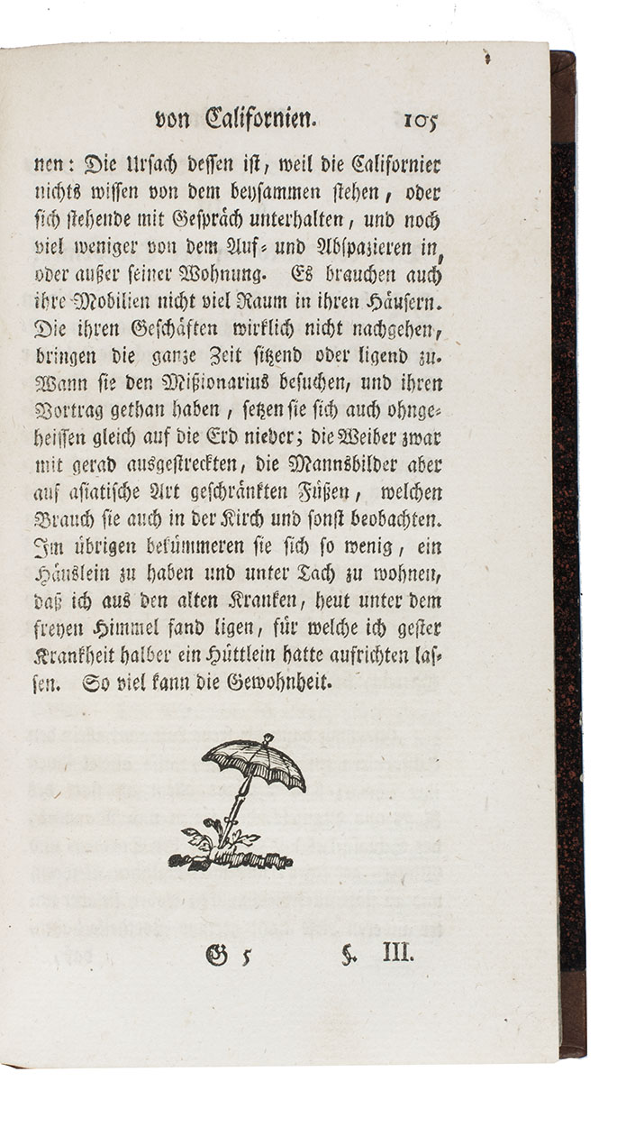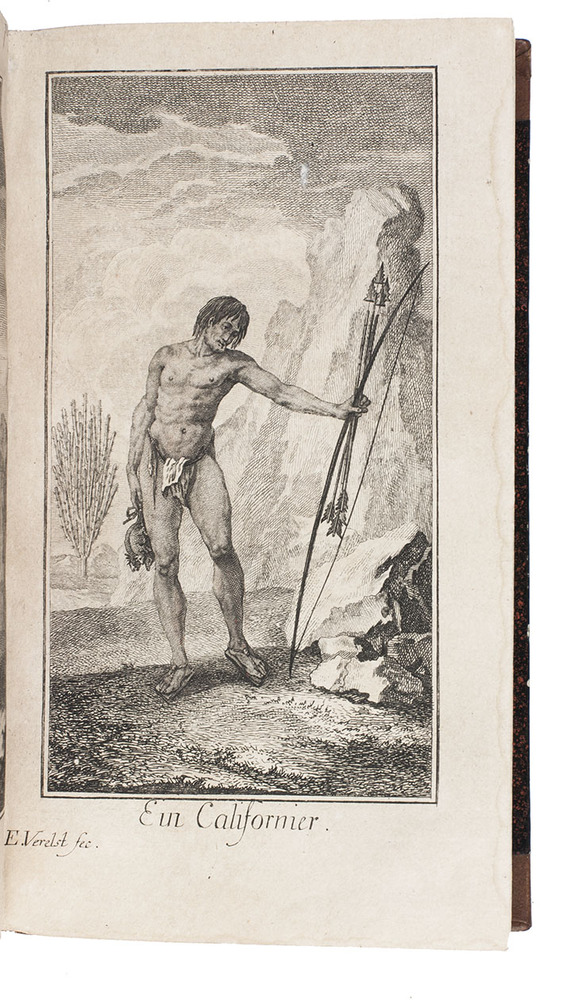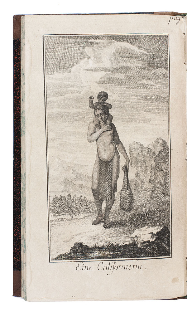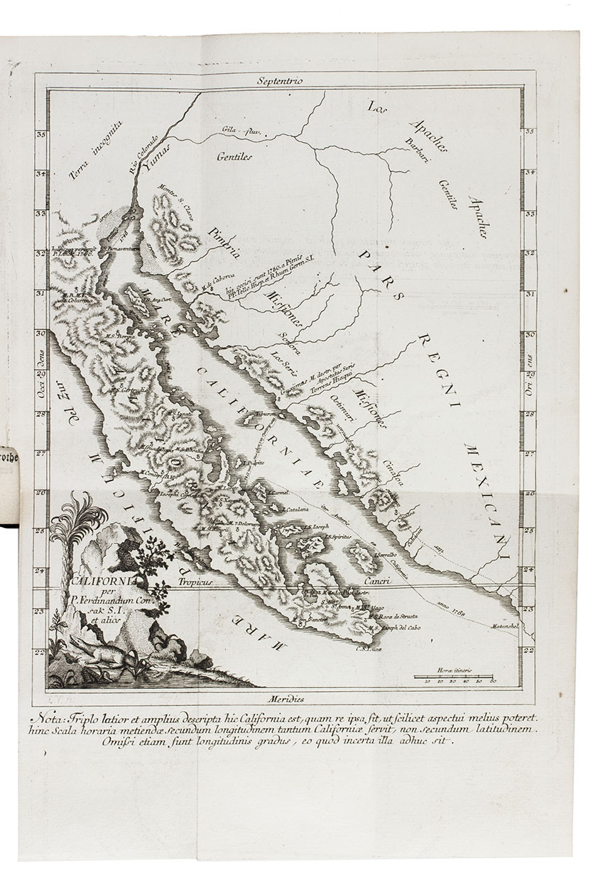 First edition of a rare Americanum. Jakob Baegert (1717-1772), a German Jesuit, wrote an interesting and by no means glowing account of the natives and the country "California" (the Baja Peninsula). Cowan comments in his note that, "according to his accounts the country was absolutely unfit for habitation; it was inhabited by wild and ferocious beasts; peopled by cruel and inhospitable savages; water was unfit to use; wood was scarce; the soil would not sustain life". It was written to disabuse the public mind as to the rumoured mineral riches and pearls from California, which had spread from Mexico to Madrid, and Germany. The book is nonetheless filled with valuable ethnographical and historical information. Chapter 20 is devoted to the Waicuri language of the California Indians. The map shows the location of the many Jesuit missions in the Baja, and shows Baegert's route along the west coast of Mexico in 1751 and his return route in 1768, after the expulsion of the Jesuits.