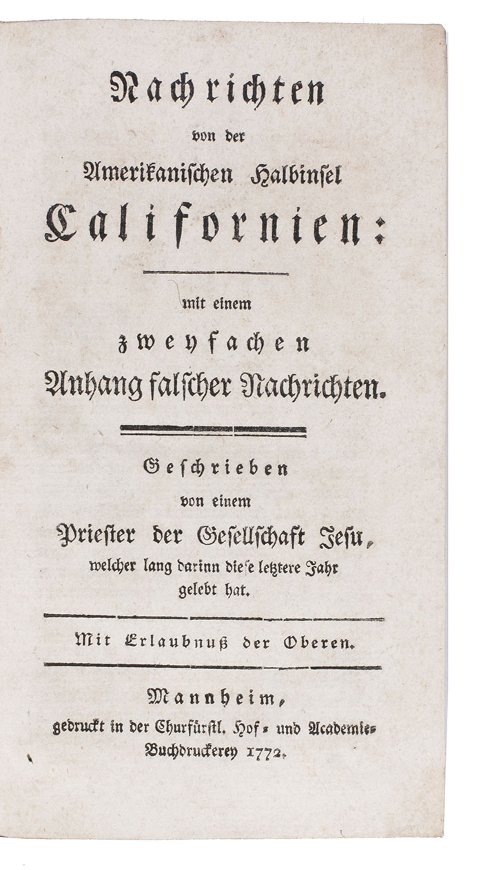 Nachrichten von der Amerikanische Halbinsel Californien: mit einem zweyfachen Anhang falscher Nachrichten. Geschrieben von einem Priester der Gesellschaft Jesu, welcher lang darinn diese letztere Jahr gelebt hat.