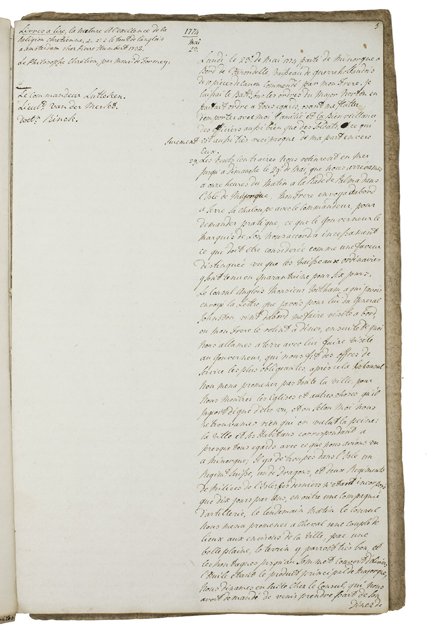 Rudolph Bentinck had served as a Lieutenant in the British Royal American Army from 1756 to 1762, during the Seven Years War, often known in the United States as the French and Indian War, when he fought side by side with Colonel George Washington, the future first president of the United States. On his return he served as a Lieutenant Colonel in Jersey from 1769 to 1771 (also Guernsey according to the NNWB). The present journals fill part of a gap in his biography: that of 1771 begins in The Hague, where he took a Dutch commission for two years in July 1771 to inspect the fortifications in Venloo, Maastricht and Namur, but the 1774 journal shows he was in British service on Menorca by May 1774, when the journal begins with his departure (Bentinck, Echte stukken, 1784, notes his return from Menorca on 29 May 1775). He left British service in 1776 and returned to the Dutch army. He was granted an Overijsel knighthood as Heer van Schoonheeten in 1777 and made a Baron in 1819.