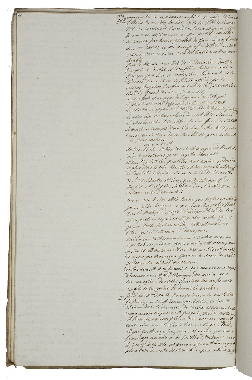 Although neither these journals nor the earlier American one (formerly kept with this one and written in a similar hand) names its author, the events in the American journal clearly identify him as Lieutenant Rudolph Bentinck, who visited William Bentinck, 2nd Duke of Portland, on his way to America. In the present 1771 journal he sets off on 7 July 1771 with (Cornelis Pieter) Baron van Leiden, (Nicolaas Baron van Denike, Heer?) van Nieuwland, (Adolf Warner), Baron van Palland(t) tot Beerse (1745-1823) and "mon frere Diepenhein" [= Derk Bentinck van Diepenheim (1741-1813)], the reference to his brother confirming his identity as Volkier Rudolph Bentinck (1738-1820). They travelled mostly by coach.