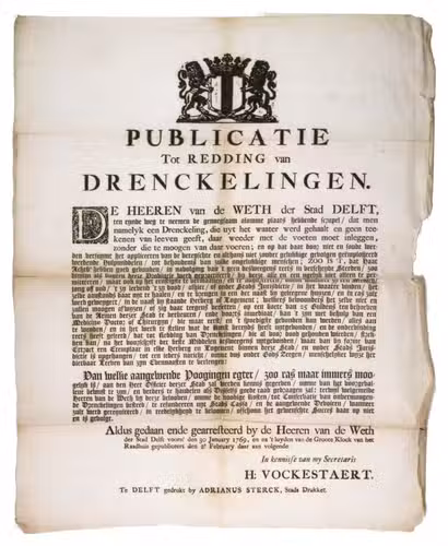 Unrecorded broadside informing the citizens of Delft of the best ways to save drowning (and drowned) people. Apparently, recovered drown victims that showed no signs of life were typically left on the waterfront with their feet dipped into the water. However, the present broadside (or "plakkaat" in Dutch) states that they had to be brought to the nearest house or inn instead, where a physician had to be called as soon as possible, as the victim might still be alive. The broadside was sent to every inn within the jurisdiction of Delft at the time, so it must have been printed many times. However, it is now exceptionally rare, as we have not been able to trace any other copies.