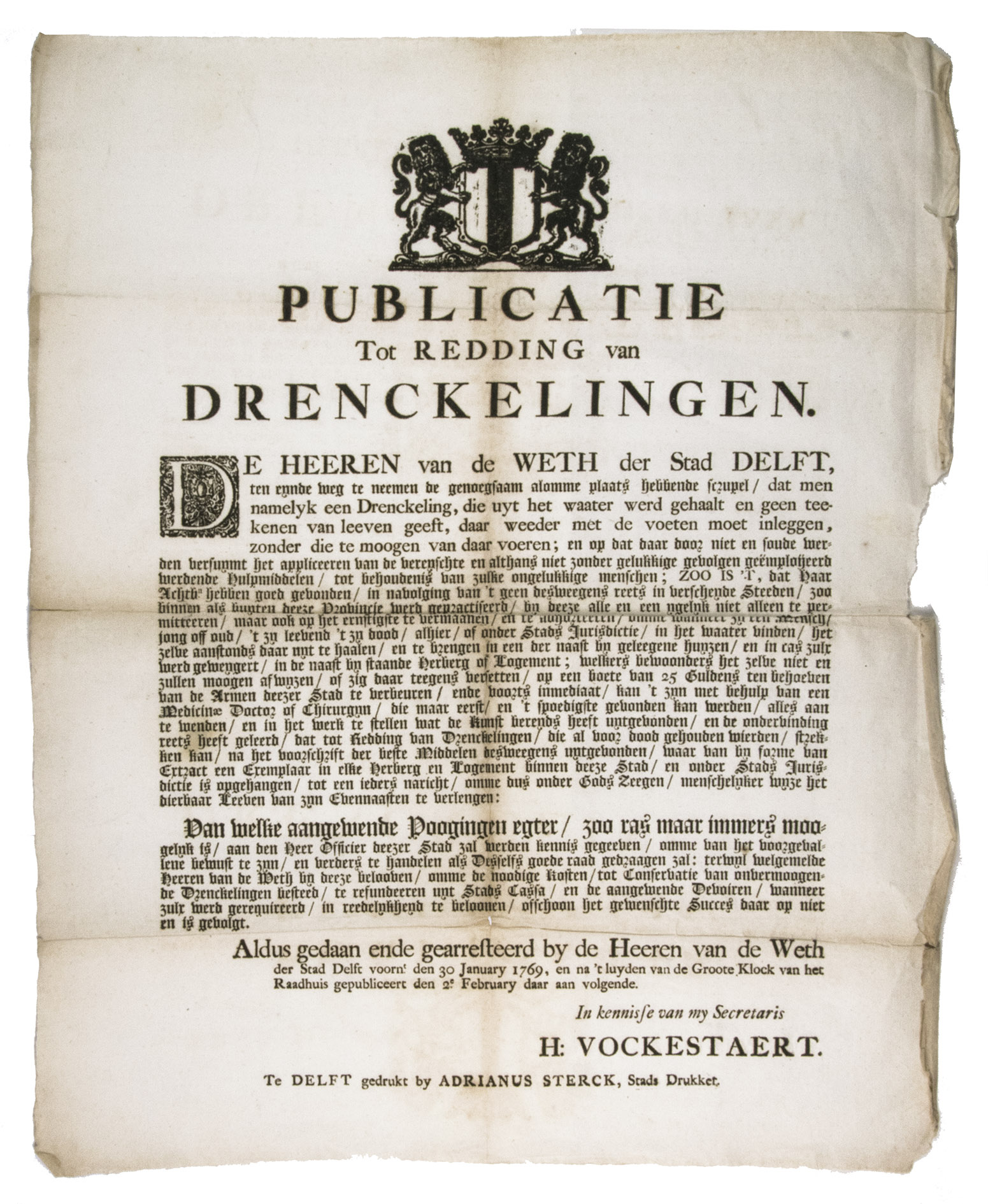 Delft, Adrianus Sterck, 2 February 1769. Ca. 54 x 43.5 cm. With the woodcut coat of arms of Delft, and a decorated woodcut initial. [1] l.