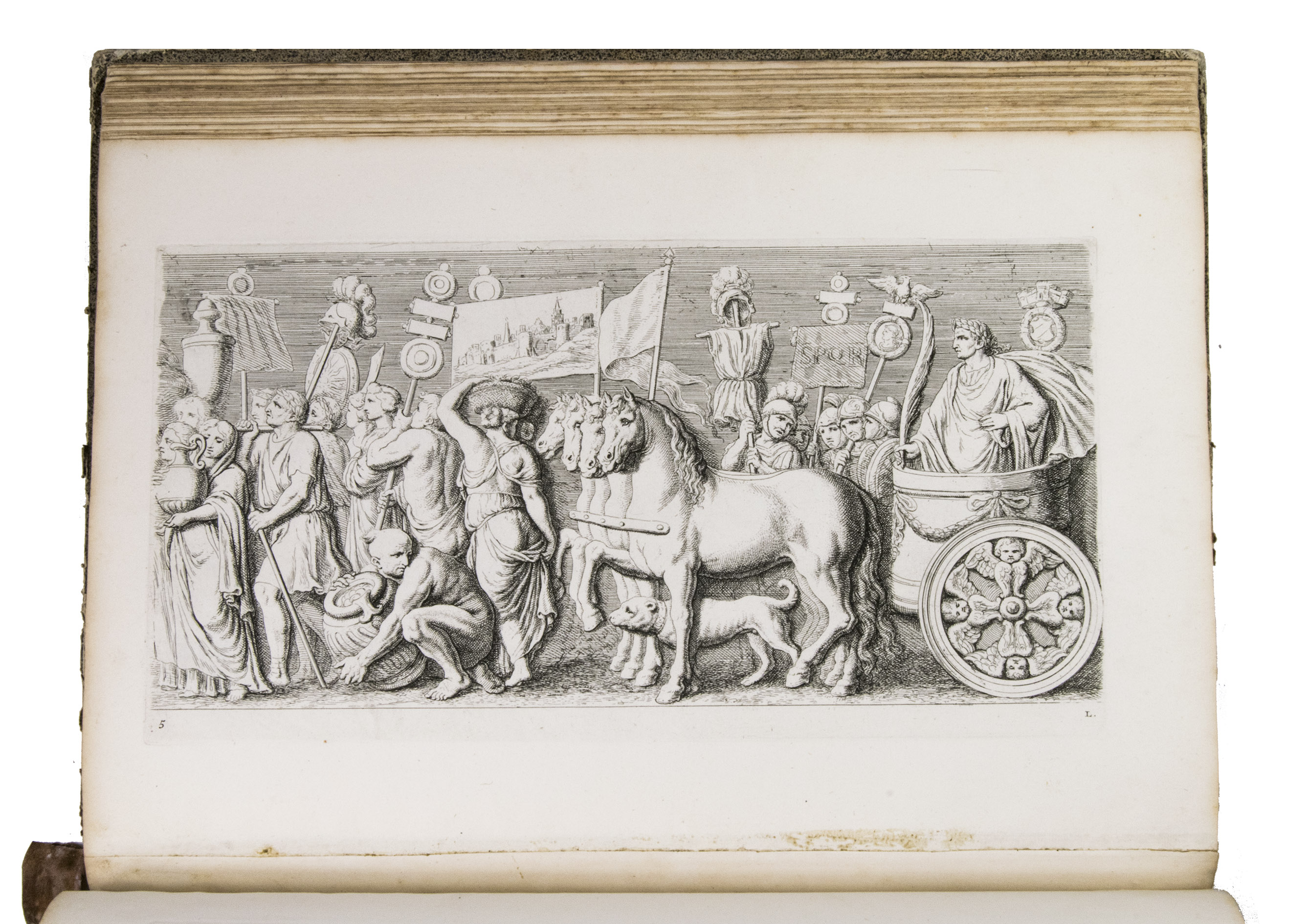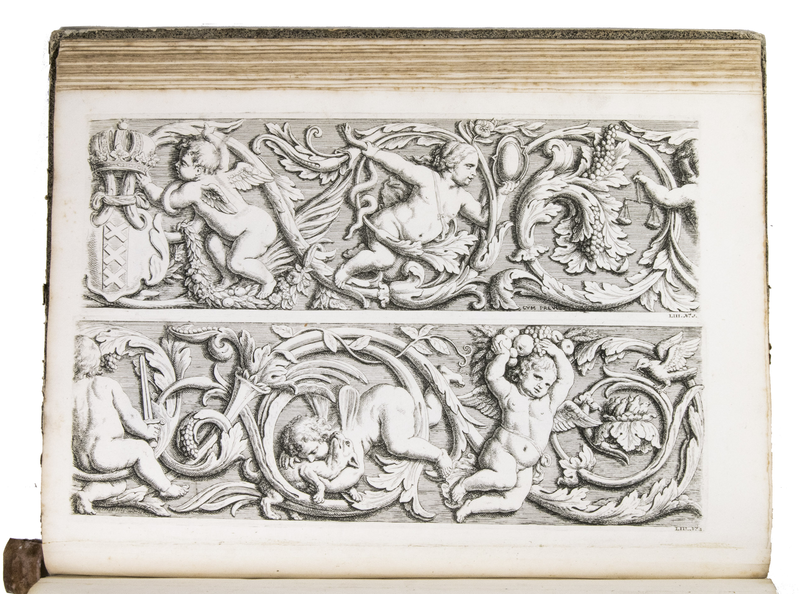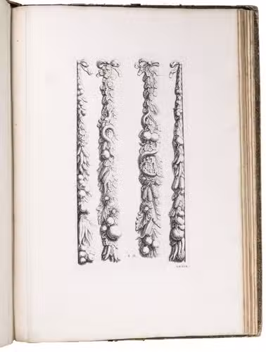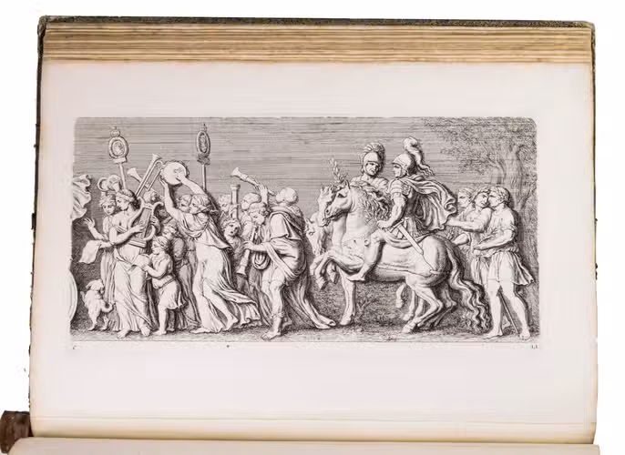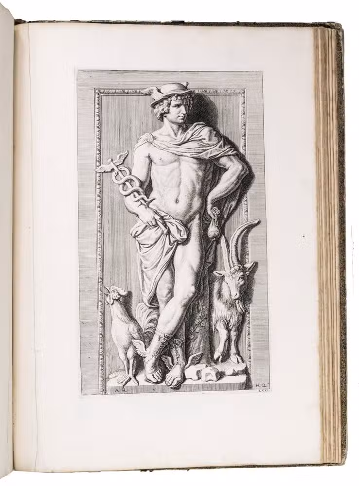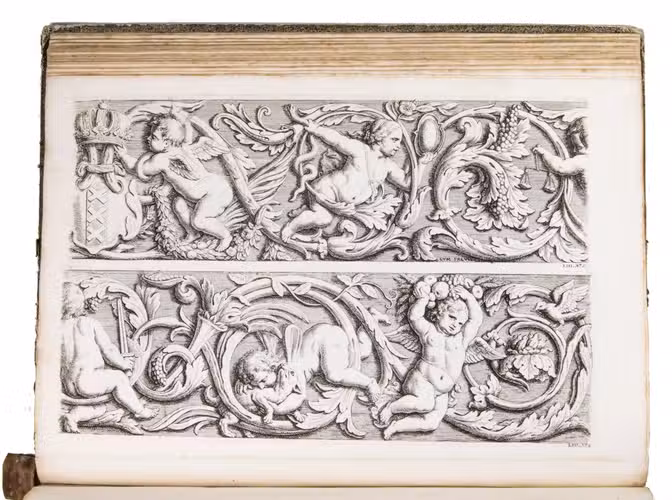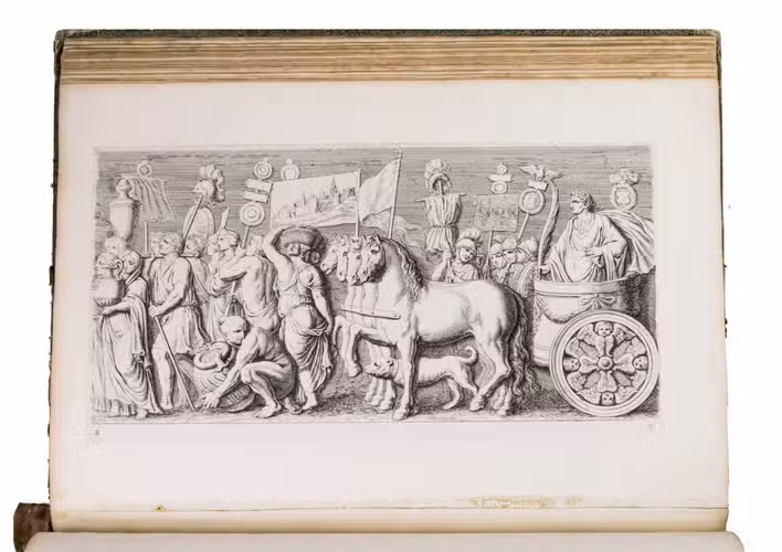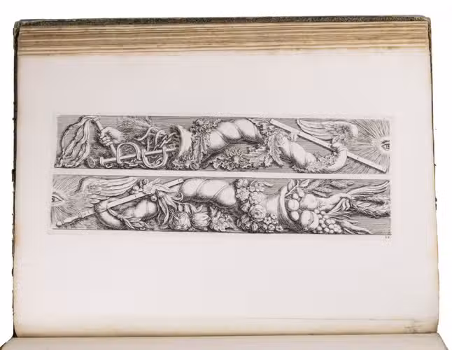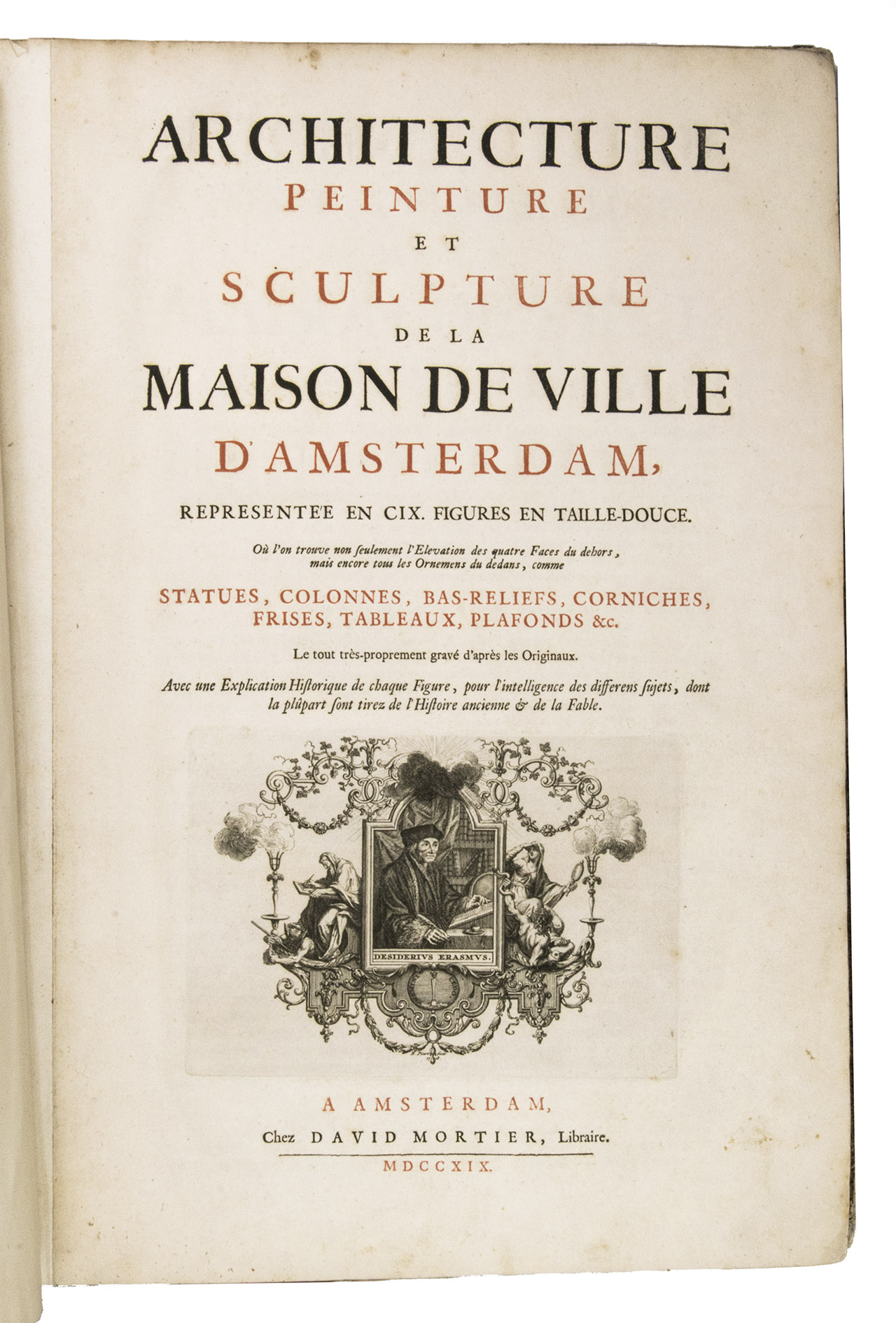 Amsterdam, David Mortier, 1719. Royal folio. With a title-page in red and black with an engraved device (a portrait of Erasmus in an elaborate cartouche with allegorical figures), and 124 engraved architectural and sculptural illustrations on 109 numbered plates (6 double-page, 103 full-page).