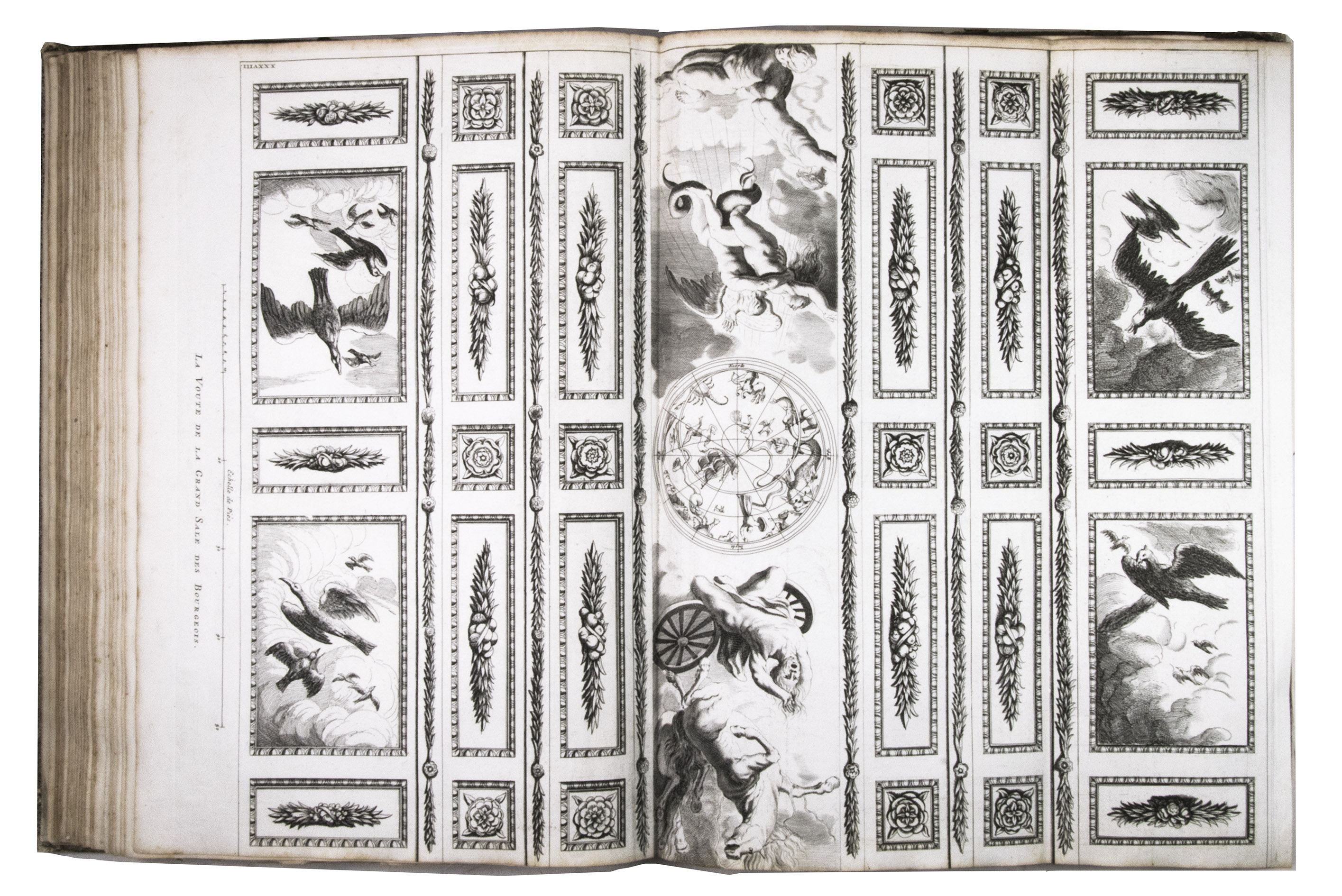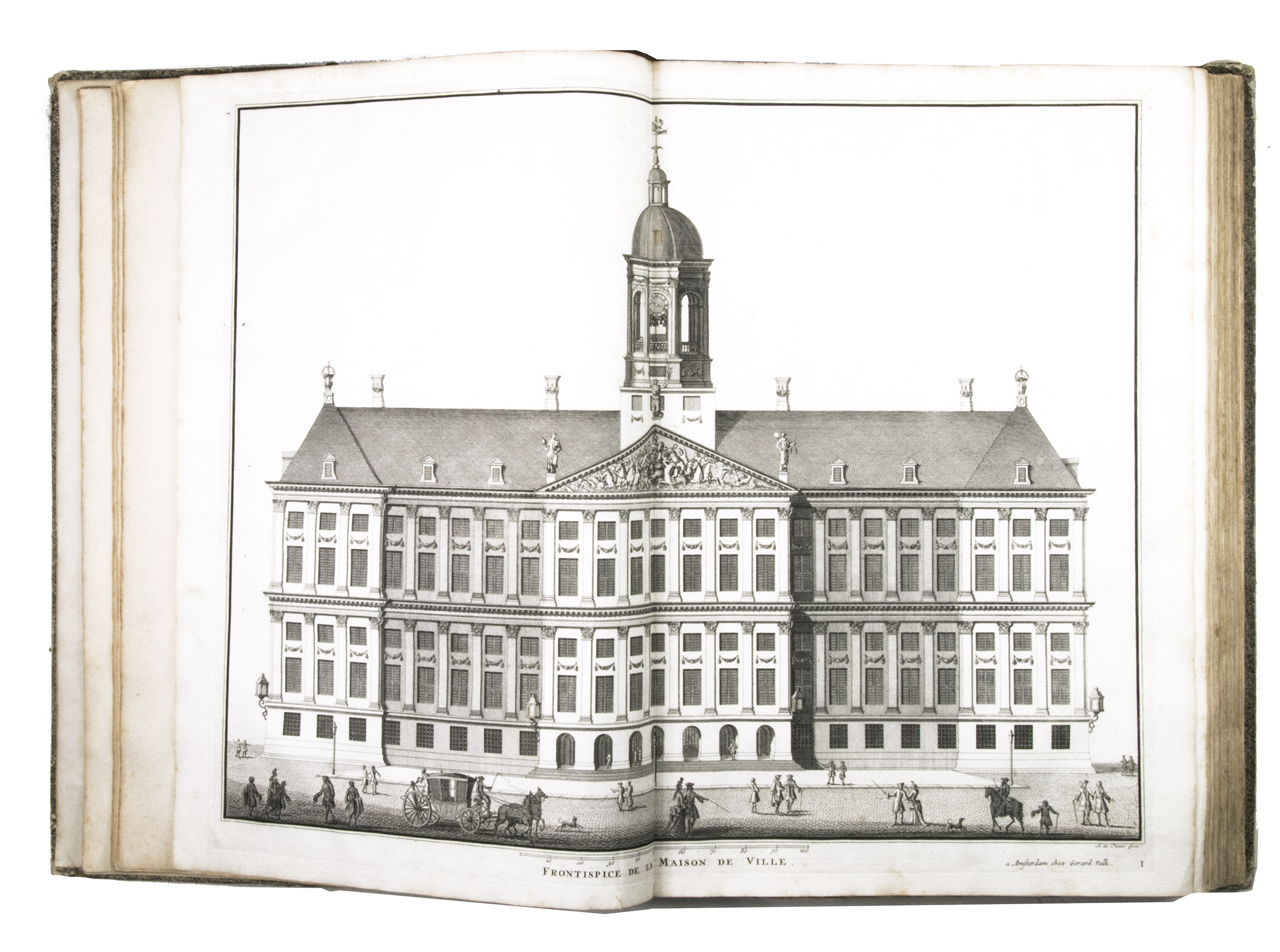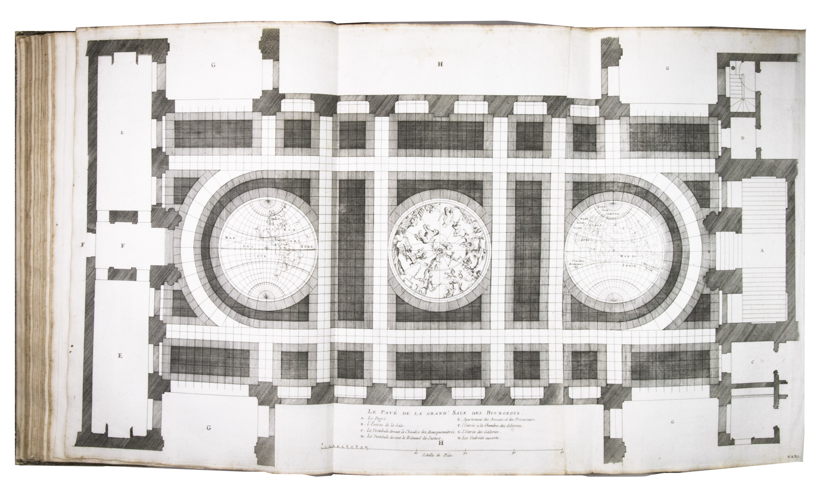 First French edition of Van Campen's famous description of the Amsterdam City Hall (the present day Royal Palace), with more than a hundred plates of the architectural features and sculptures of the building, including ground plans, elevations, and sections of the interior and exterior. Particularly impressive are the giant plates of the tympana, which are more than 160 cm wide when fully unfolded. The work also includes the famous plate of the extraordinary cartographic mosaic floor of the Burgerzaal, which shows the zodiac signs that were originally painted on the celestial map in the middle, but are now no longer visible on the floor itself due to fading.