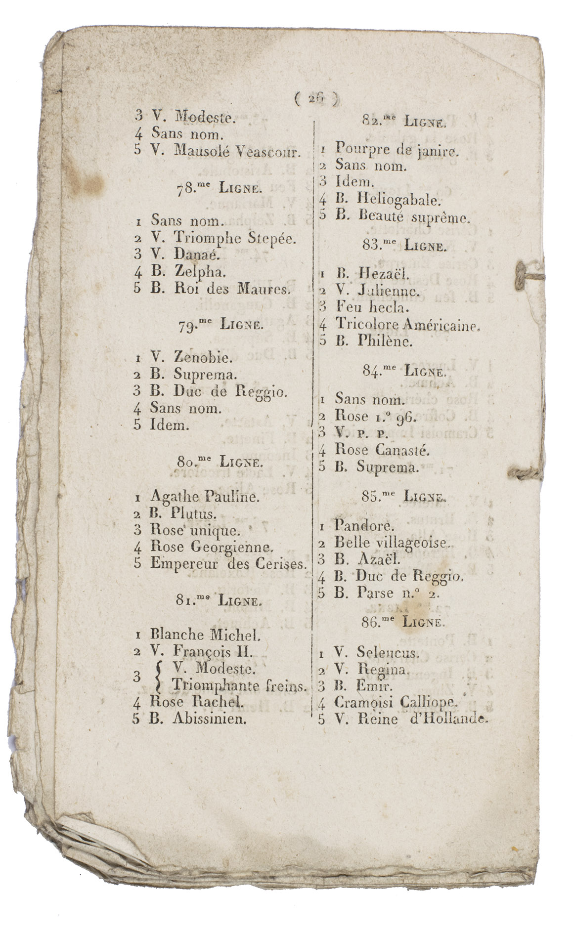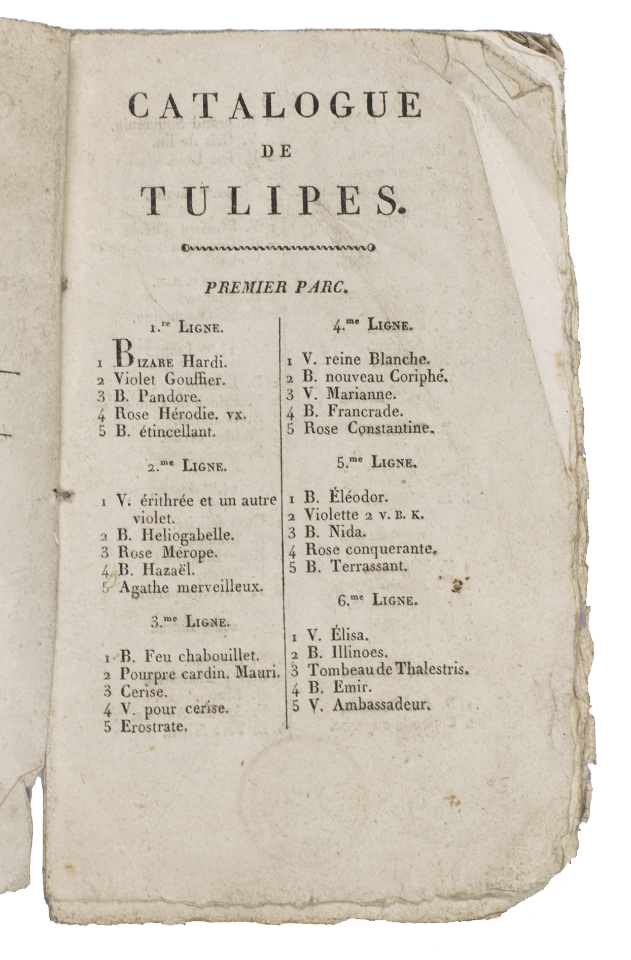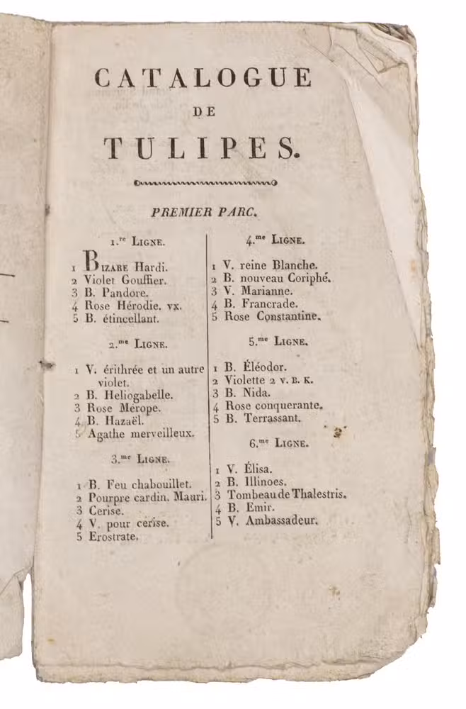 Only known copy of an early 19th-century botanical catalogue of tulips left by a certain Monsieur de Freins. The tulips are presented in the auction catalogue in three "parcs" or "garden plots" of respectively 63, 62, and 86 "lignes" (rows) containing 5 tulips of different varieties each. The collection was sold at the garden of a certain "Sieur Dujardin" at the Rue Terre Neuve in Brussels on the 15th of May 1818.