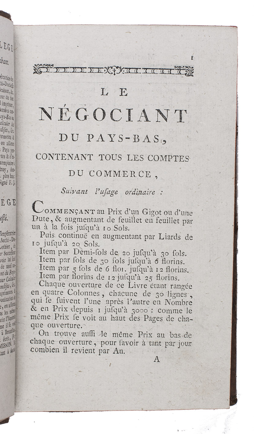 Le négociant du Pays-Bas, ou le tarif général de tous les comptes du commerce; tant pour calculer les monnoyes, les intérêts, répartitions, &c. Que toutes sortes de marchandises, denrées & négoces tant en gros qu'en détail. Onzième édition. Augmenté avec la réduction de l'argent de change de Brabant, en celui courant en Brabant, & celui de l'argent courant de Brabant en celui de change de Brabant. Et un tarif pour connoitre le prix d'une livre de marchandise par le prix du cent.