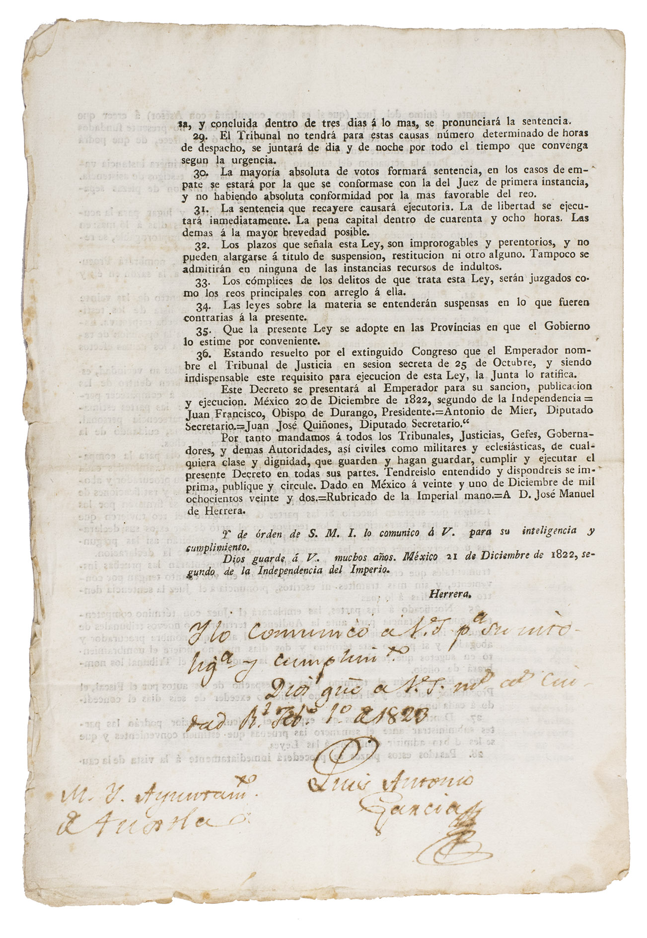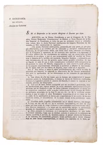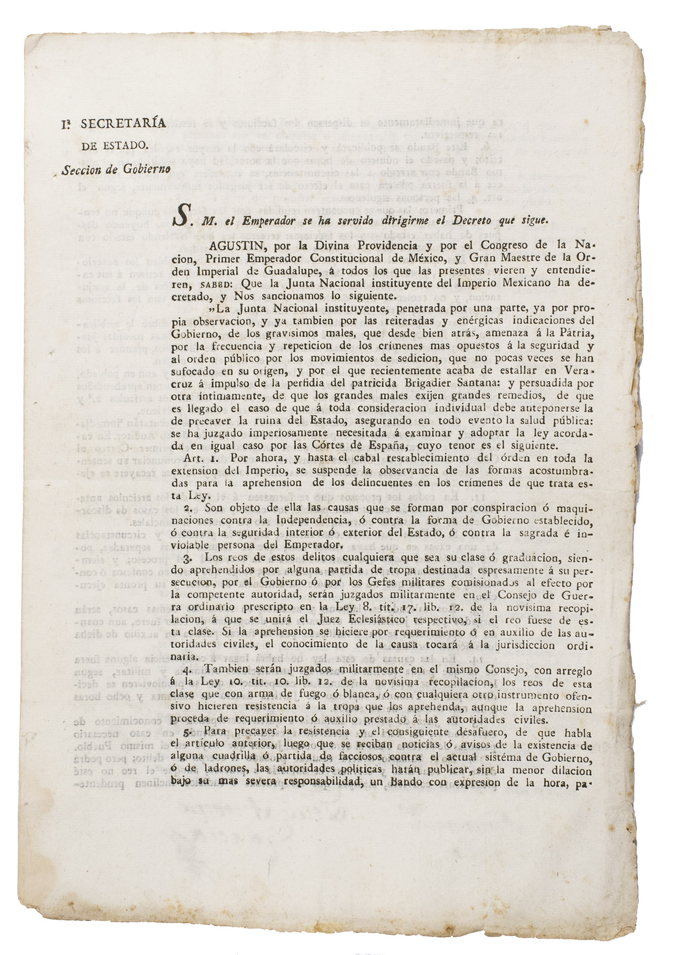 Rare imperial decree issued during the final months of the First Mexican Empire as an attempt to deter political unrest. It was printed in response to a major rebellion which had taken place 19 days earlier in Veracruz to call for the end of Emperor Agustín's reign. The decree suspends regular legal protections for anyone suspected of conspiracy, rebellion, or threats to the Emperor or the state. Instead of going through normal courts, suspects were to be arrested on sight and tried by military tribunals. As Emperor Agustín I (1783-1824) abdicated less than three months later, the present decree offers insight into the ways in which he attempted to hold the Empire together in the face of open rebellion.