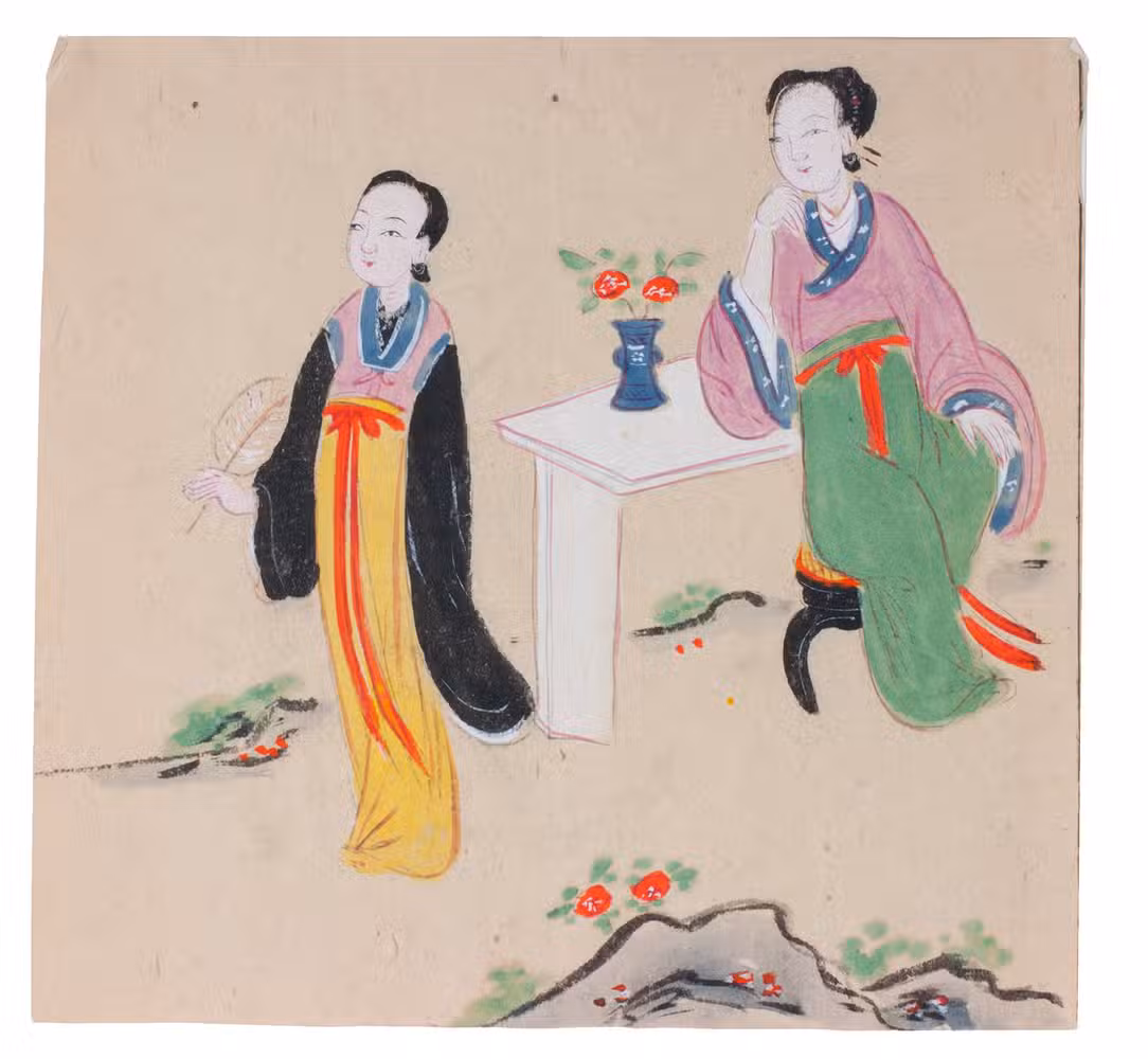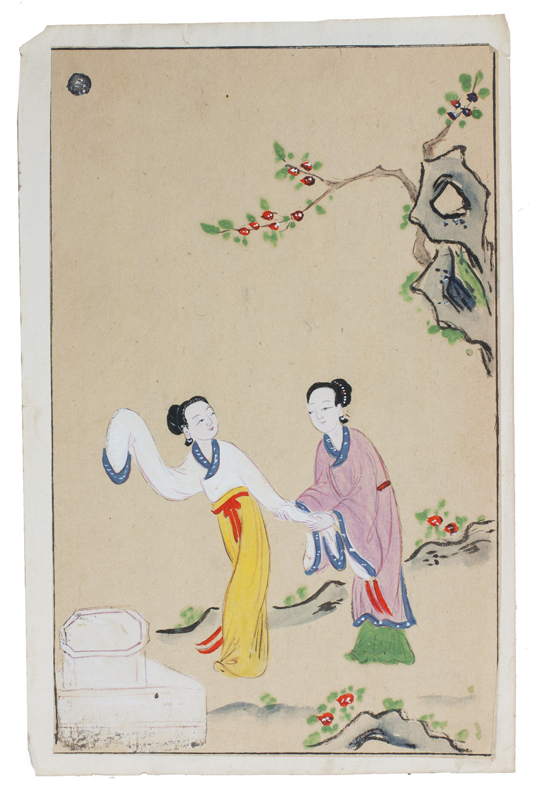 2) 2 ladies, 1 holding the other's sleeve, with a flowering tree and an octagonal stone basin(?).