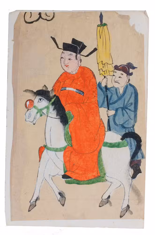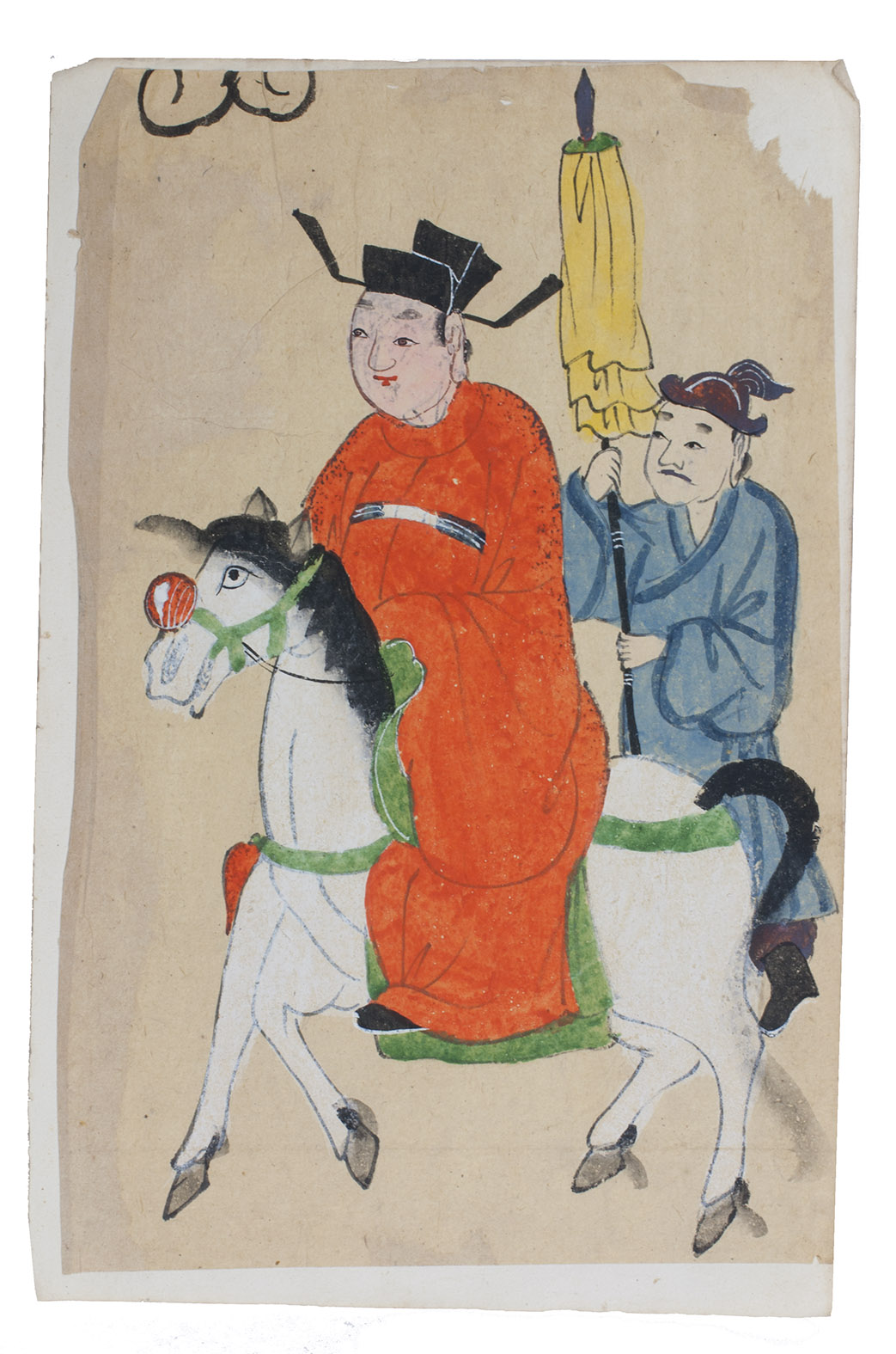 1) a dignitary on horseback, with his attendant on foot carrying a parasol.