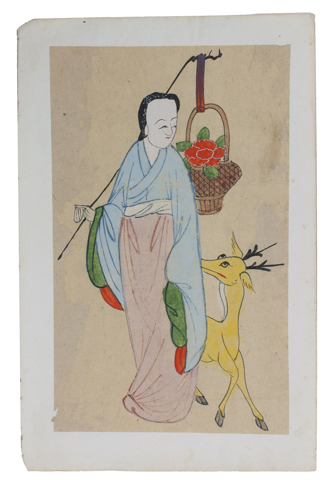 3) a lady with a flowering plant in a basket, with a deer at her side.