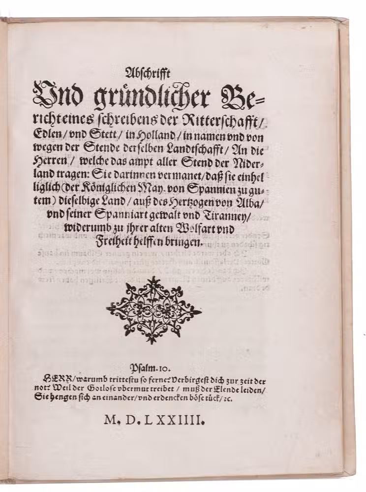 Rare second or third edition of the German translation of an anti-Alva, anti-Spain pamphlet written by the nobility of Holland and representatives of its cities, addressed to the States (in Dutch "Staten", the provincial governments) of and all magistrates in the seventeen provinces of the Low Countries, promulgated at Delft on 12 September 1573 (as noted at the end of the text), but not printed even in the original Dutch before 2 October 1573, when William the Silent, Prince of Orange, wrote to his brothers that the pamphlet was being printed (Groen van Prinsteren). That is just before Alva was dismissed on 19 October and left the country on 18 December 1573.