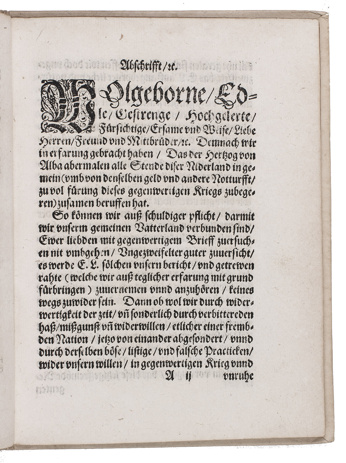 Abschrifft und gruendlicher Bericht eines schreibens der Ritterschafft, Edlen, und Stett, in Holland, in namen und von wegen der Stende derselben Landtschafft, an die Herren, welche das ampt aller Stend der Niderland tragen: Sie darinnen vermanet, dass sie einhelliglich (der Koeniglichen Man von Spannien zu gutem) dieselbige Land, auss des Hertzogen von Alba, und seiner Spanniart gewalt und Tiranney, widerumb zu ihrer alten Welfart und Freiheit helffen bringen.