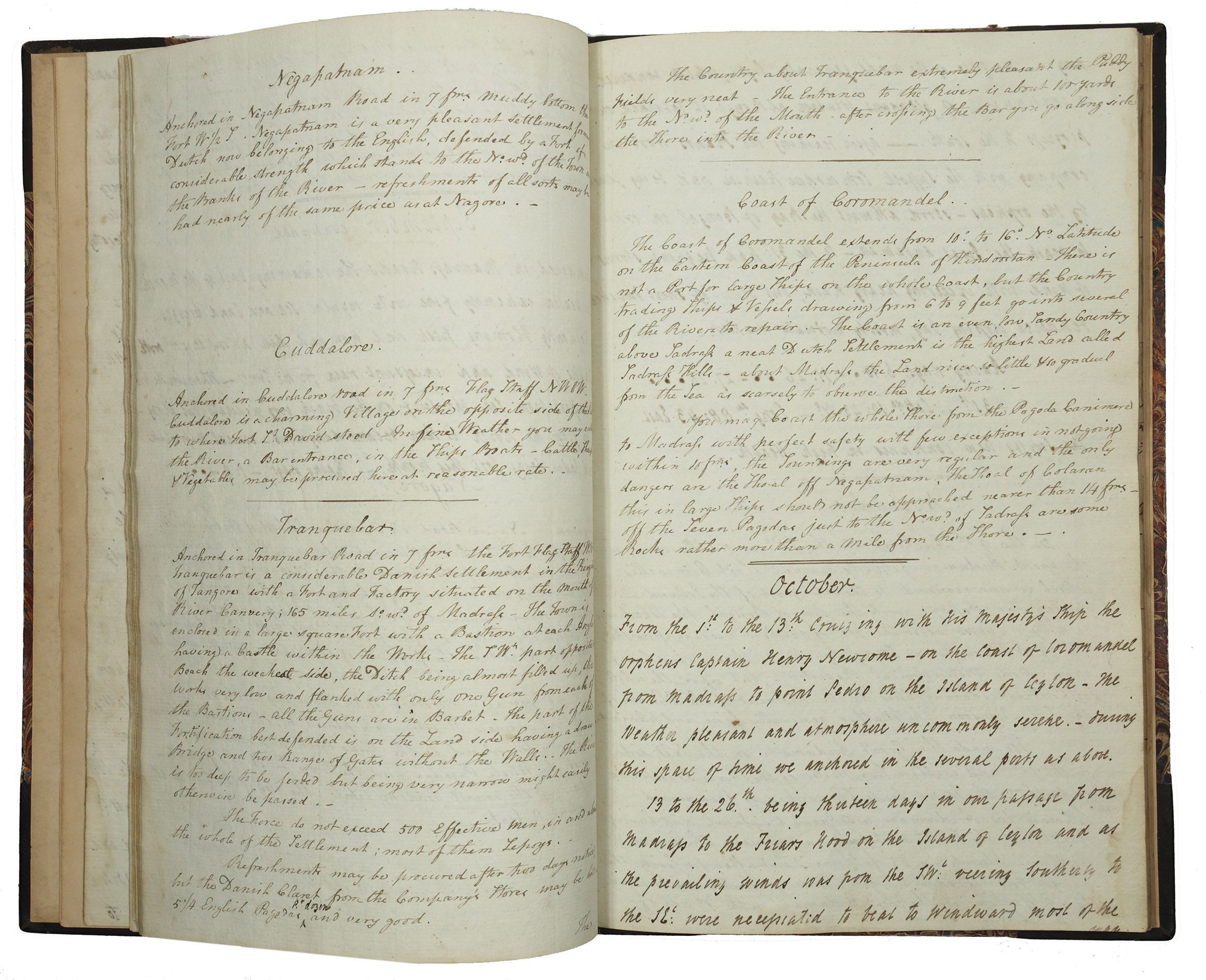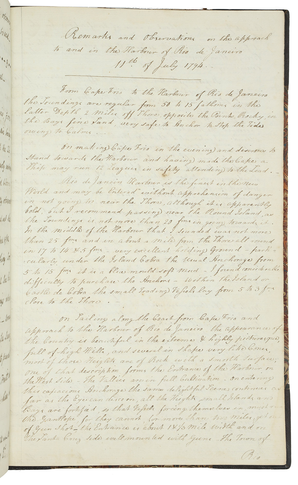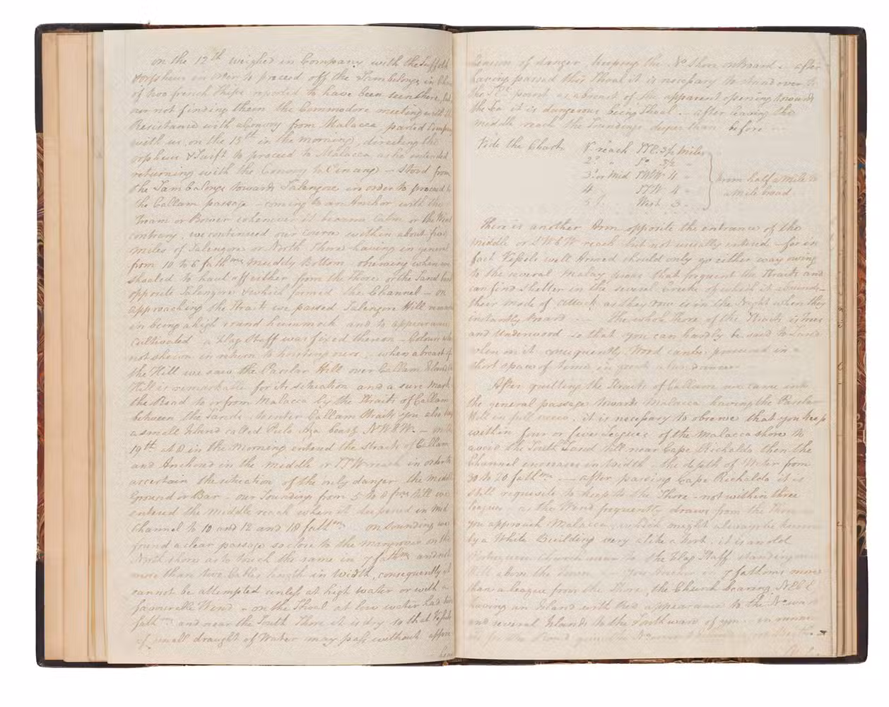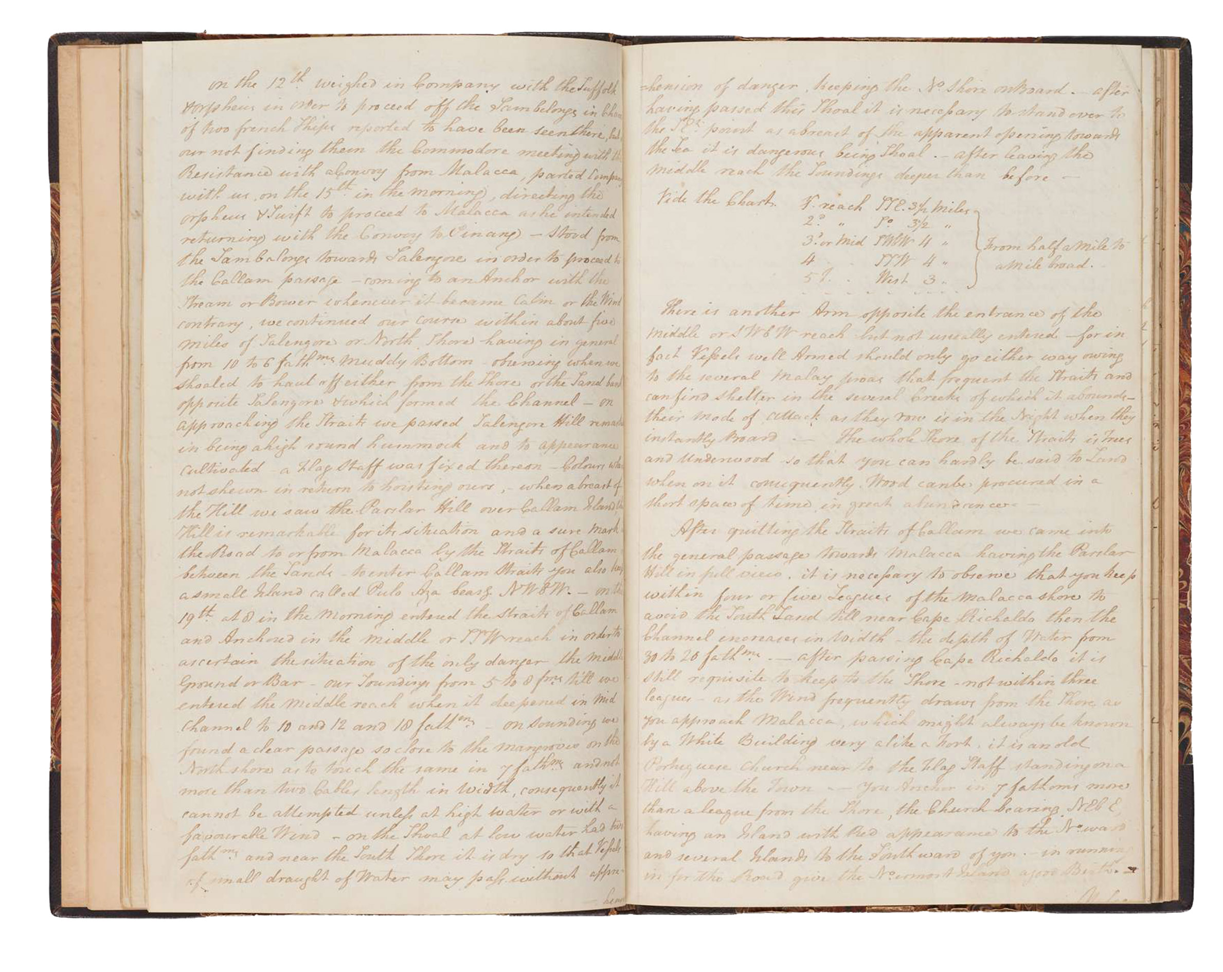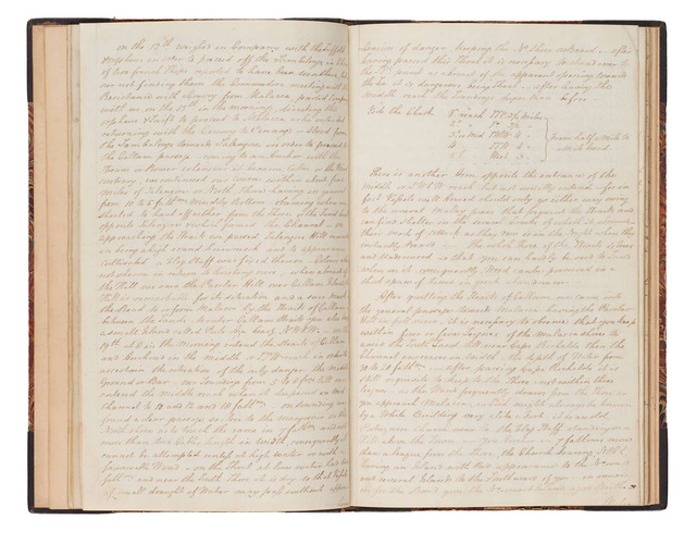 [Various places, including Saudi Arabia and Yemen, ca. 1796]. Small folio (ca. 19 x 30.5 cm. English manuscript on watermarked paper. With a loosely inserted manuscript map titled "A Chart shewing the Track of HMS Ship Myrtle" of the Bay of Biscay and Portugal, and a hand-coloured manuscript signal chart. Contemporary or slightly later half black morocco, marbled boards. 48 ll.