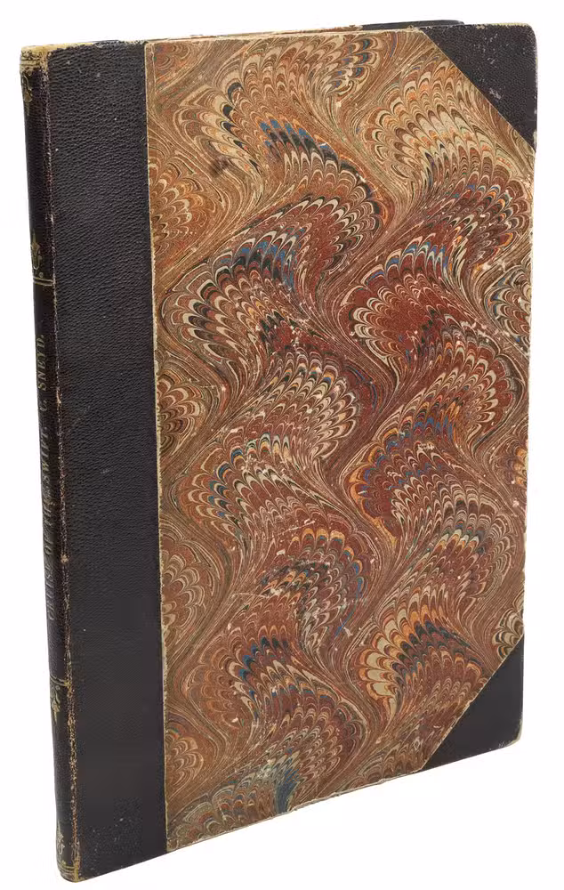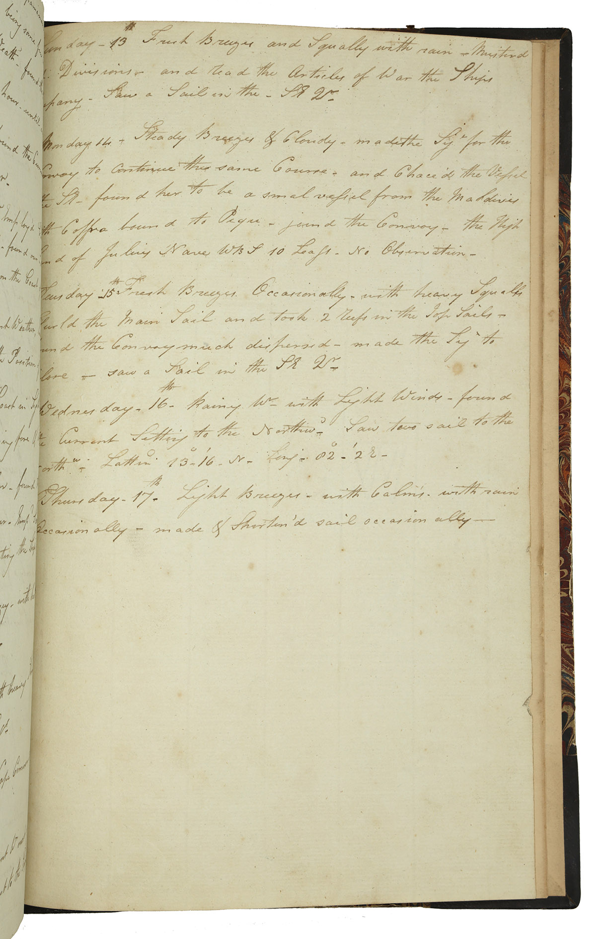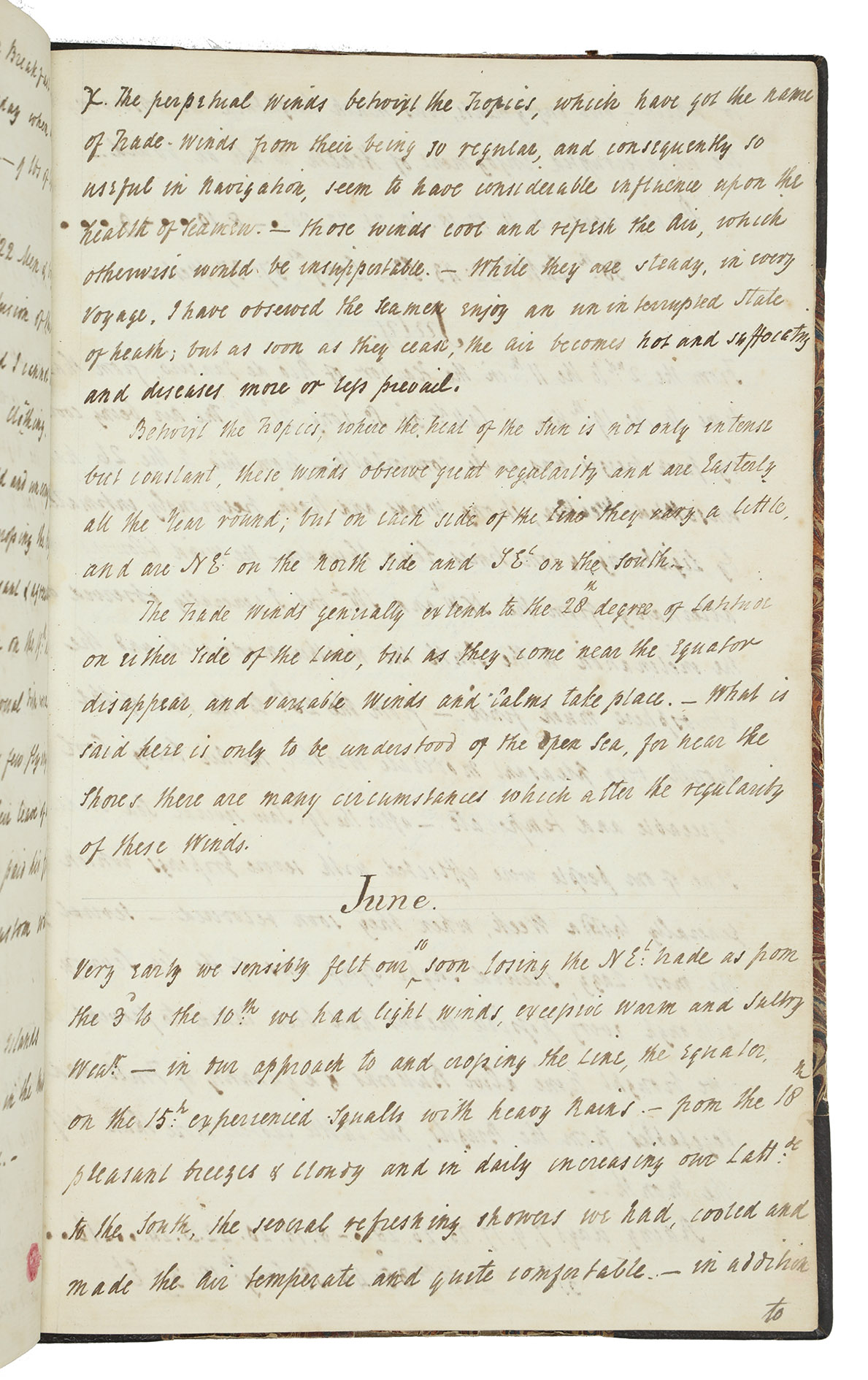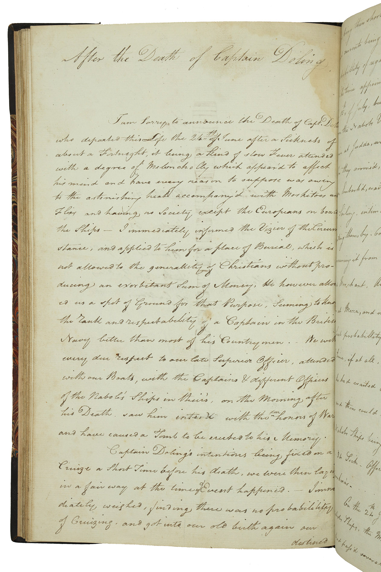 [Various places, including Saudi Arabia and Yemen, ca. 1796]. Small folio (ca. 19 x 30.5 cm. English manuscript on watermarked paper. With a loosely inserted manuscript map titled "A Chart shewing the Track of HMS Ship Myrtle" of the Bay of Biscay and Portugal, and a hand-coloured manuscript signal chart. Contemporary or slightly later half black morocco, marbled boards. 48 ll.