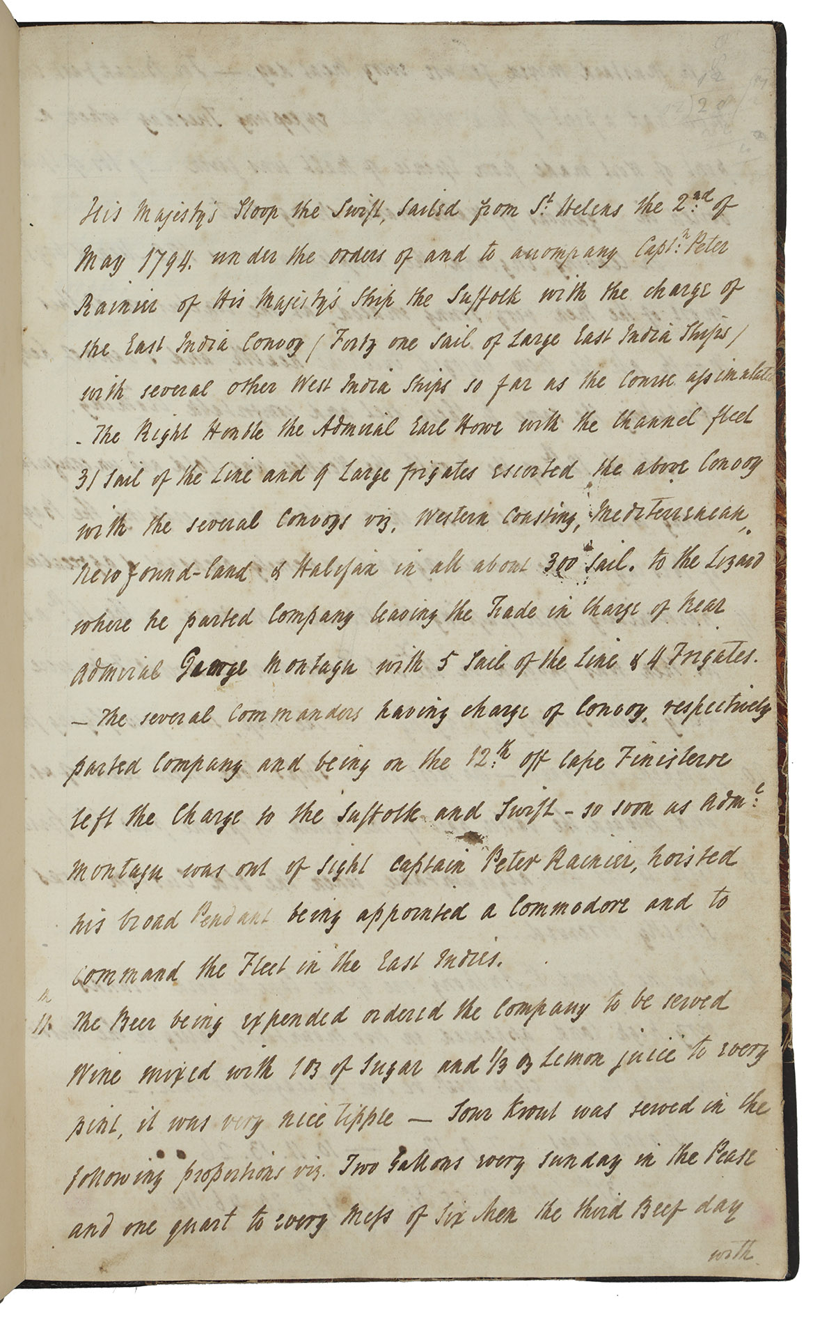 The Swift appears to be one of the ships which accompanied the Suffolk (a 64-gun ship) to escort a convoy to India, under the command of Captain Peter Rainier (1741-1808, later Admiral of the Blue and namesake of Mount Rainier). This particular voyage was in itself notable as a trial for the implementation of a citrus diet for sailors to ward off scurvy, which was ultimately successful and became Admiralty policy the following year. On the first page of the account we find the following: "The beer being expended ordered the Company to be served wine mixed with 1oz of sugar and ?oz of lemon juice to every pint, it was very nice tipple."