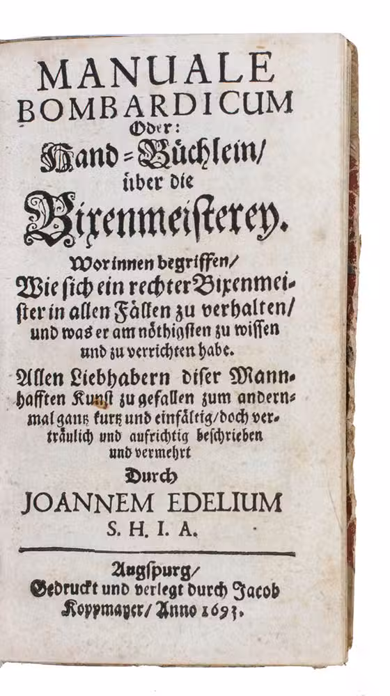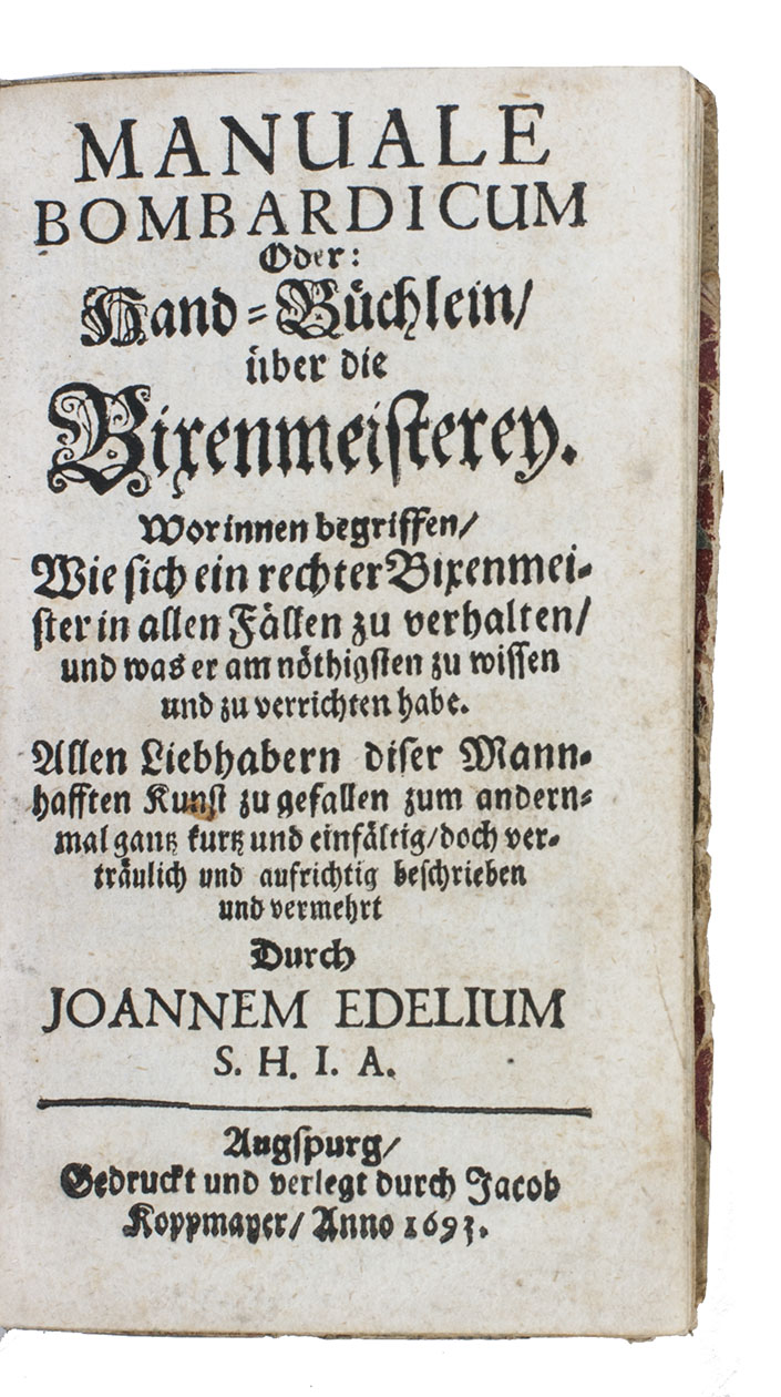 Second copy located, of the expanded second edition of a concise artillery manual. The present edition notes only that it was " ... beschrieben und vermehrt durch Joannem Edelium", but it is almost certainly an expanded edition of the same publisher's 1685 work with the same title, which explicitly notes Johann Eugenius as its author. Jähns approvingly says about this rare 1685 edition: "Das kleine, für die Brusttasche eingerichtete Büchlein ist prachtig angeordent und mit ganz guten Zeichnungen ausgestattet".