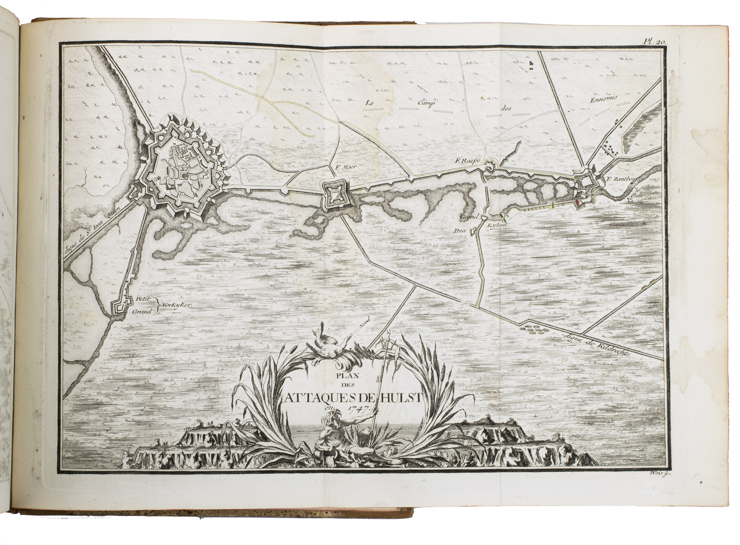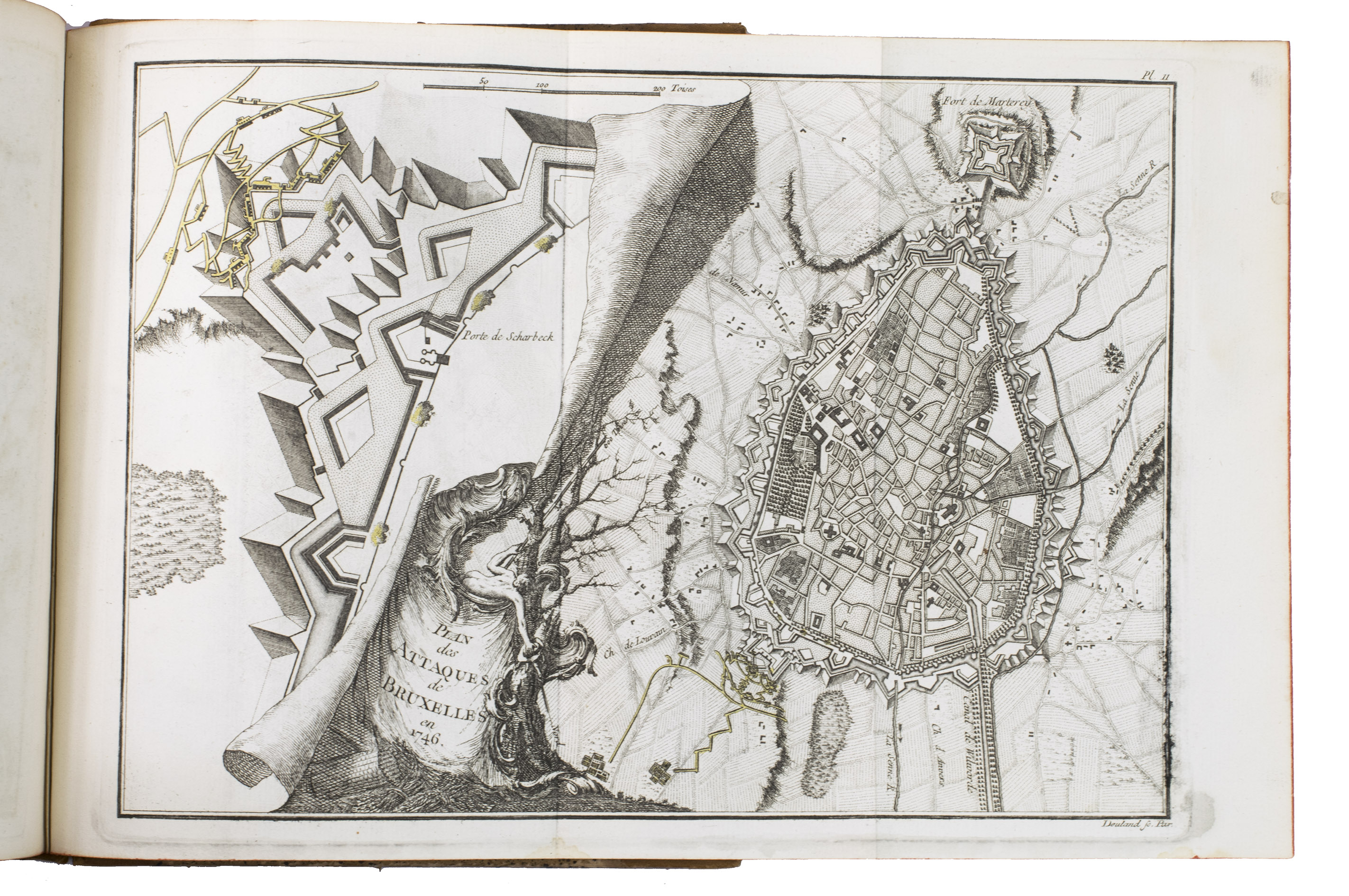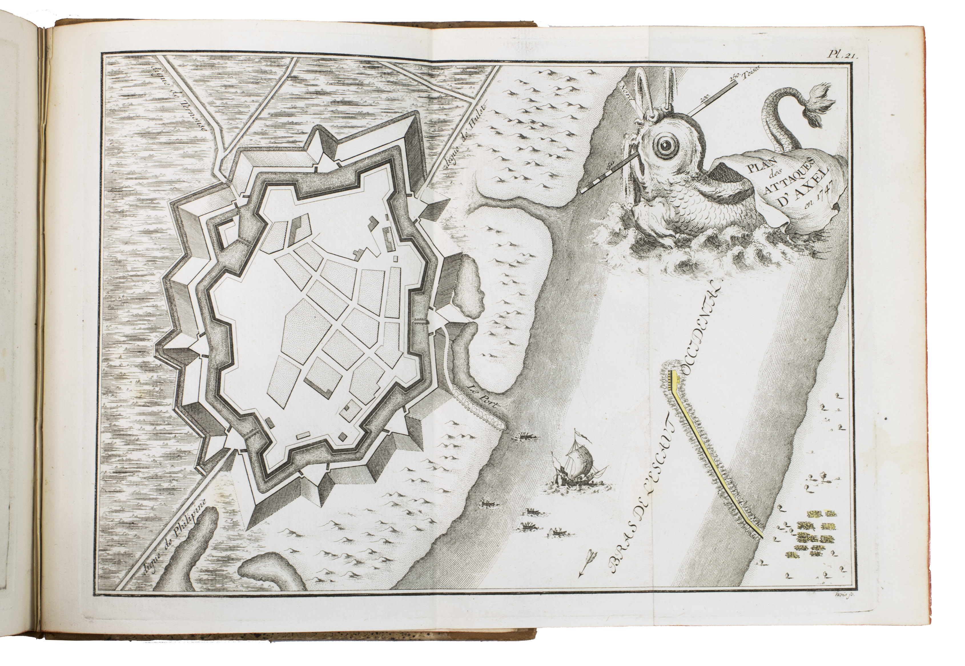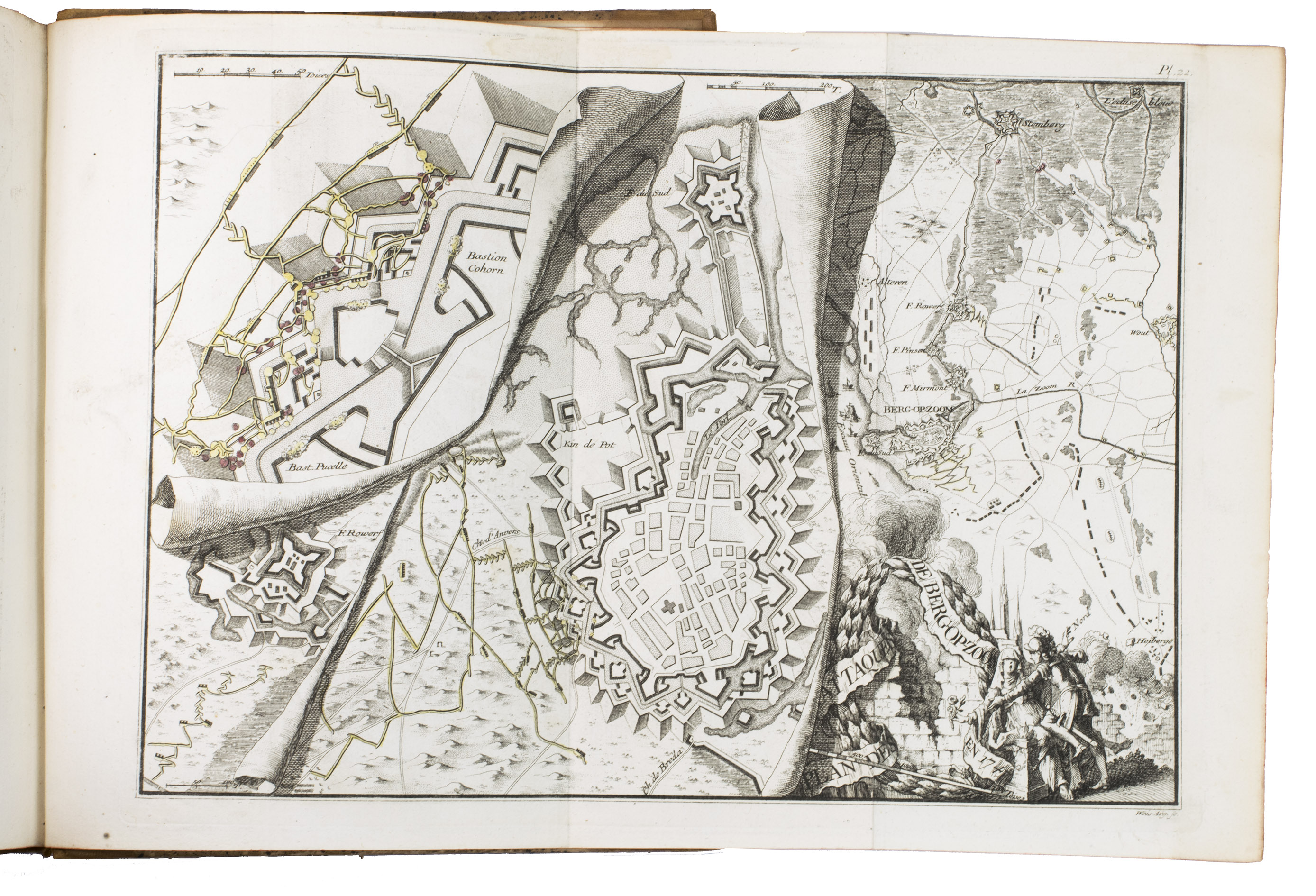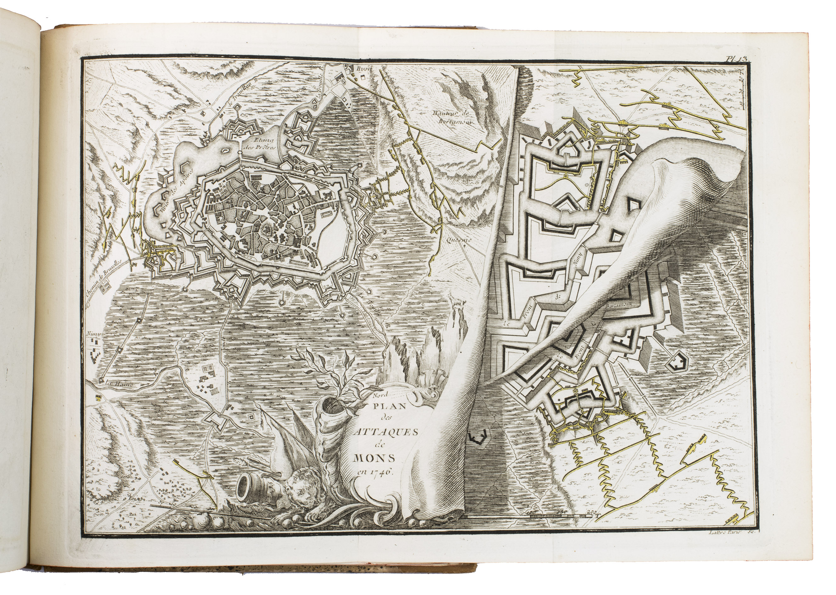 First edition, one of the two simultaneously published issues, of a richly illustrated account of sieges of Flemish towns during the War of the Austrian Succession (1740-1748). The two authors, Jakob Funck and Marc Guérard d'Illens, both captain in the French army, dedicated the book to the French minister of war, the Count of Argenson. The book is divided into 24 "journals", each describing the siege of a different town in Flanders in chronological order, starting at the siege of Menin in 1744 and ending with Maastricht in 1748. Each journal has its own folding plate, showing a ground plan of the besieged city and its fortifications with the "plan des attaques" highlighted in yellow. Included after the preliminaries is a table with a survey of the besieged towns, with the dates of the sieges, the days the battles took place, and the names of the leaders of the attacking and defending army. The map and plans are detailed and finely drawn, decorated with cherubs, monsters, ships, frogs, loving couples, soldiers, and some have additional artistic value, with maps with enlarged details rolled out on top of another map.