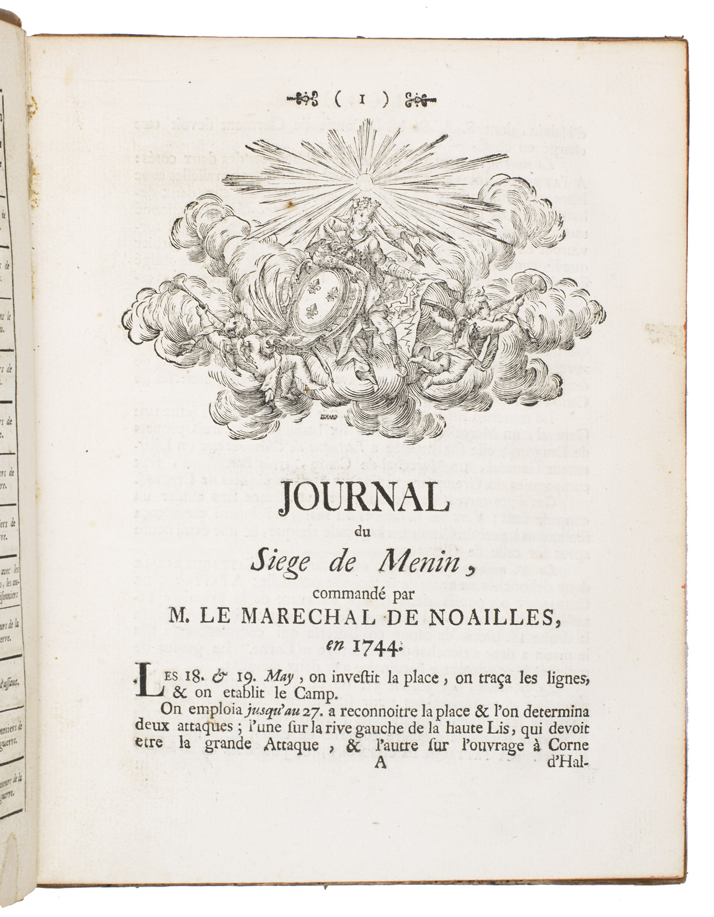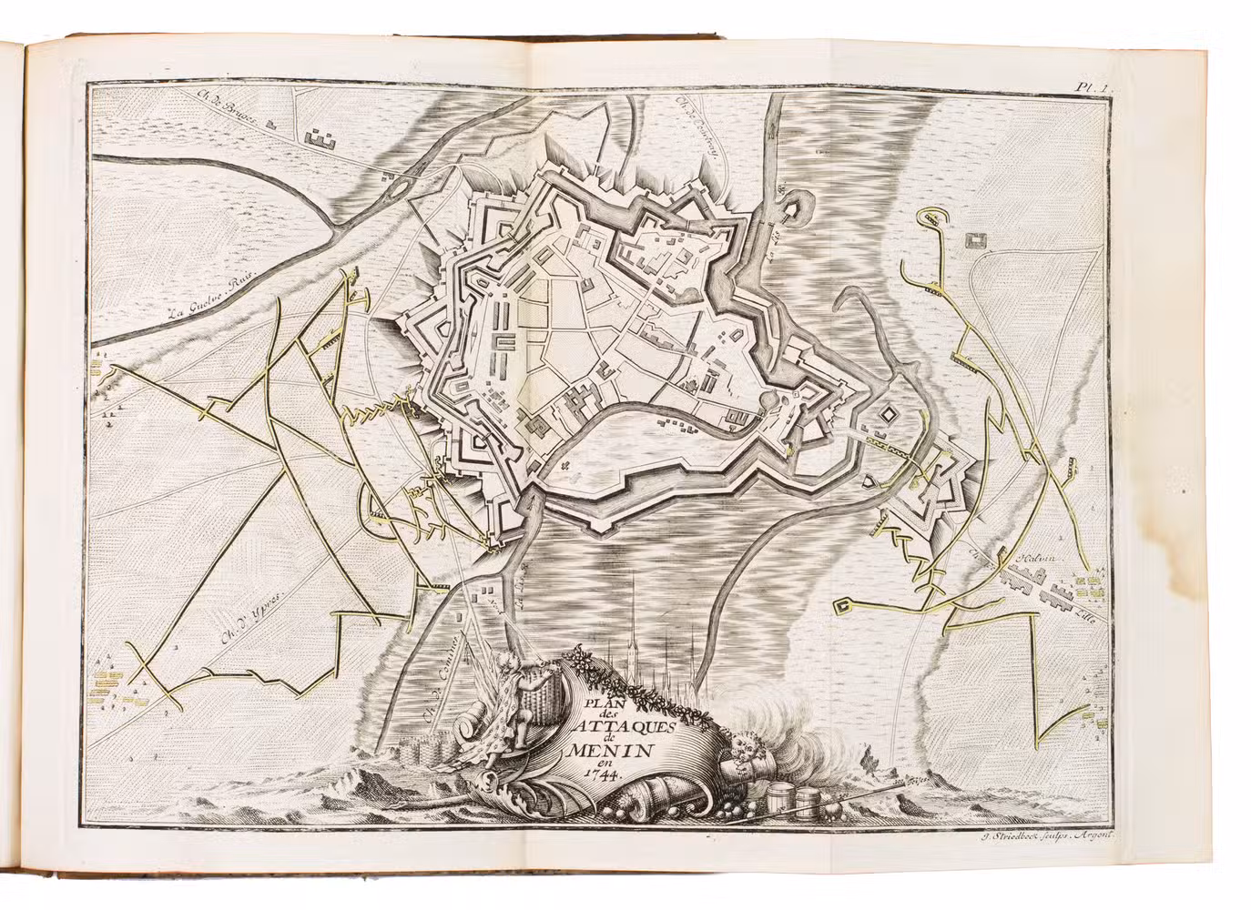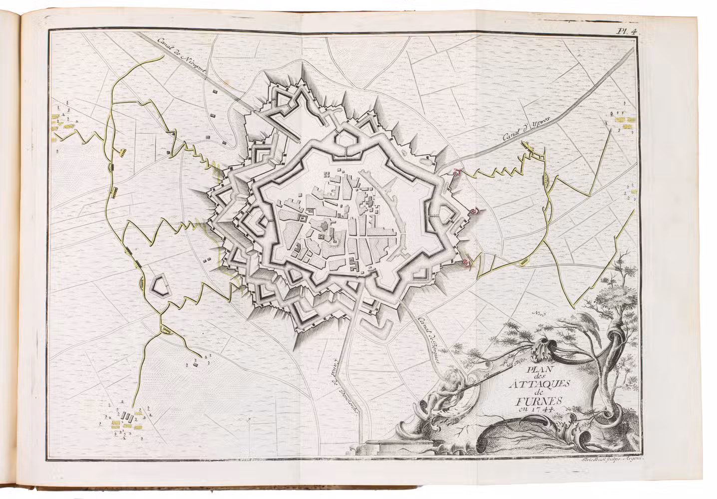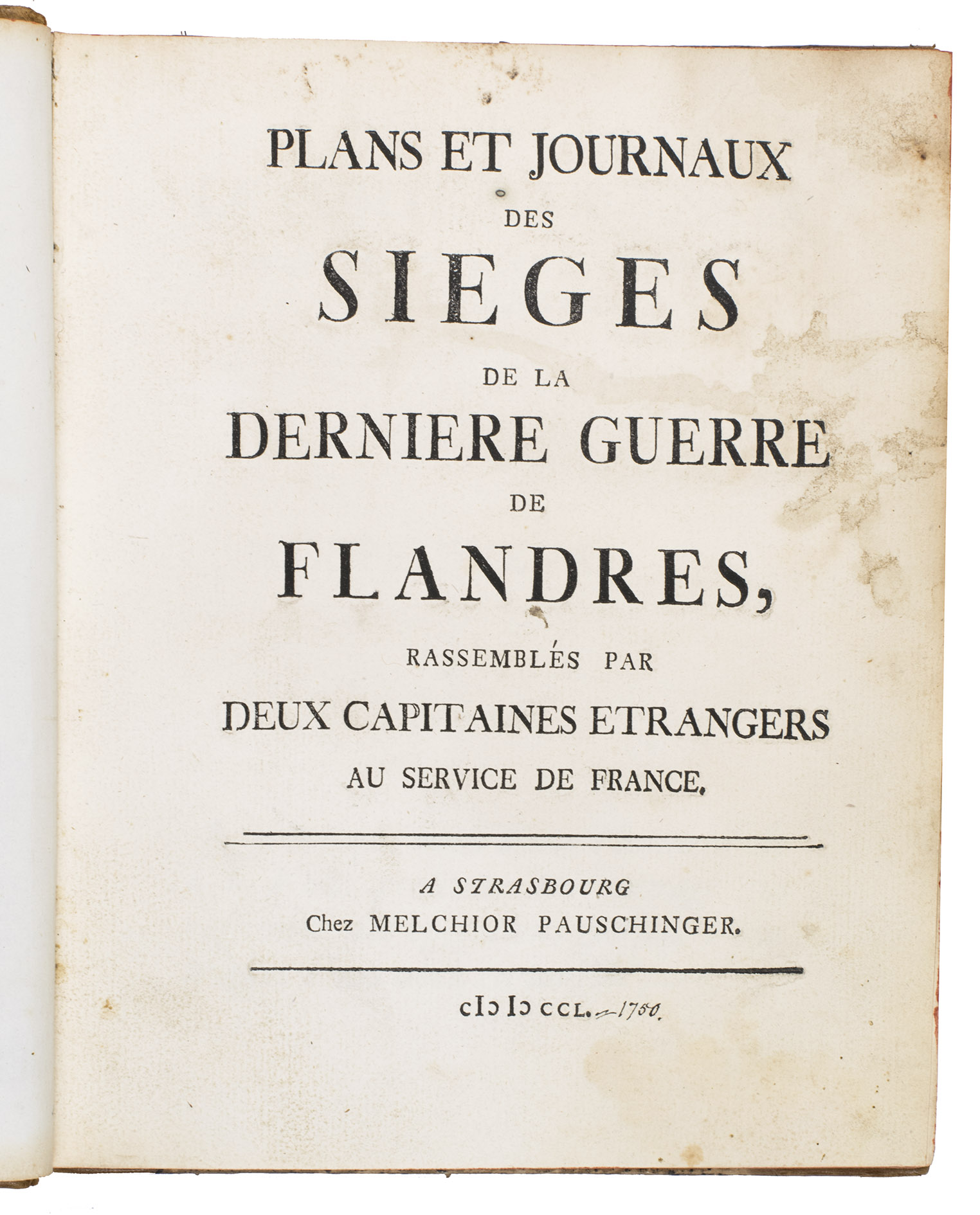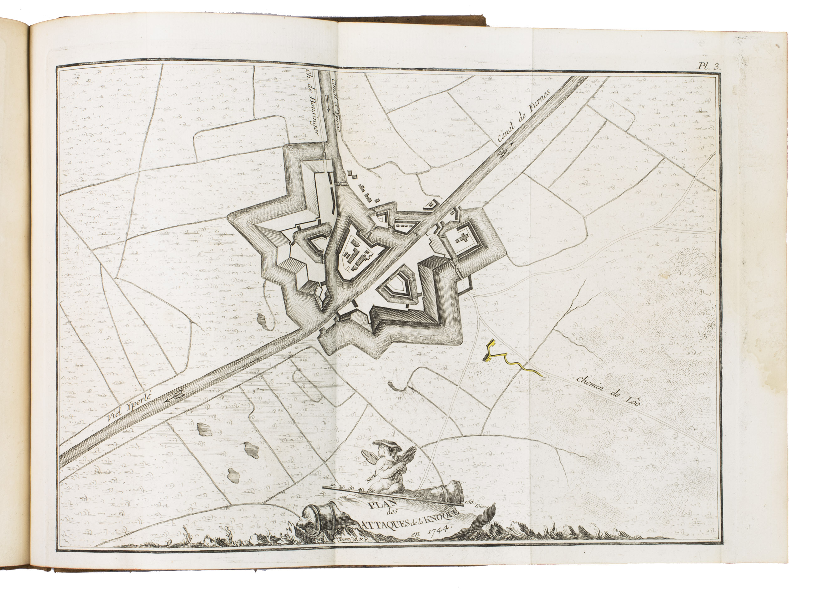 First edition, one of the two simultaneously published issues, of a richly illustrated account of sieges of Flemish towns during the War of the Austrian Succession (1740-1748). The two authors, Jakob Funck and Marc Guérard d'Illens, both captain in the French army, dedicated the book to the French minister of war, the Count of Argenson. The book is divided into 24 "journals", each describing the siege of a different town in Flanders in chronological order, starting at the siege of Menin in 1744 and ending with Maastricht in 1748. Each journal has its own folding plate, showing a ground plan of the besieged city and its fortifications with the "plan des attaques" highlighted in yellow. Included after the preliminaries is a table with a survey of the besieged towns, with the dates of the sieges, the days the battles took place, and the names of the leaders of the attacking and defending army. The map and plans are detailed and finely drawn, decorated with cherubs, monsters, ships, frogs, loving couples, soldiers, and some have additional artistic value, with maps with enlarged details rolled out on top of another map.