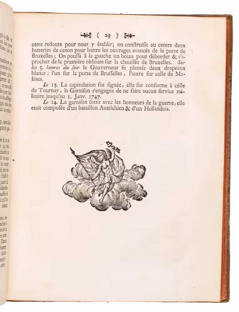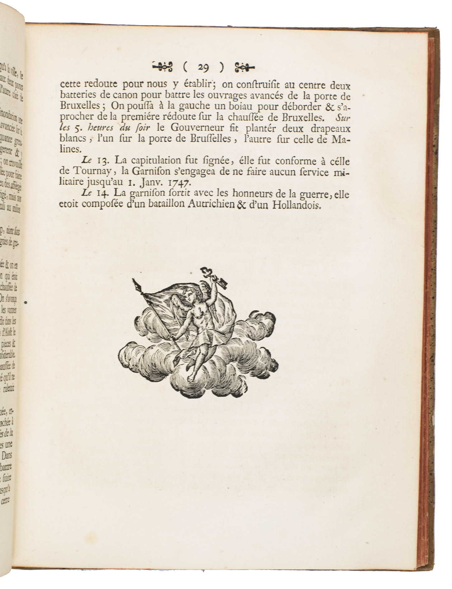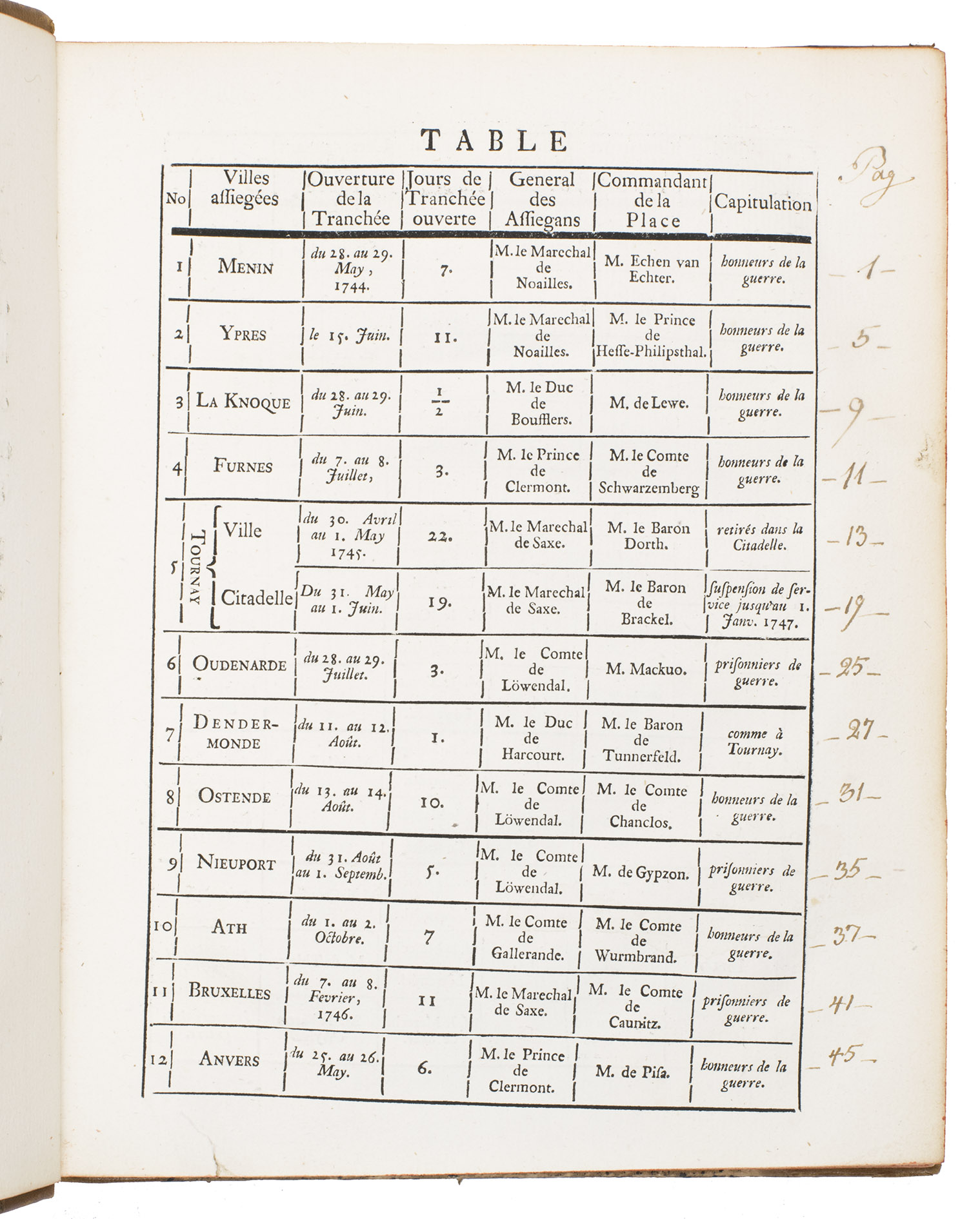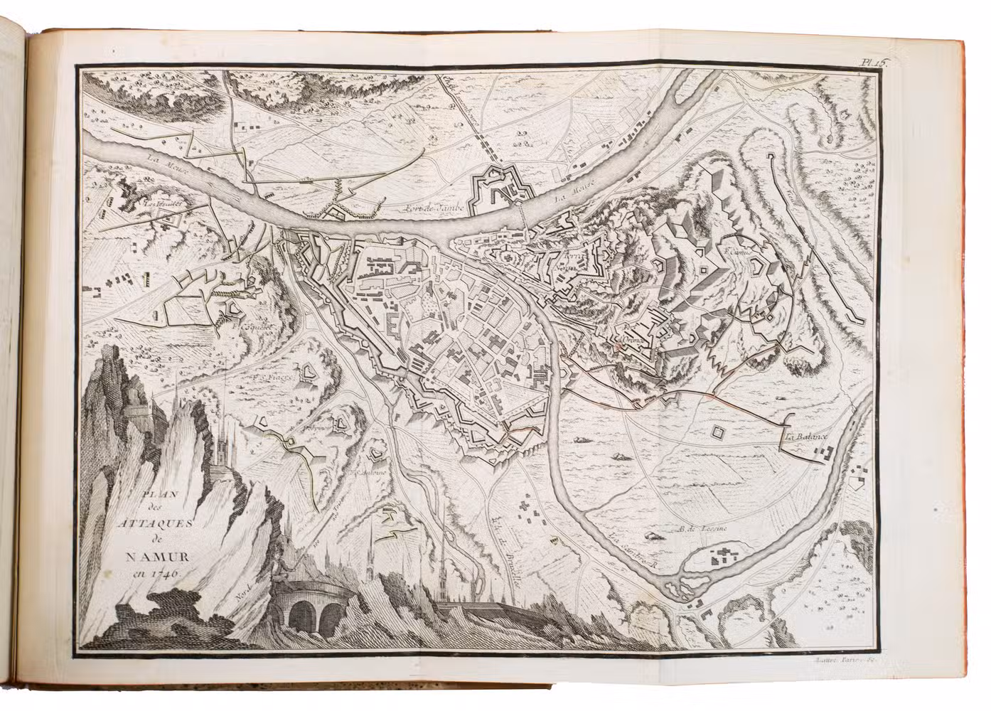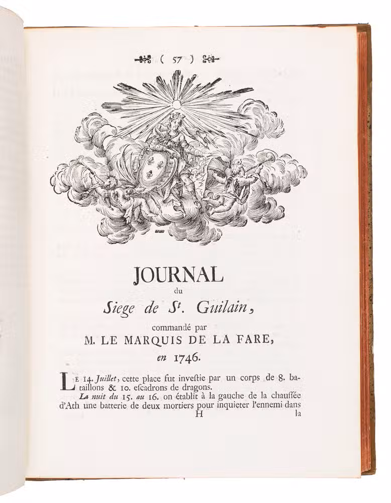 First edition, one of the two simultaneously published issues, of a richly illustrated account of sieges of Flemish towns during the War of the Austrian Succession (1740-1748). The two authors, Jakob Funck and Marc Guérard d'Illens, both captain in the French army, dedicated the book to the French minister of war, the Count of Argenson. The book is divided into 24 "journals", each describing the siege of a different town in Flanders in chronological order, starting at the siege of Menin in 1744 and ending with Maastricht in 1748. Each journal has its own folding plate, showing a ground plan of the besieged city and its fortifications with the "plan des attaques" highlighted in yellow. Included after the preliminaries is a table with a survey of the besieged towns, with the dates of the sieges, the days the battles took place, and the names of the leaders of the attacking and defending army. The map and plans are detailed and finely drawn, decorated with cherubs, monsters, ships, frogs, loving couples, soldiers, and some have additional artistic value, with maps with enlarged details rolled out on top of another map.