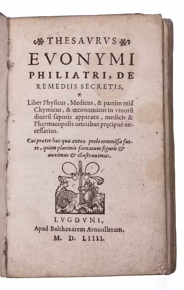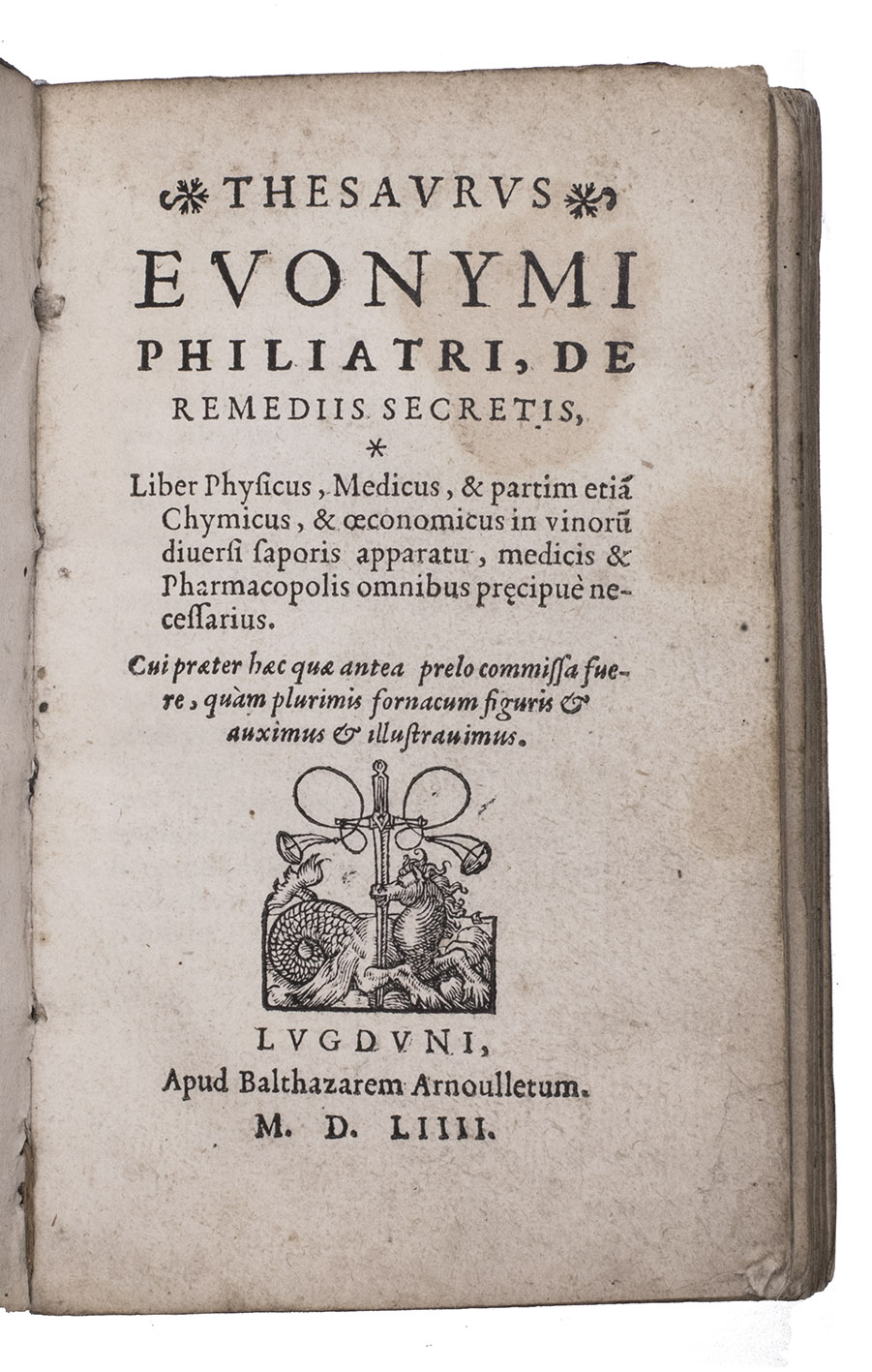 Conrad Gesner (1516-1565), a Zurich scholar of remarkable breadth who wrote on bibliography, botany, zoology, medicine and pharmacology, published the first volume of his De remediis secretis in 1552 under the pseudonym Euonymus Philiatrus. A second part appeared posthumously.