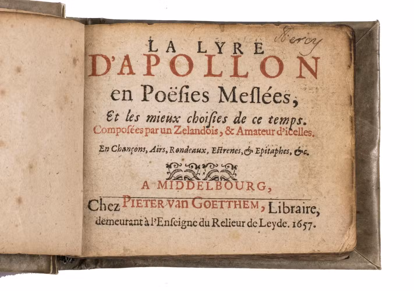 La lyre d'Apollon en poësies meslées, et les mieux choisies de ce temps. Composées par un Zelandois, & amateur dicelles. En cançons, Aïrs, rondeaux, estrenes, & epitaphes, &c.