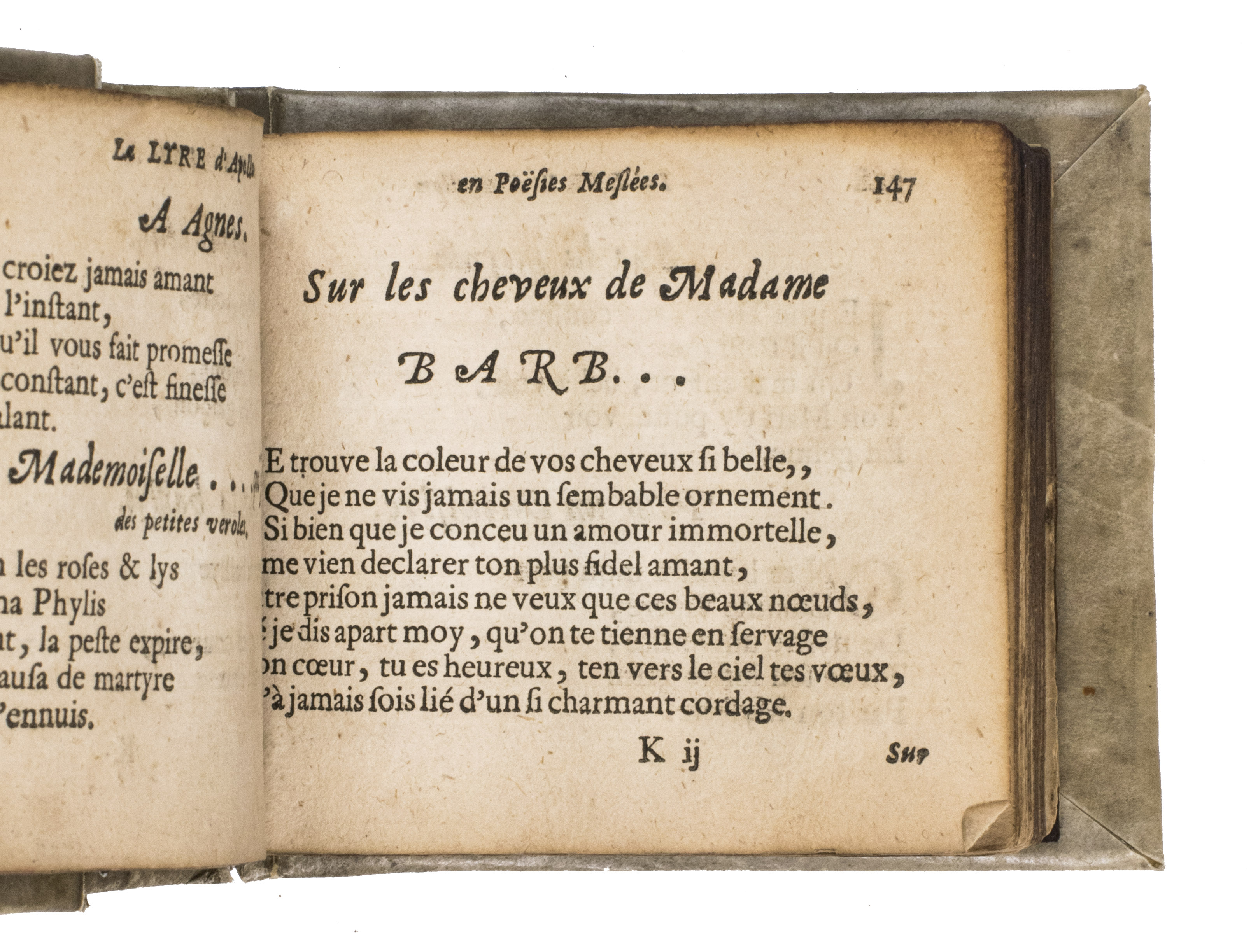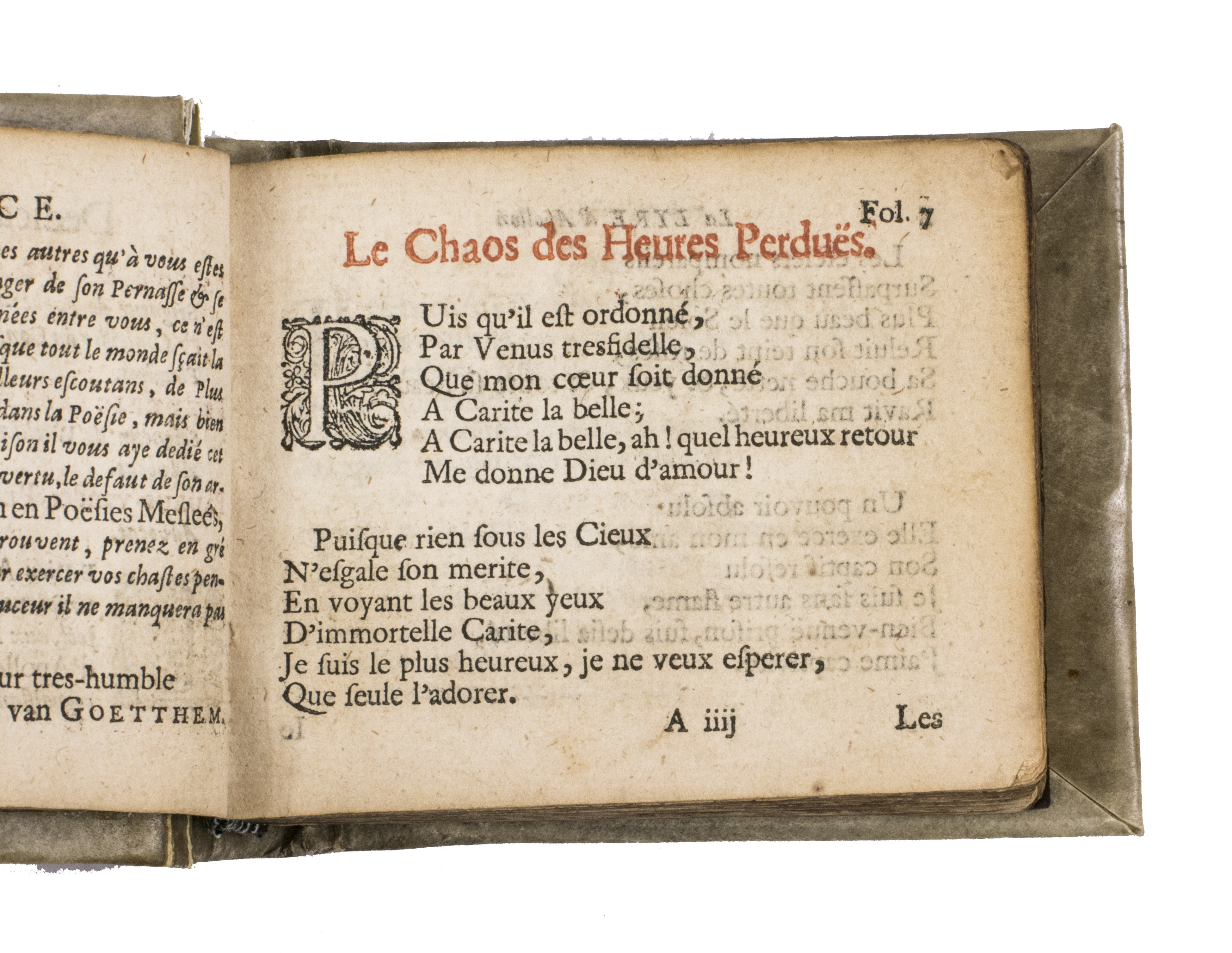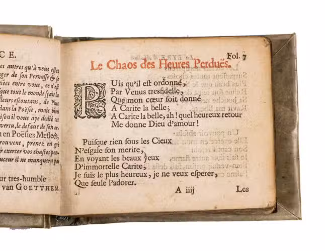 Very rare songbook containing almost 700 short poems in French on various topics, such as friendship, wine, and religion, also including several erotic love poems. It was written by "un Zelandois, & amateur dicelles", which was probably the publisher, Pieter van Goetthem (died after 1679), himself. Born in Leiden he moved to Middelburg where he was inscribed as bookbinder, printer, and publisher. He was also a member of the Chamber of Rhetoric at Middelburg. The first edition of the present work was published in Amsterdam in 1656. The present copy is the second edition, which is quite rare, as the Universal short title catalogue (USTC) records only five copies in libraries, and we have only been able to trace two copies in sales records of the last hundred years.