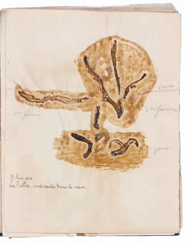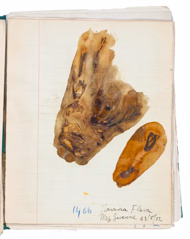 A collection of original samples of 23 varieties of mushroom, mounted on paper leaves or bifolia and dried, with manuscript notes providing information about the samples and with an occasional pencil drawing. Most give the name of the mushroom (in Latin or French) and the date and/or place where it was collected. Most were collected in or around Paris or within a few hours travel of Paris. The earliest two, both dated 19 October 1862, give much more detailed information written on a pre-printed (lithographed?) form in script lettering.