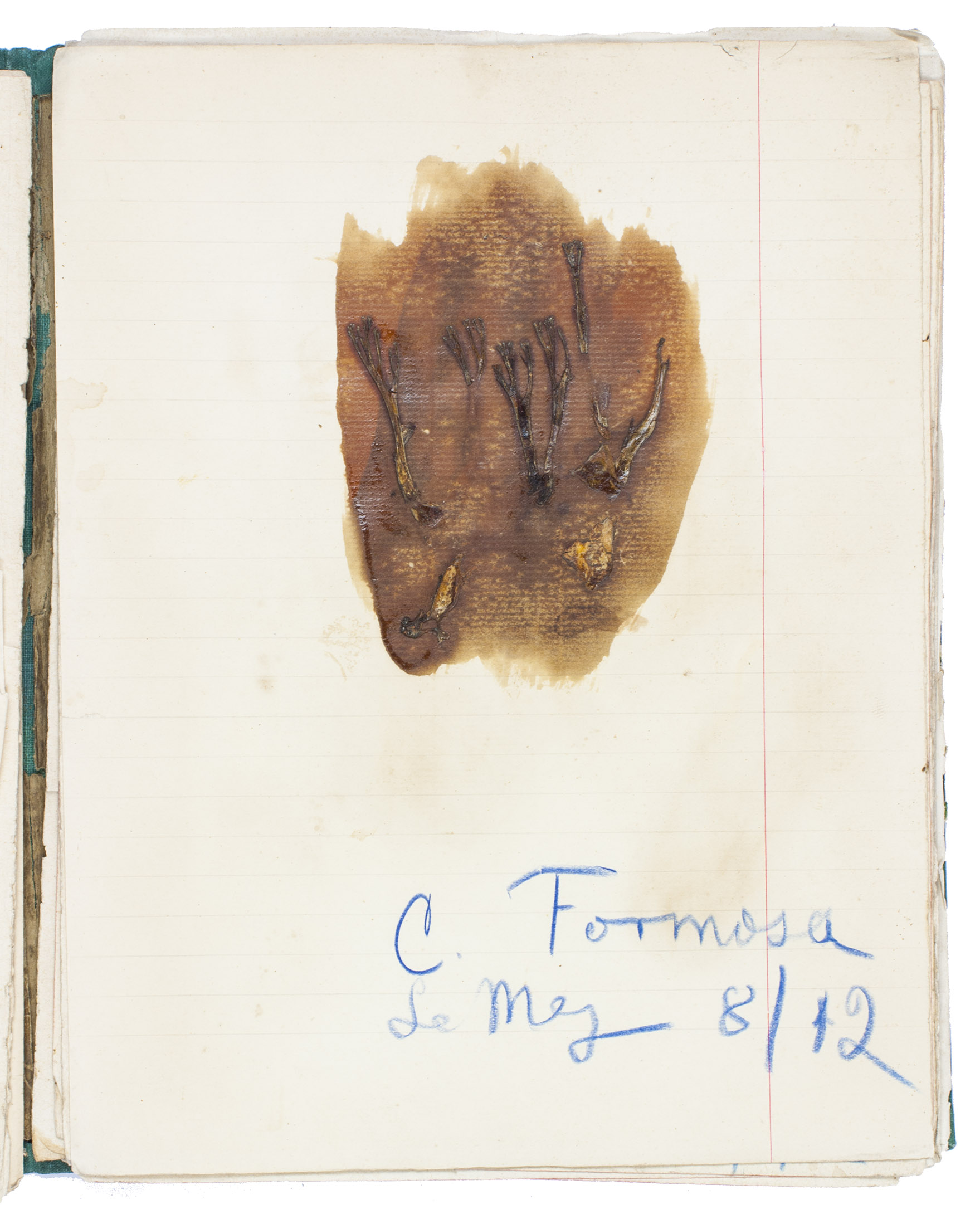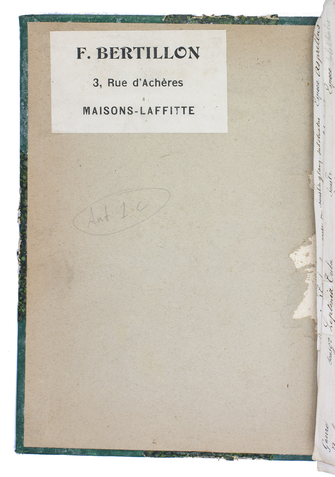 On the front paste-down is a letterpress label with name and address, "F. Bertillon|3, Rue d'Achères|Maison-Laffitte", the name repeated in a similar label on the front board. This may be François Bertillon (b. 1889), the grandson of the Paris mycologist Louis-Adolphe Bertillon (1821-1883), whose family had a residence at Maison-Laffitte, outside Paris. Louis-Adolphe was the father and François the nephew of the anthropologist Alphonse Bertillon. The samples collected in 1862 and 1869, particularly those of 1862 with the data methodically and scientifically noted on a pre-printed form, were probably described by Louis-Adolphe. François probably found his late grandfather's samples and notes and began collecting himself around 1911, when he would have been 22 years old.