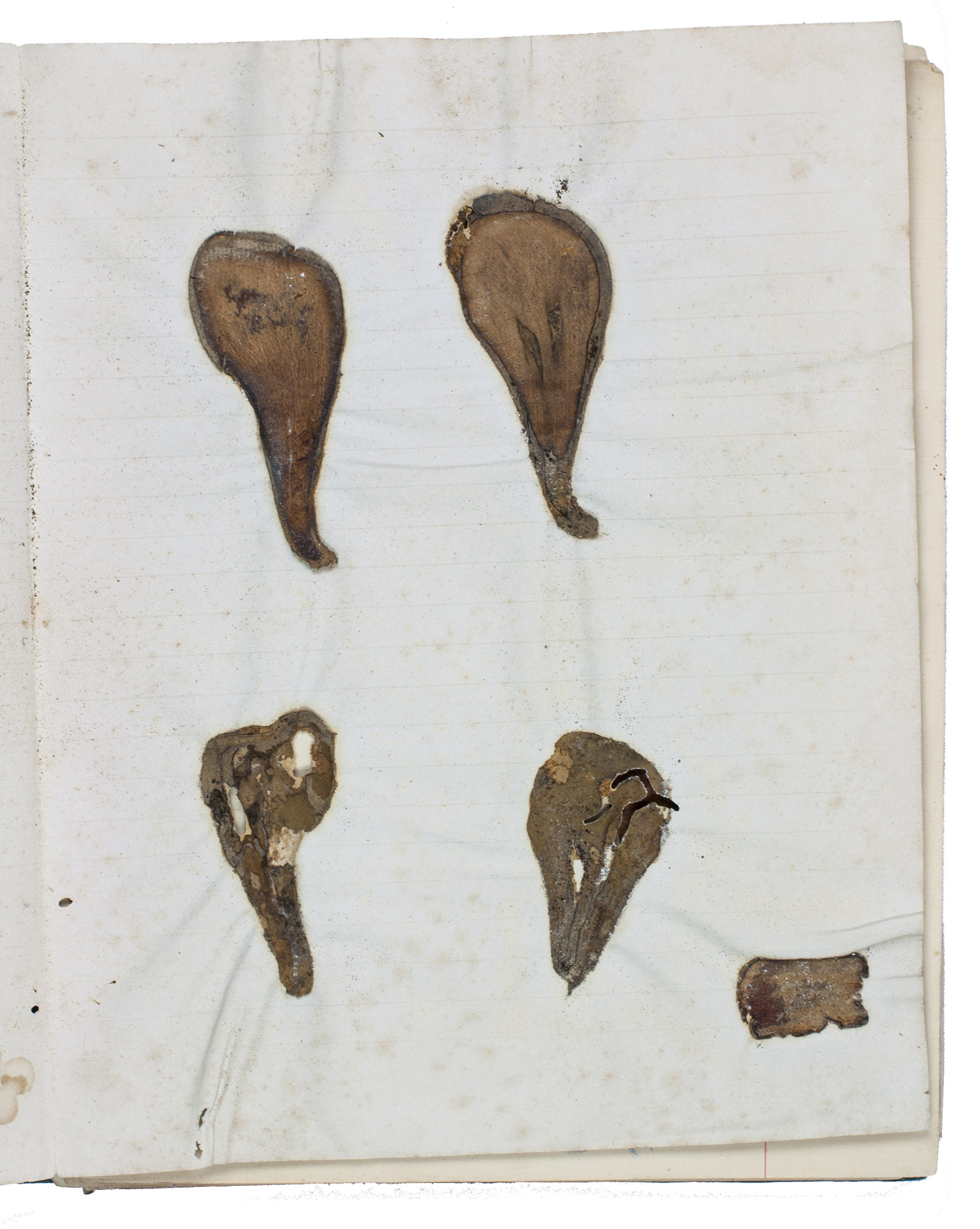 As is almost inevitable with samples like these, some parts of the samples have been lost or have come loose from the paper. Some were apparently mounted before they were completely dry and have stained the paper around the samples. But some dried sample survives for all 23 varieties. The portfolio shows some abrasions and some damage from former damp.