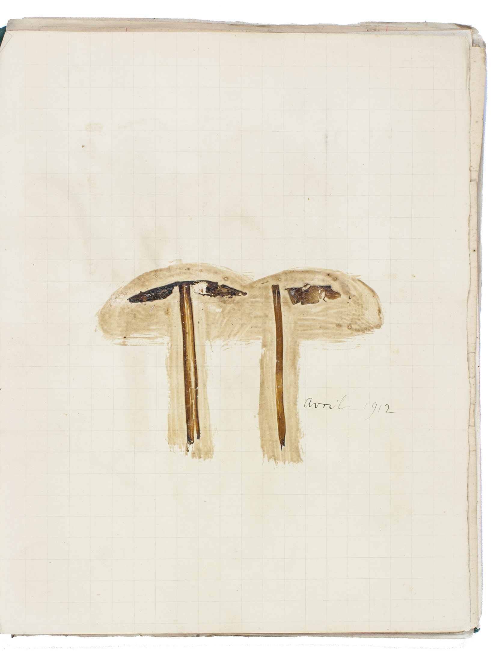 [Paris and Maison-Laffitte], 1862-1912. 4to & folded folio leaves in a 4to portfolio (23 x 18 cm). A mushroom herbarium comprising samples of 23 varieties of mushroom, each mounted on paper, with manuscript notes and an occasional pencil drawing, the two earliest mounted and written on a pre-printed form. Loosely inserted in a contemporary half green cloth portfolio. [26] ll., the 2 folio ll. folded in half.