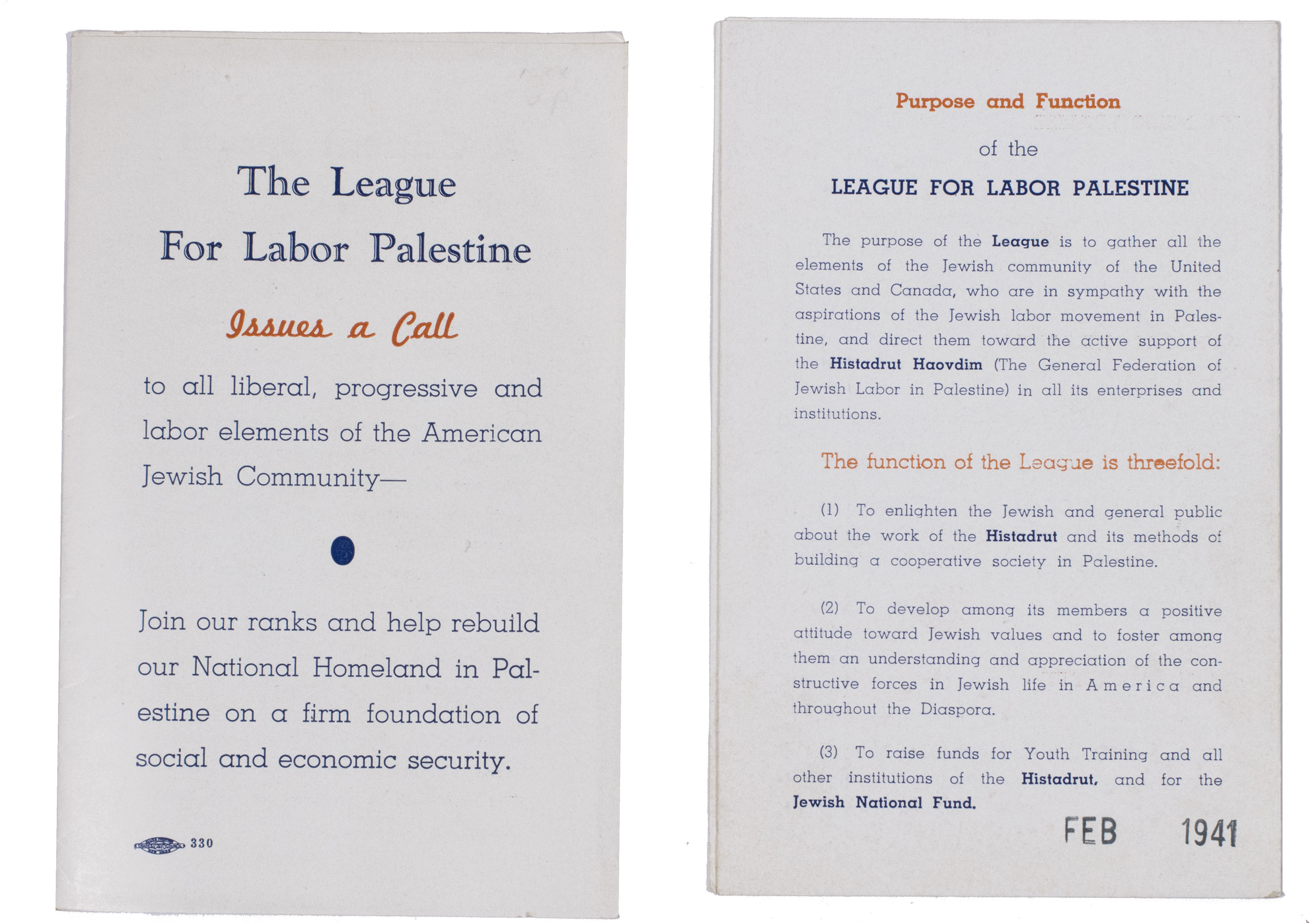 (2) THE LEAGUE FOR LABOR PALESTINE. [Call to the American Jewish community] (2x). New York, [1930s].